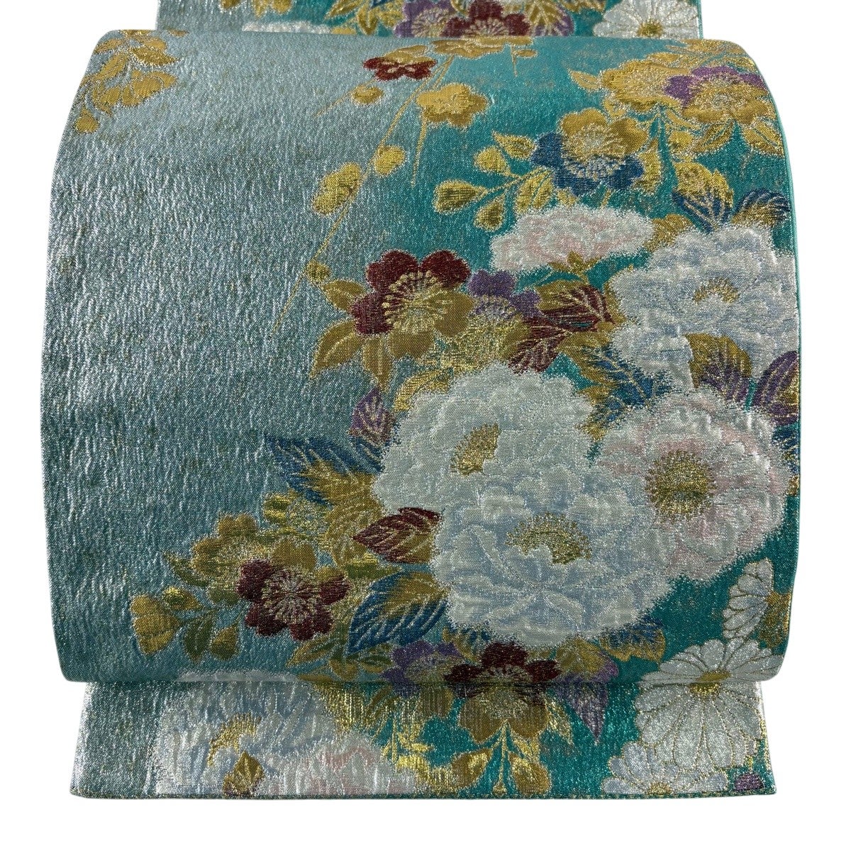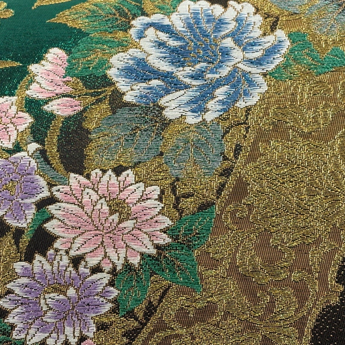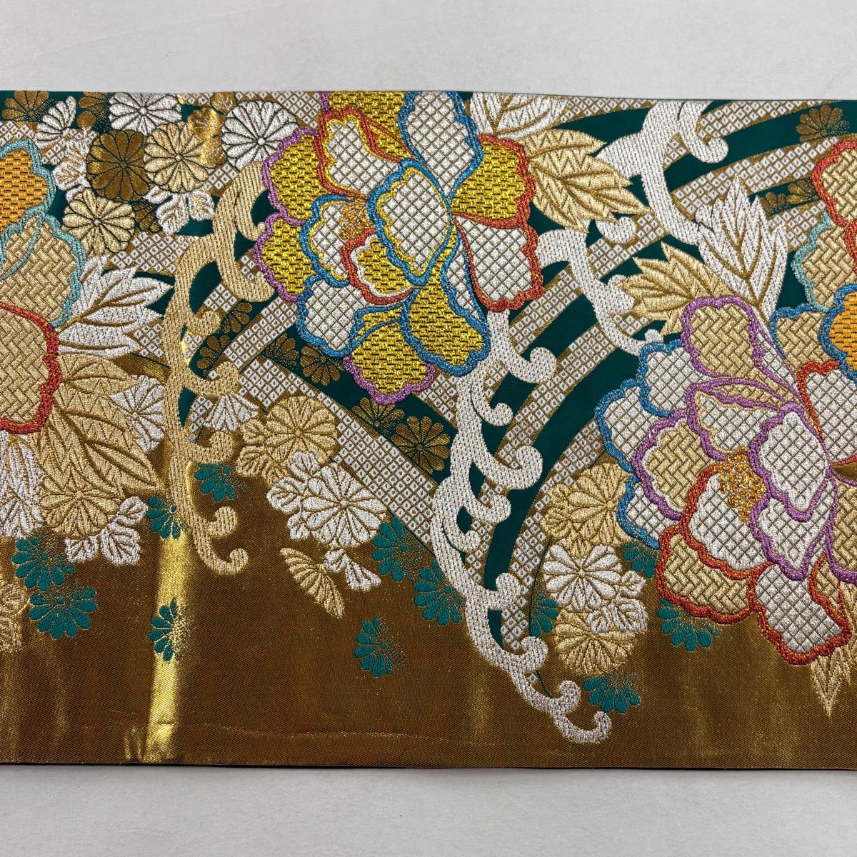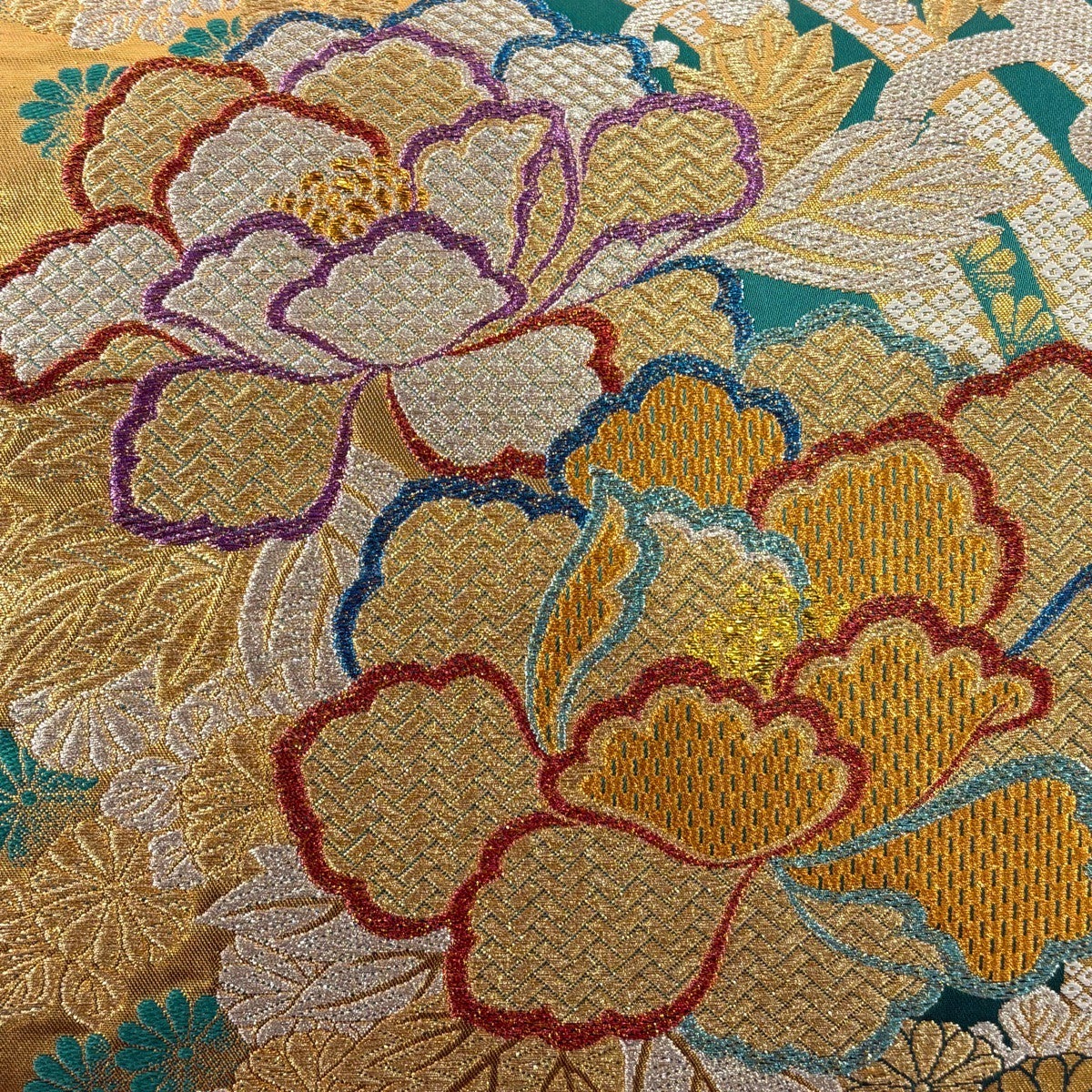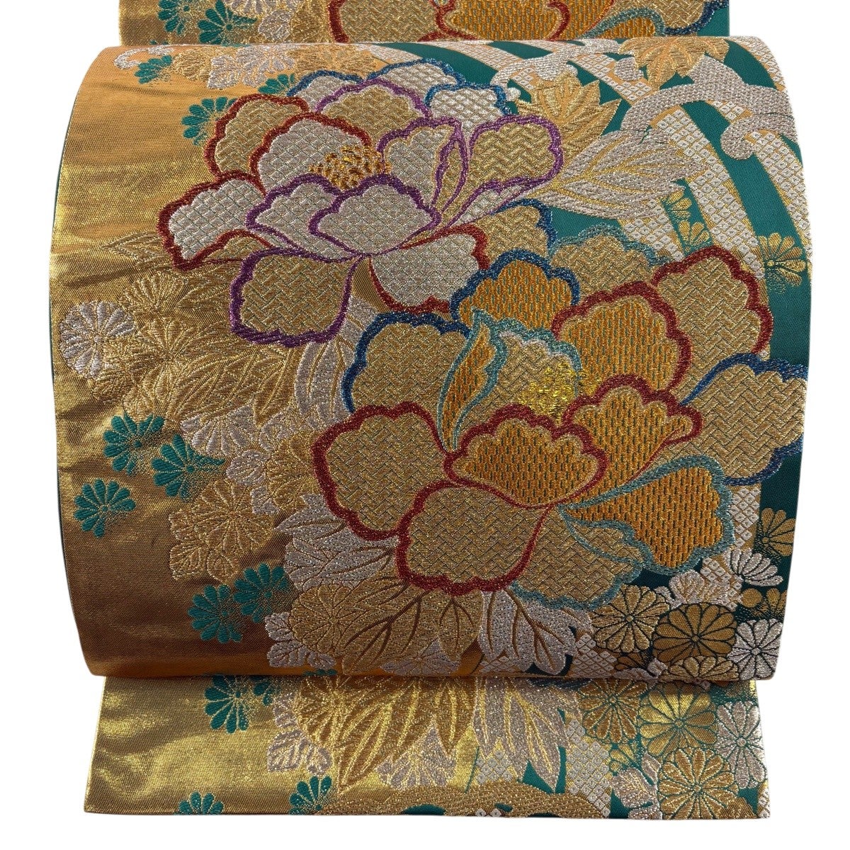 袋帯 秀品 振袖向き 牡丹 波頭 金銀糸 箔 緑 六通 正絹