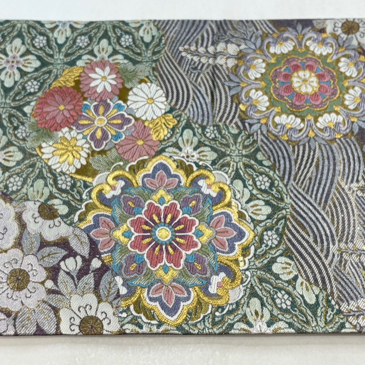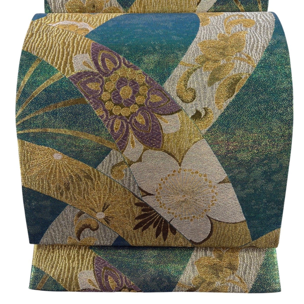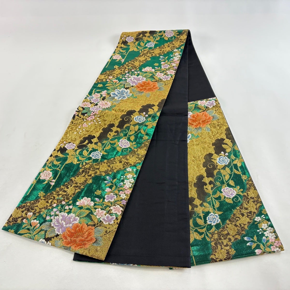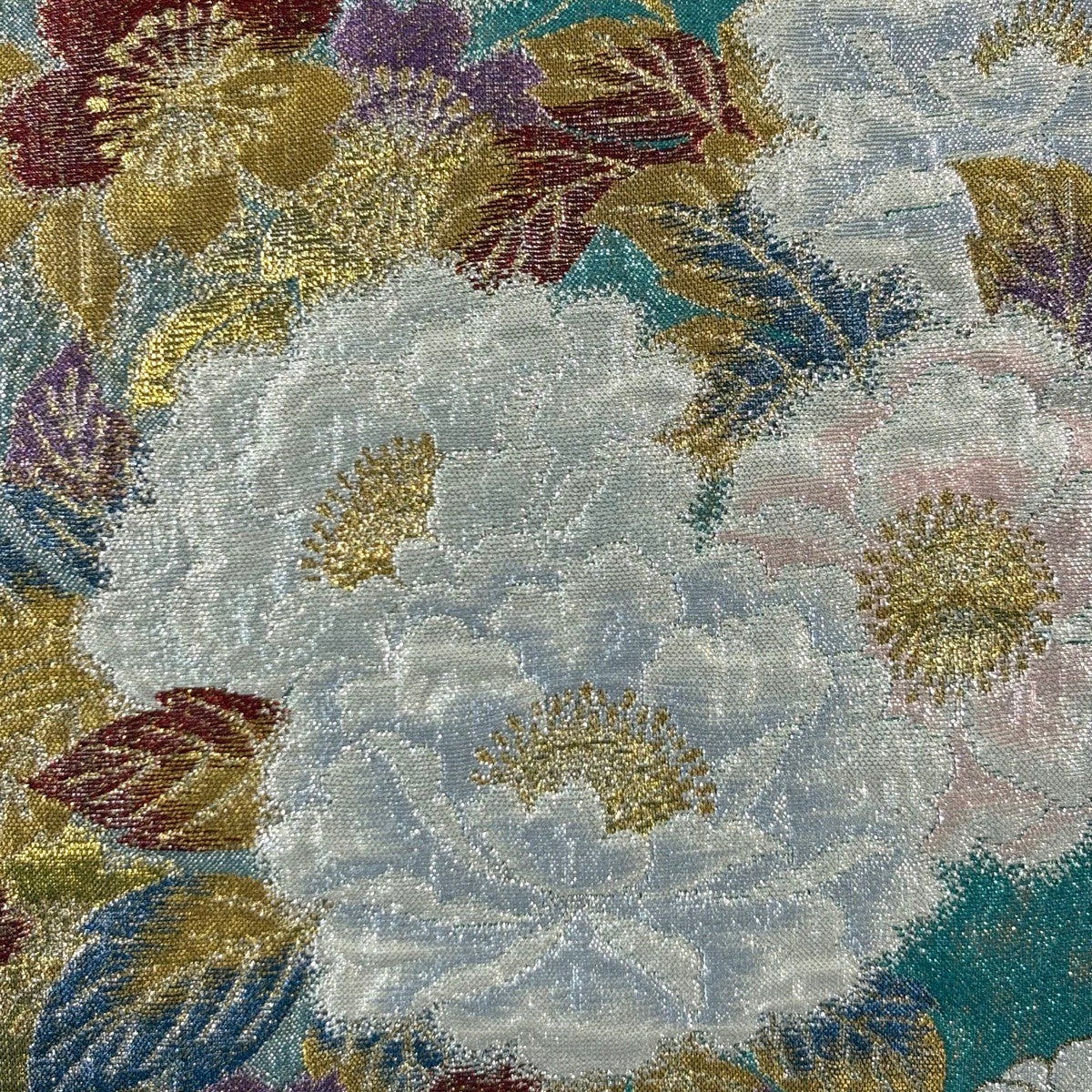 袋帯 秀品 振袖向き 牡丹 波頭 金銀糸 箔 緑 六通 正絹