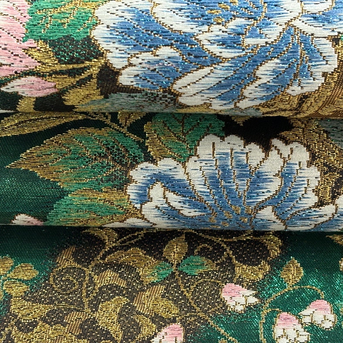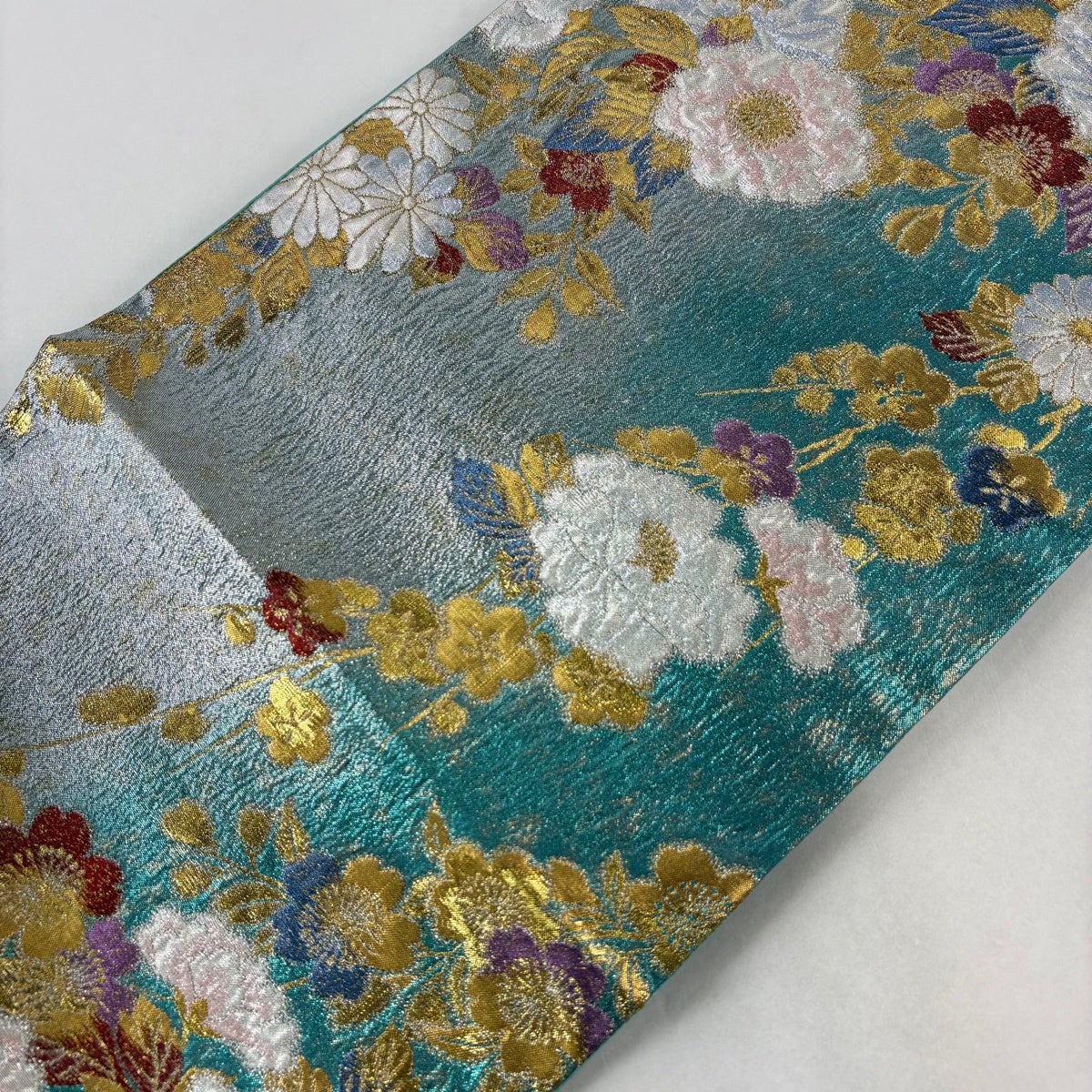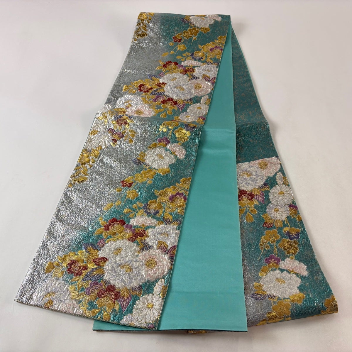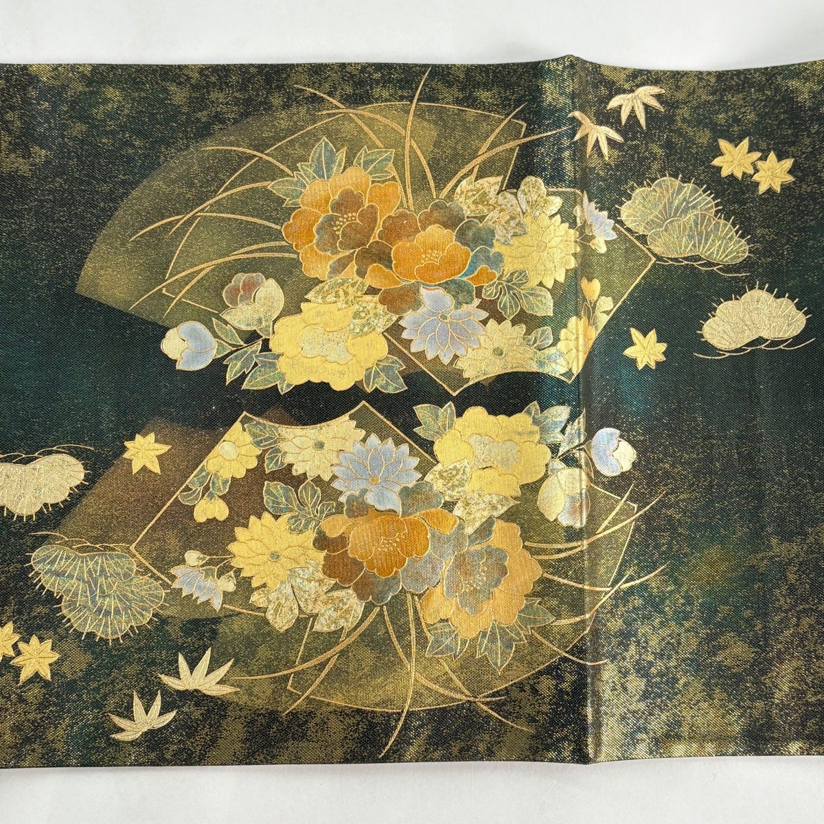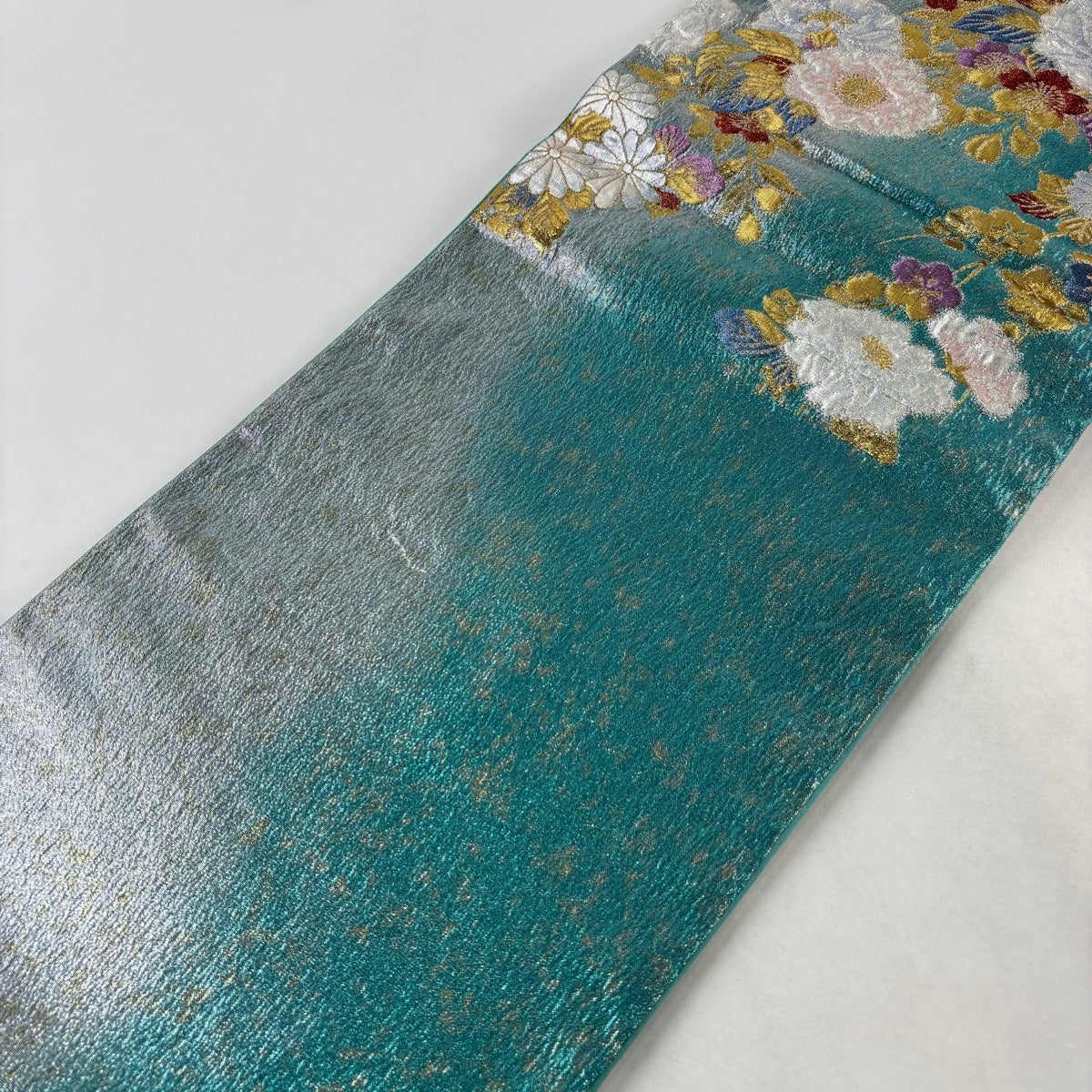 袋帯 秀品 振袖向き 牡丹 波頭 金銀糸 箔 緑 六通 正絹