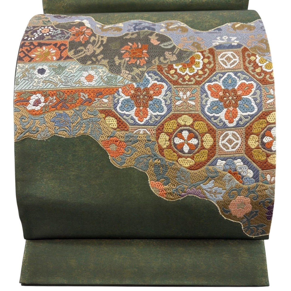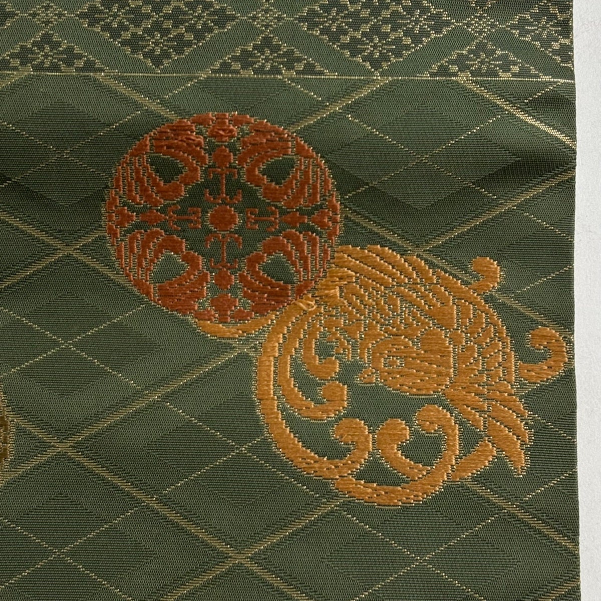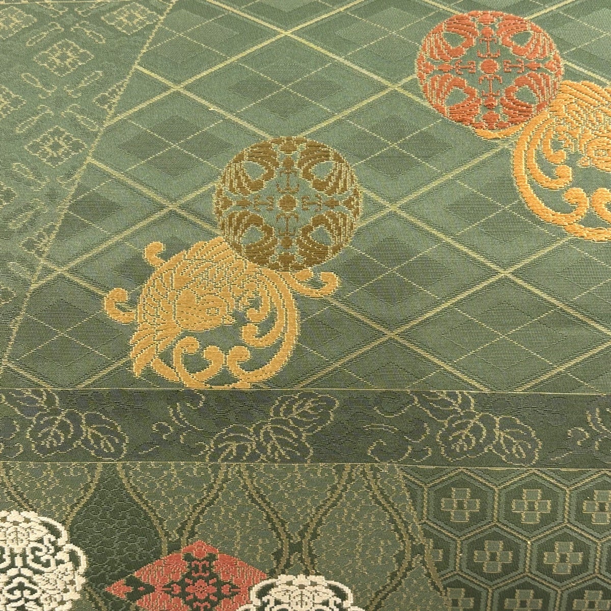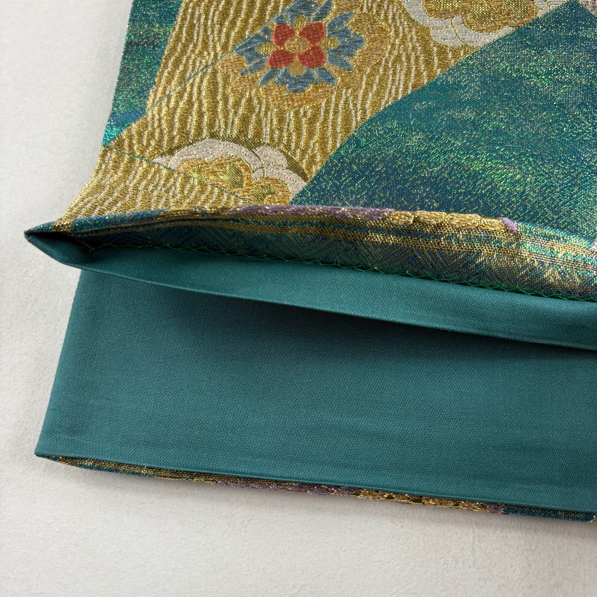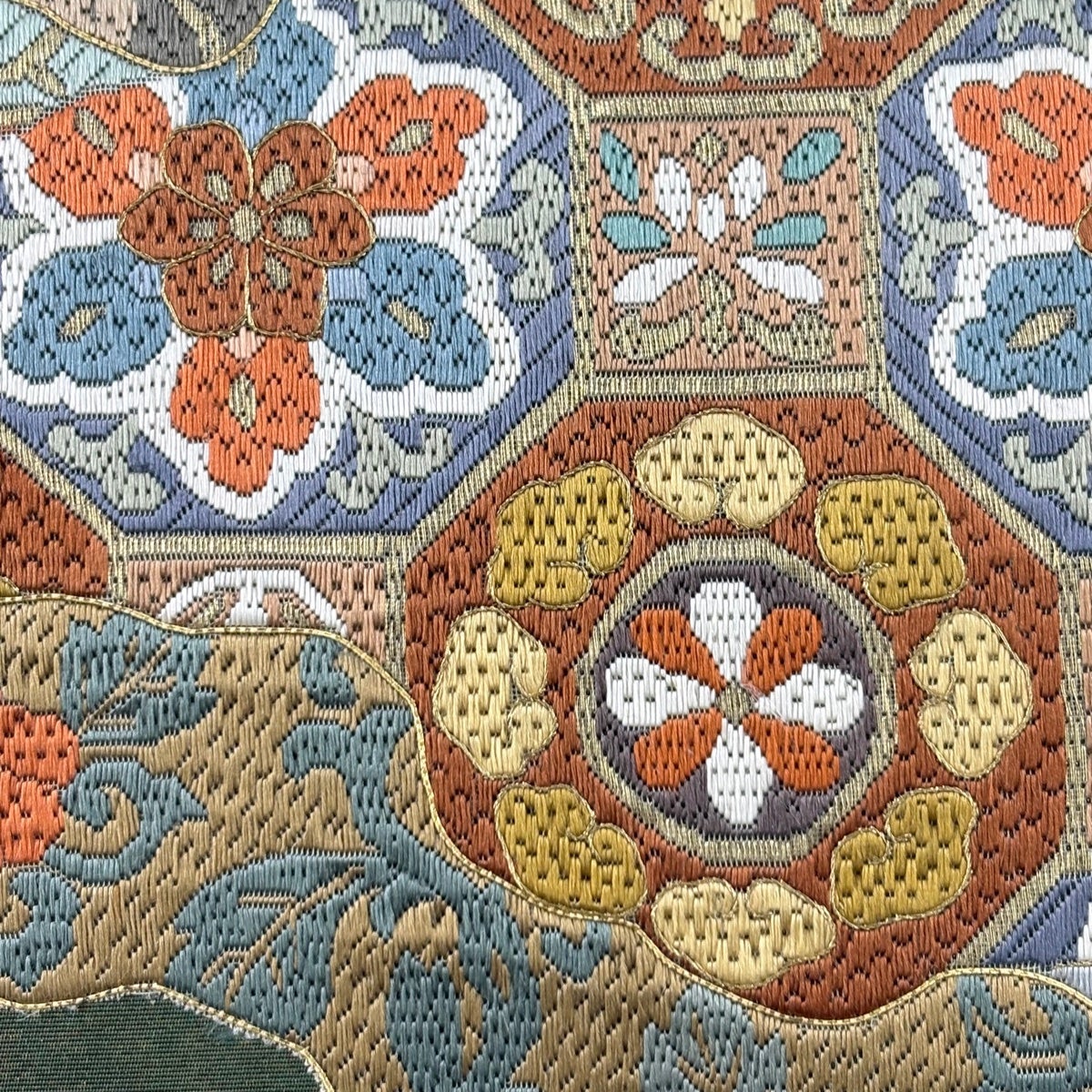 袋帯 秀品 蜀江華文 草花 刺繍 金糸 緑 お太鼓柄 正絹