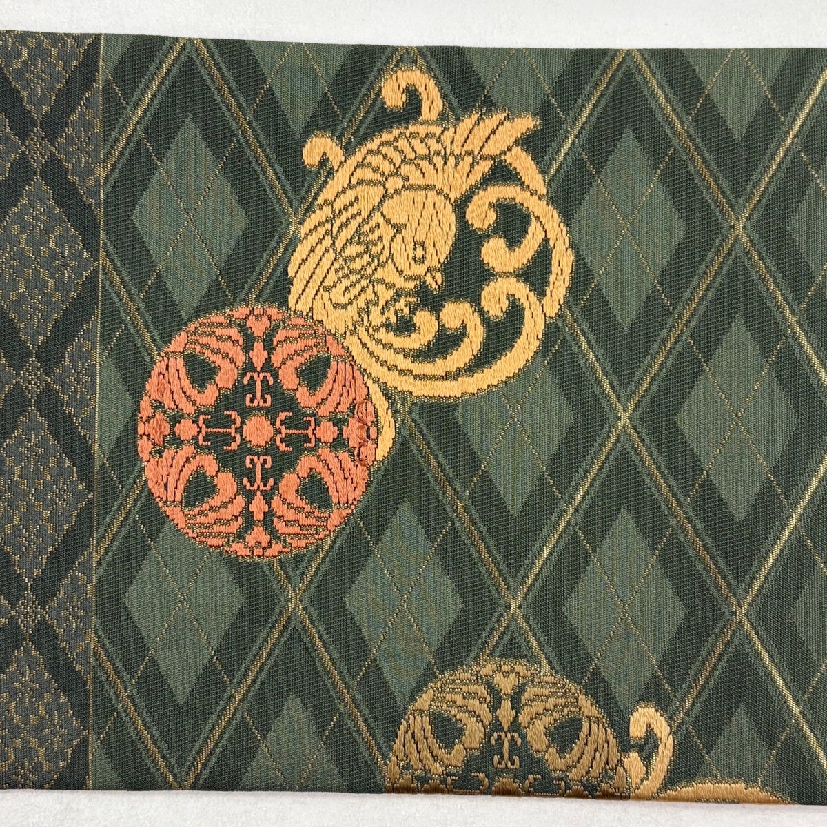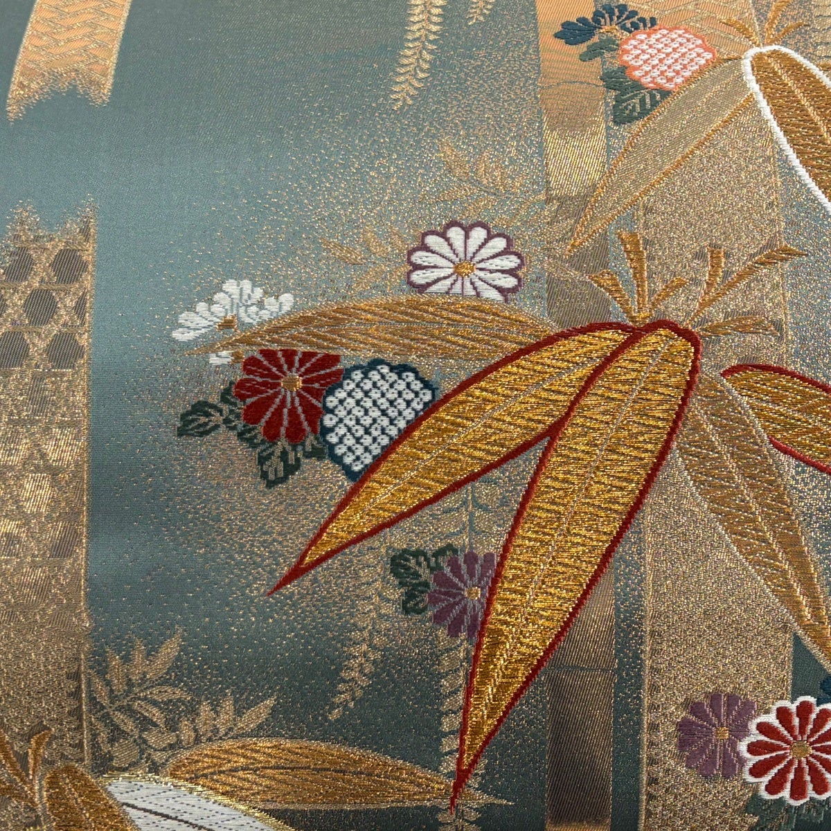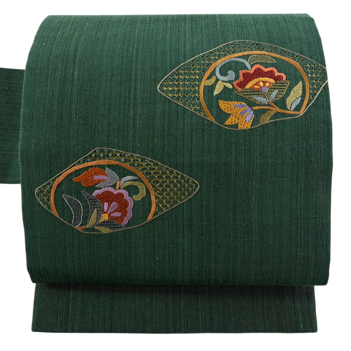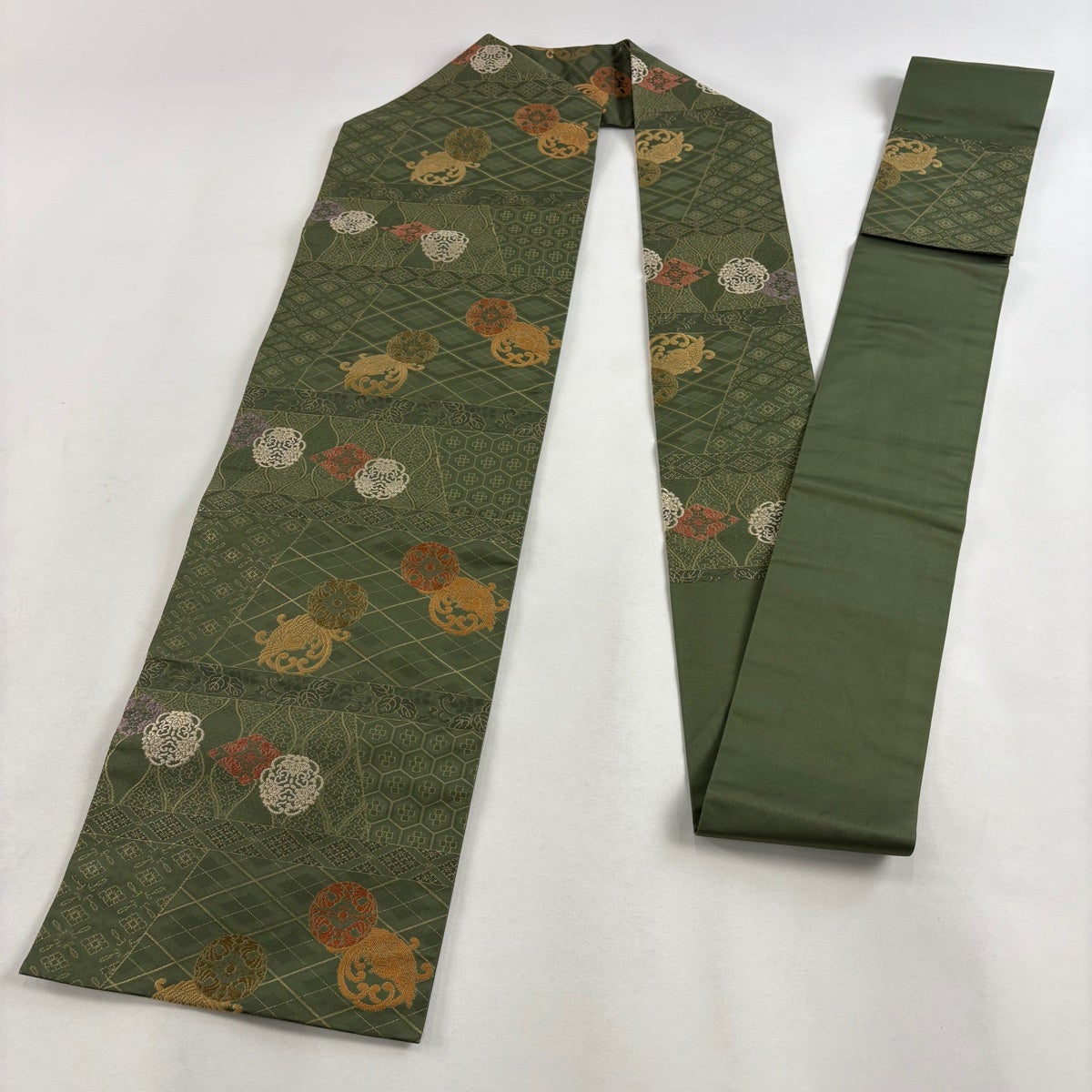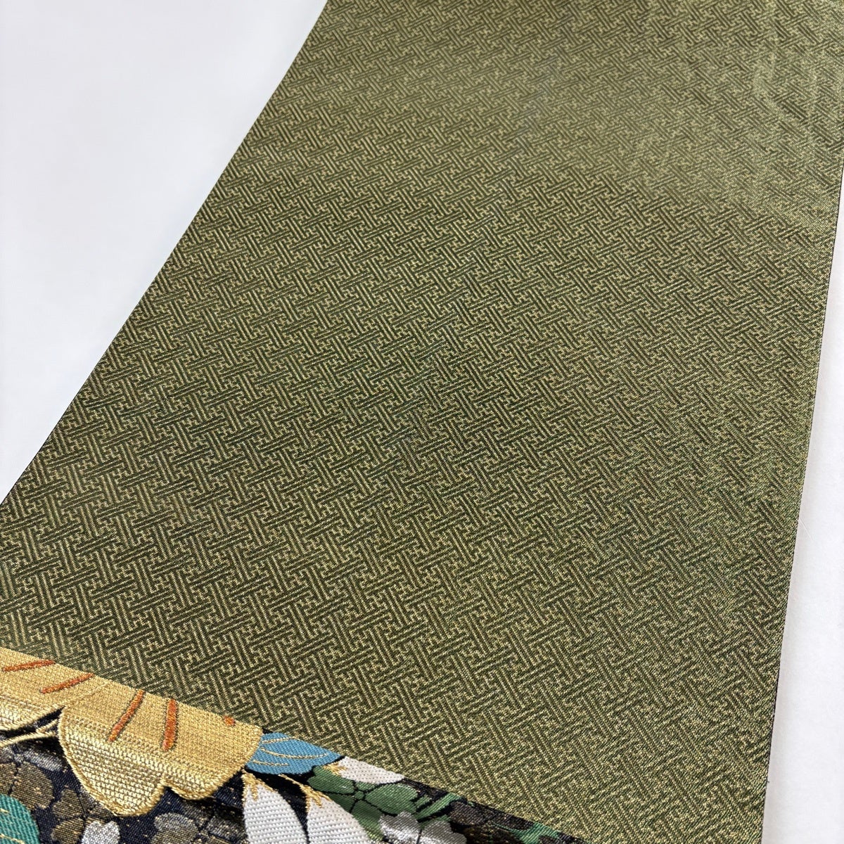 袋帯 秀品 蜀江華文 草花 刺繍 金糸 緑 お太鼓柄 正絹