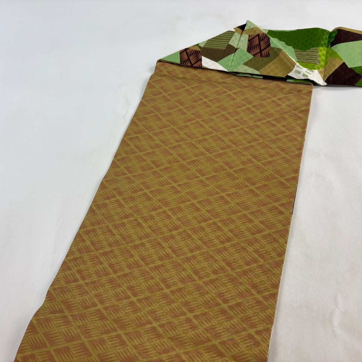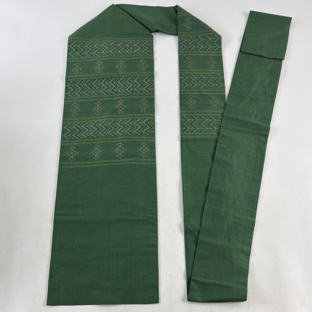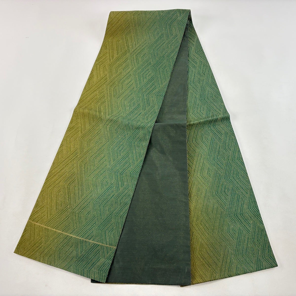 【美品】 名古屋帯 優品 紬地 八寸名古屋帯 幾何学模様 緑 正絹