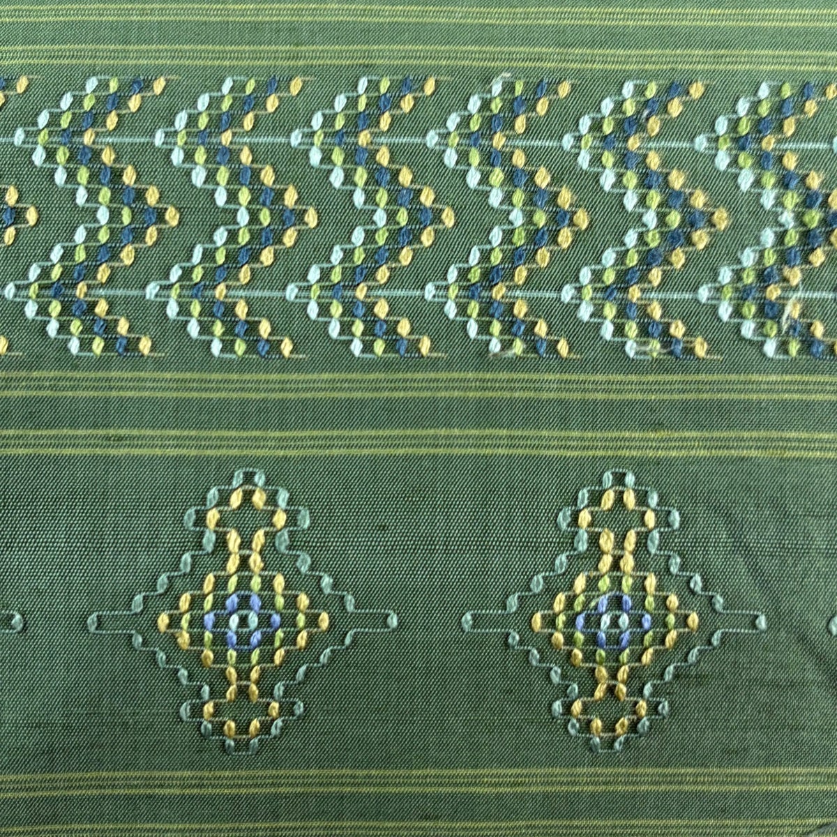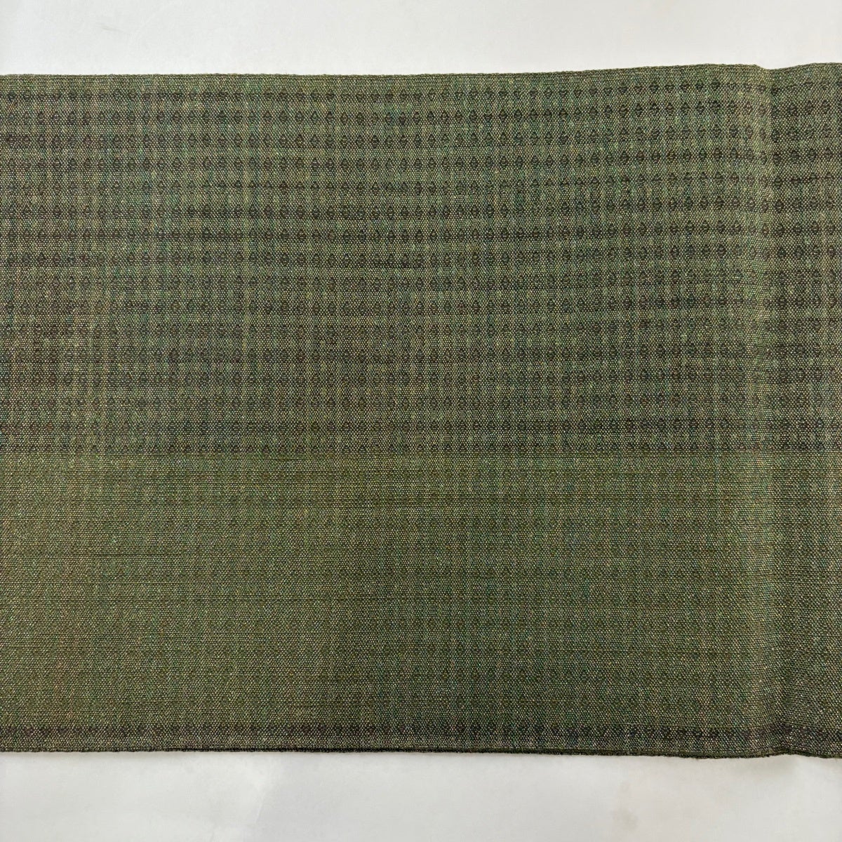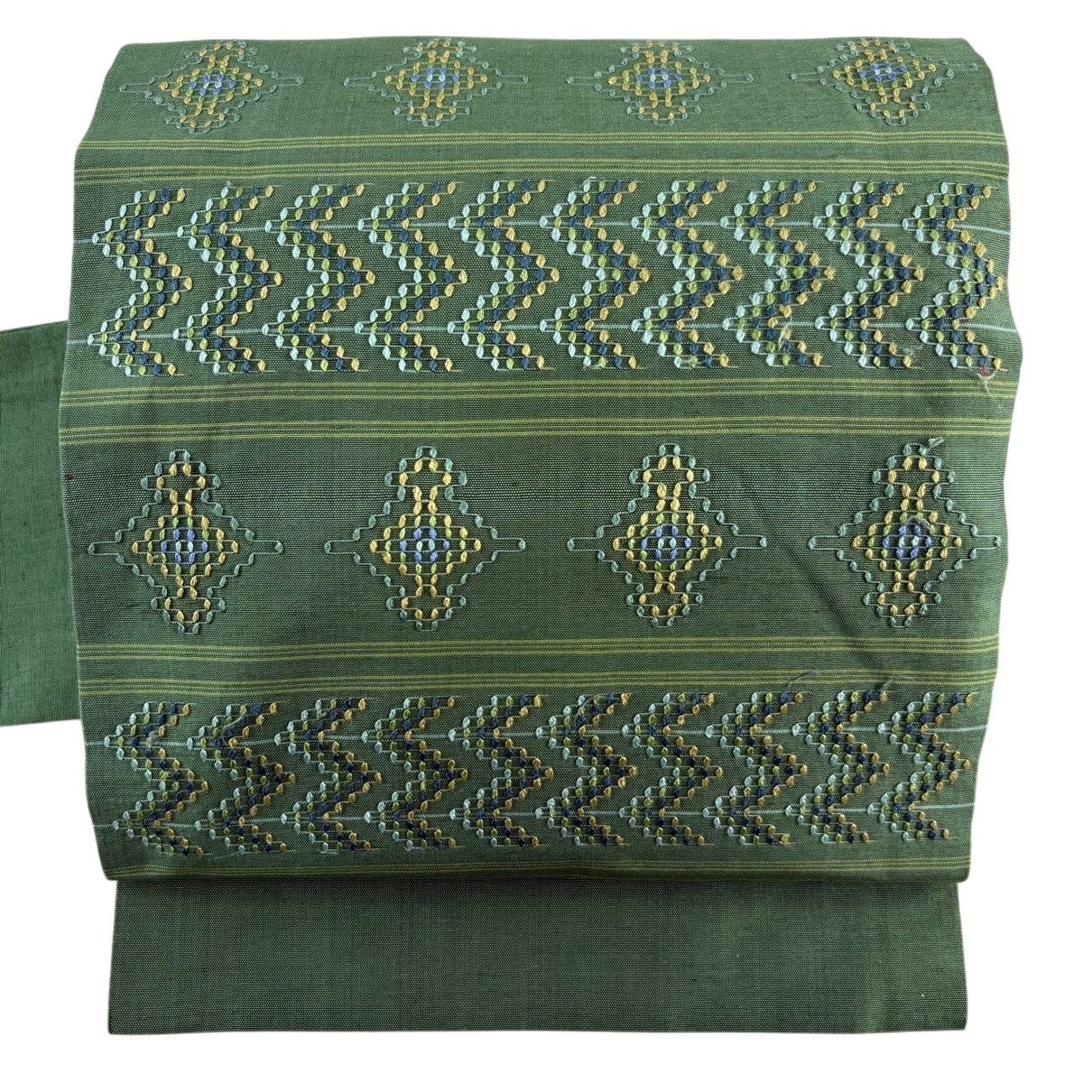 【美品】 名古屋帯 優品 紬地 八寸名古屋帯 幾何学模様 緑 正絹