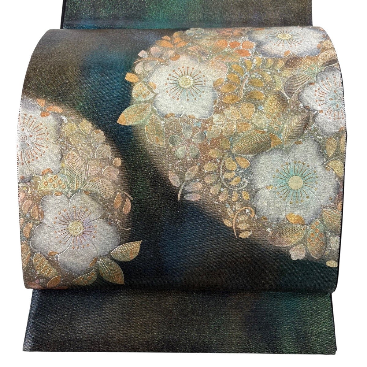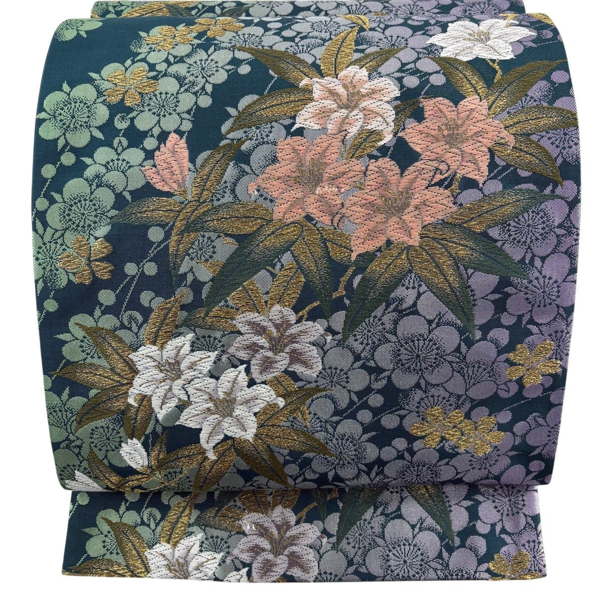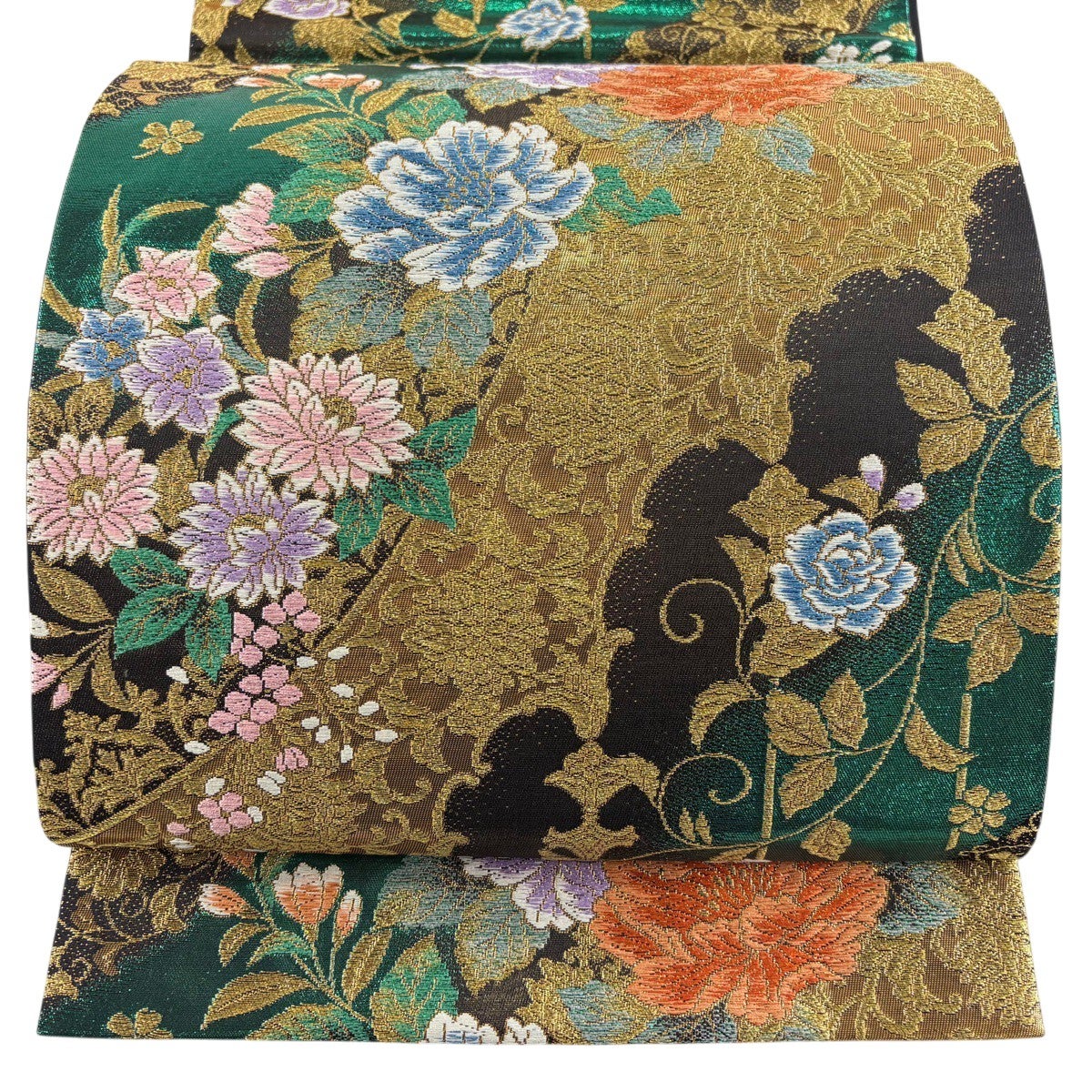 袋帯 秀品 振袖向き 草花 花唐草 金糸 箔 緑 六通 正絹