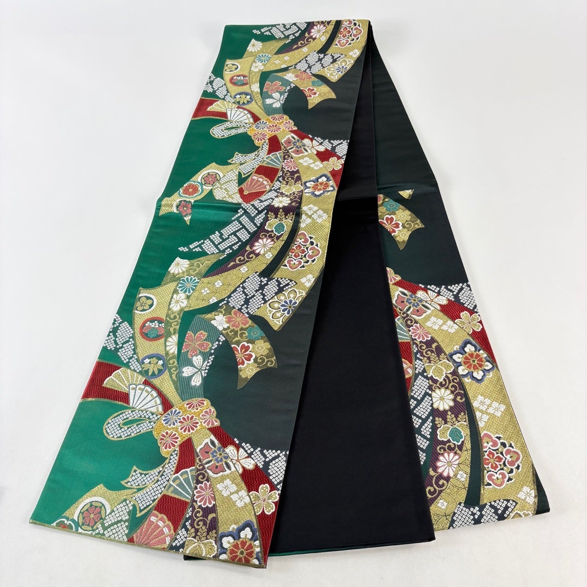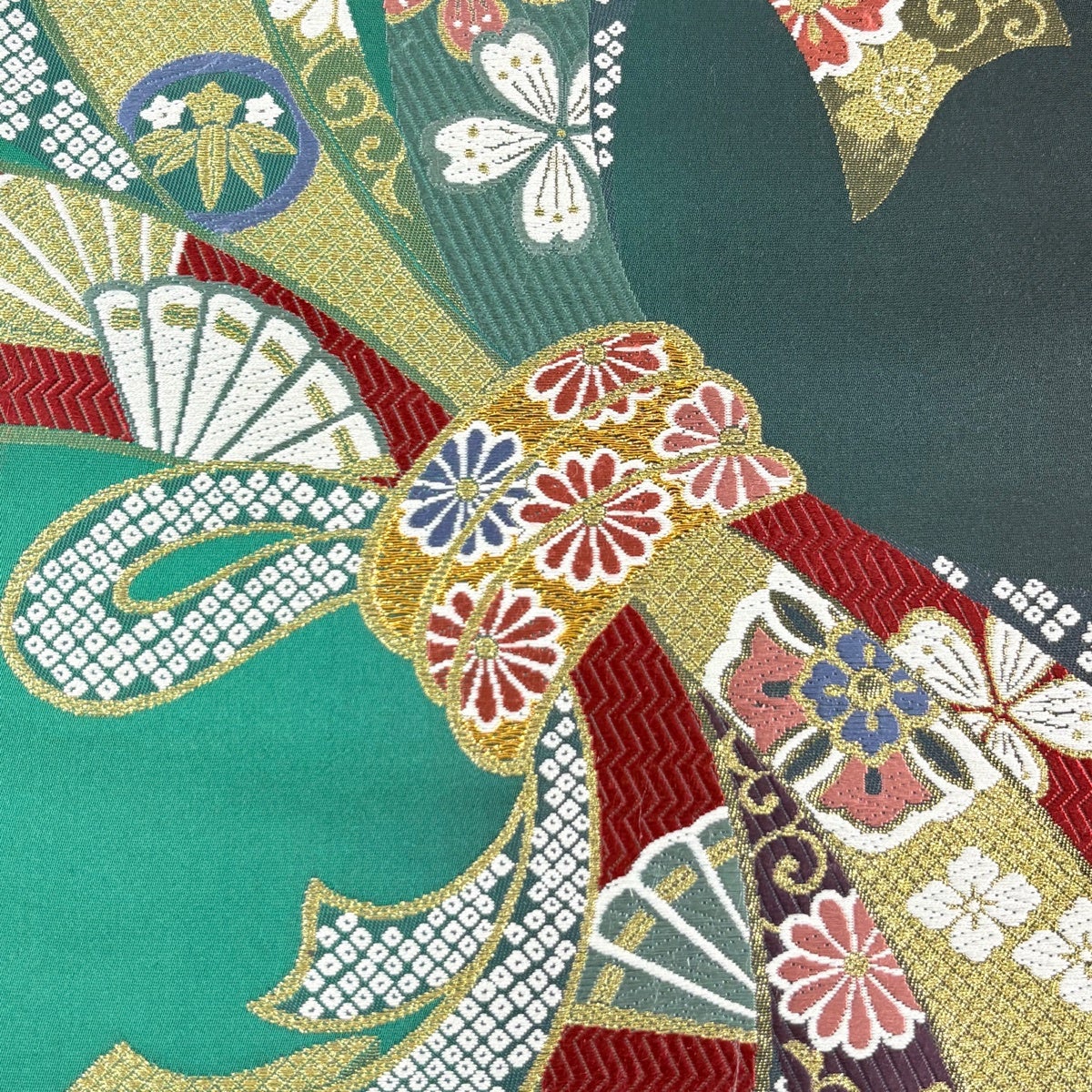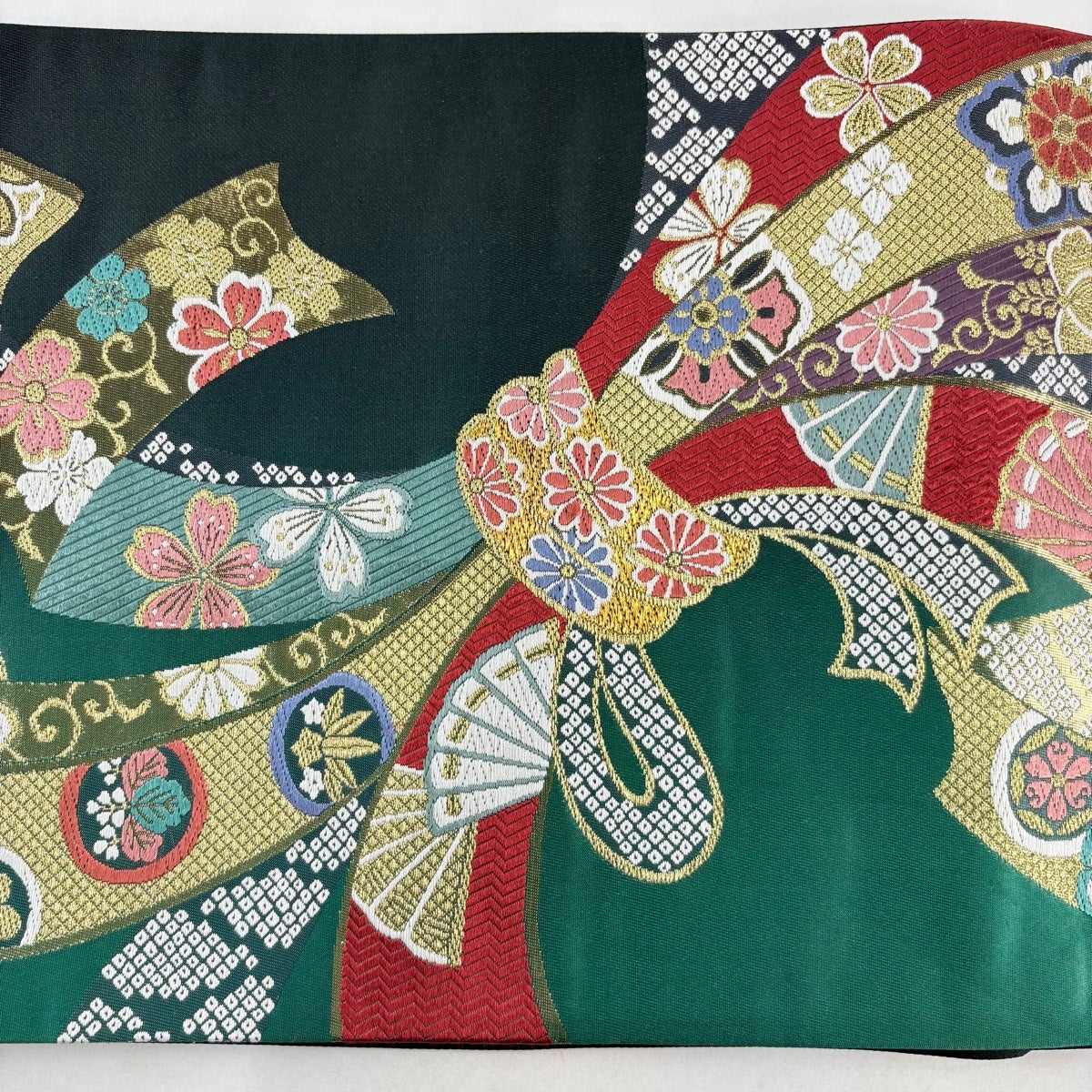 【美品】 袋帯 秀品 束ね熨斗 菊 金糸 箔 緑 六通 正絹