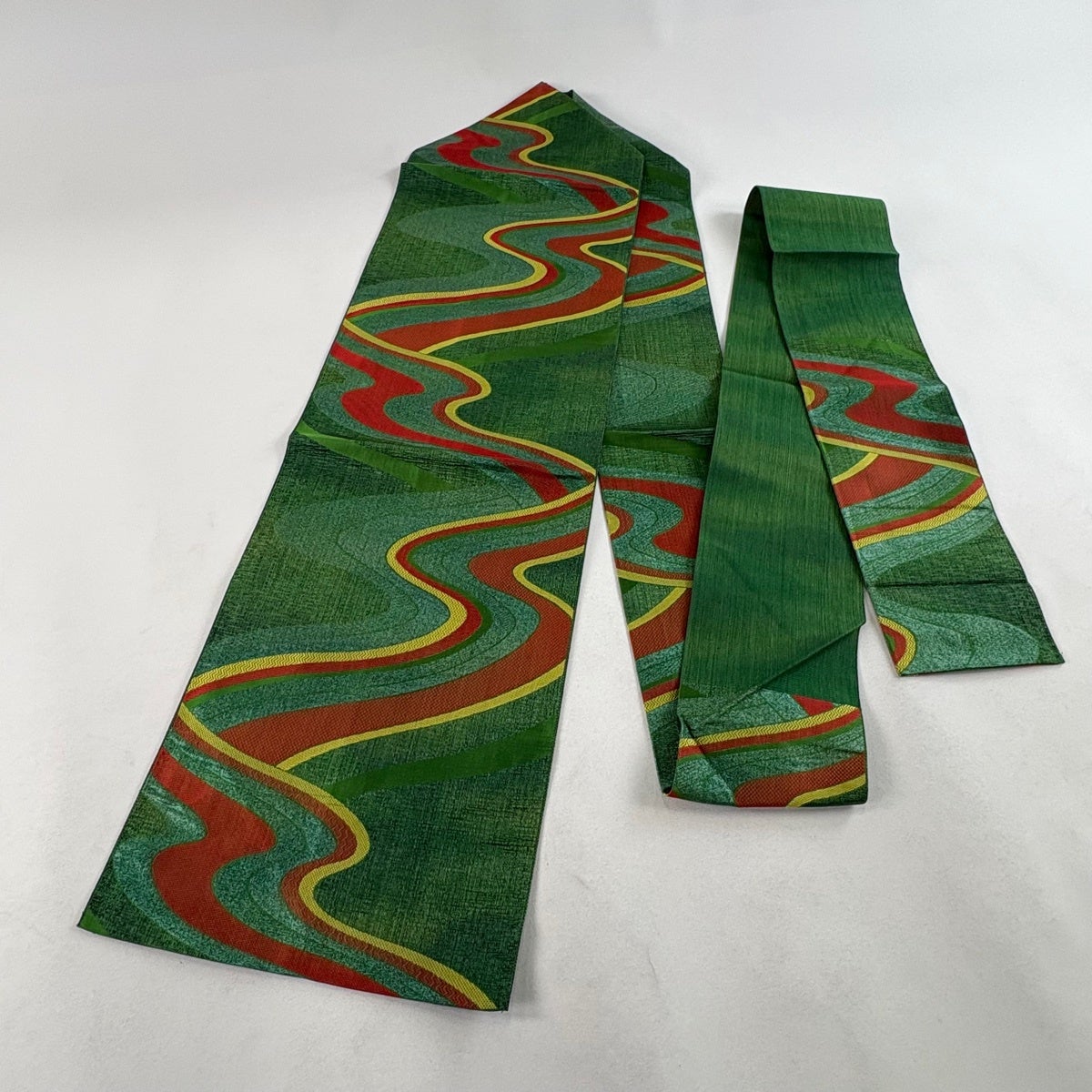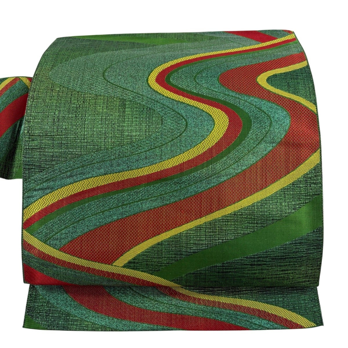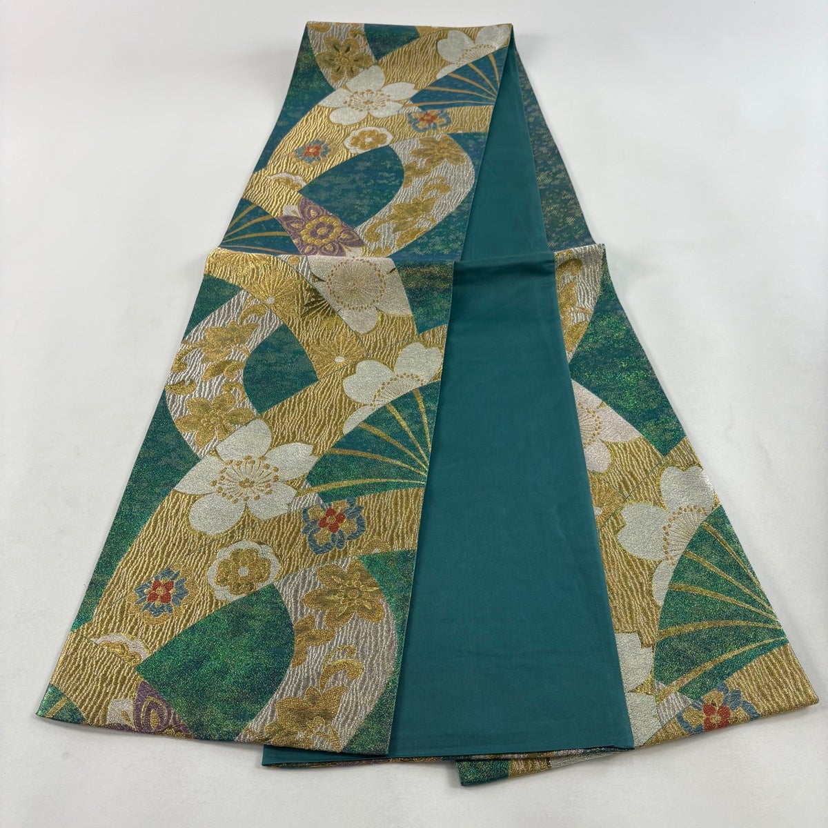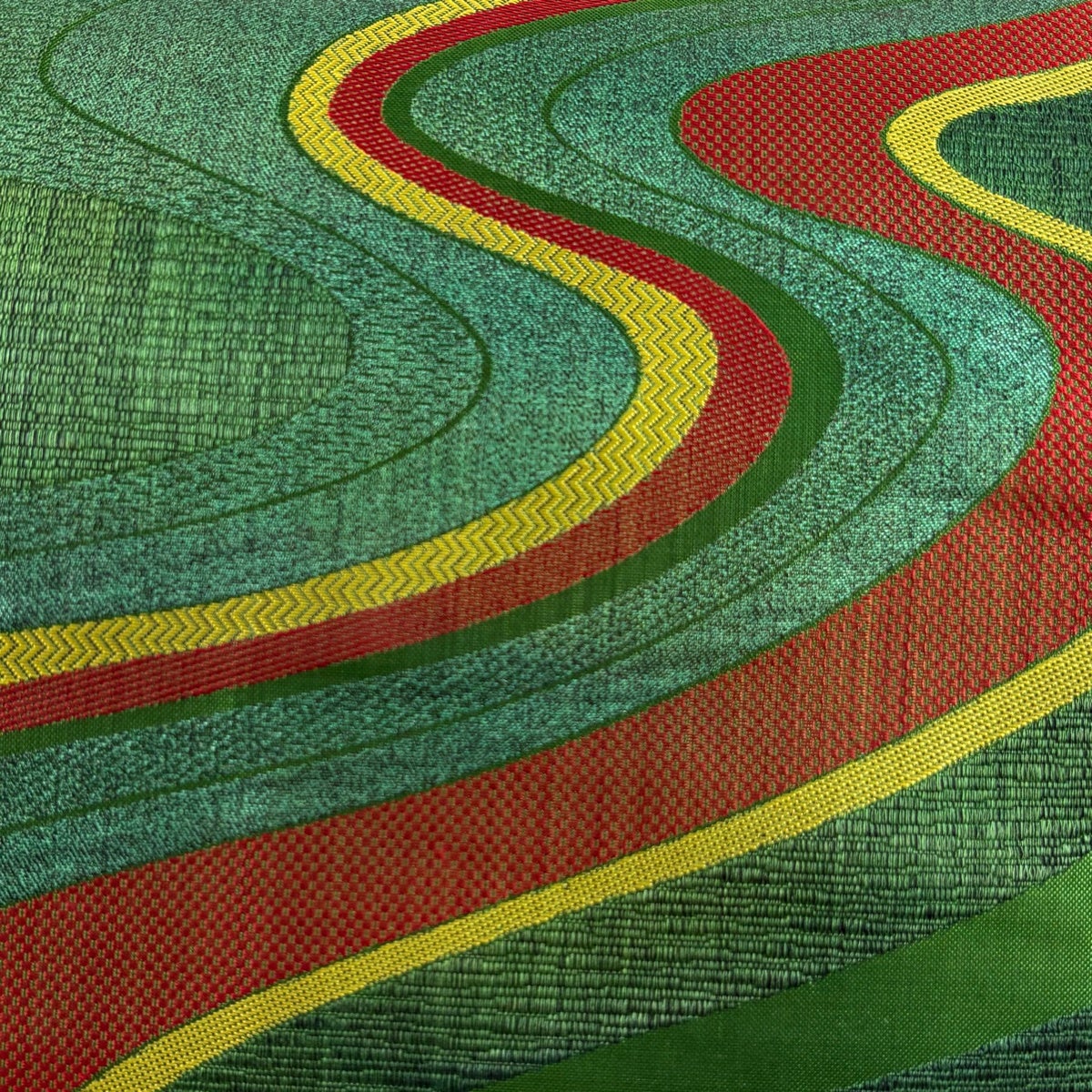 【美品】 袋帯 秀品 振袖向き 華文 波 金糸 箔 緑 六通 正絹