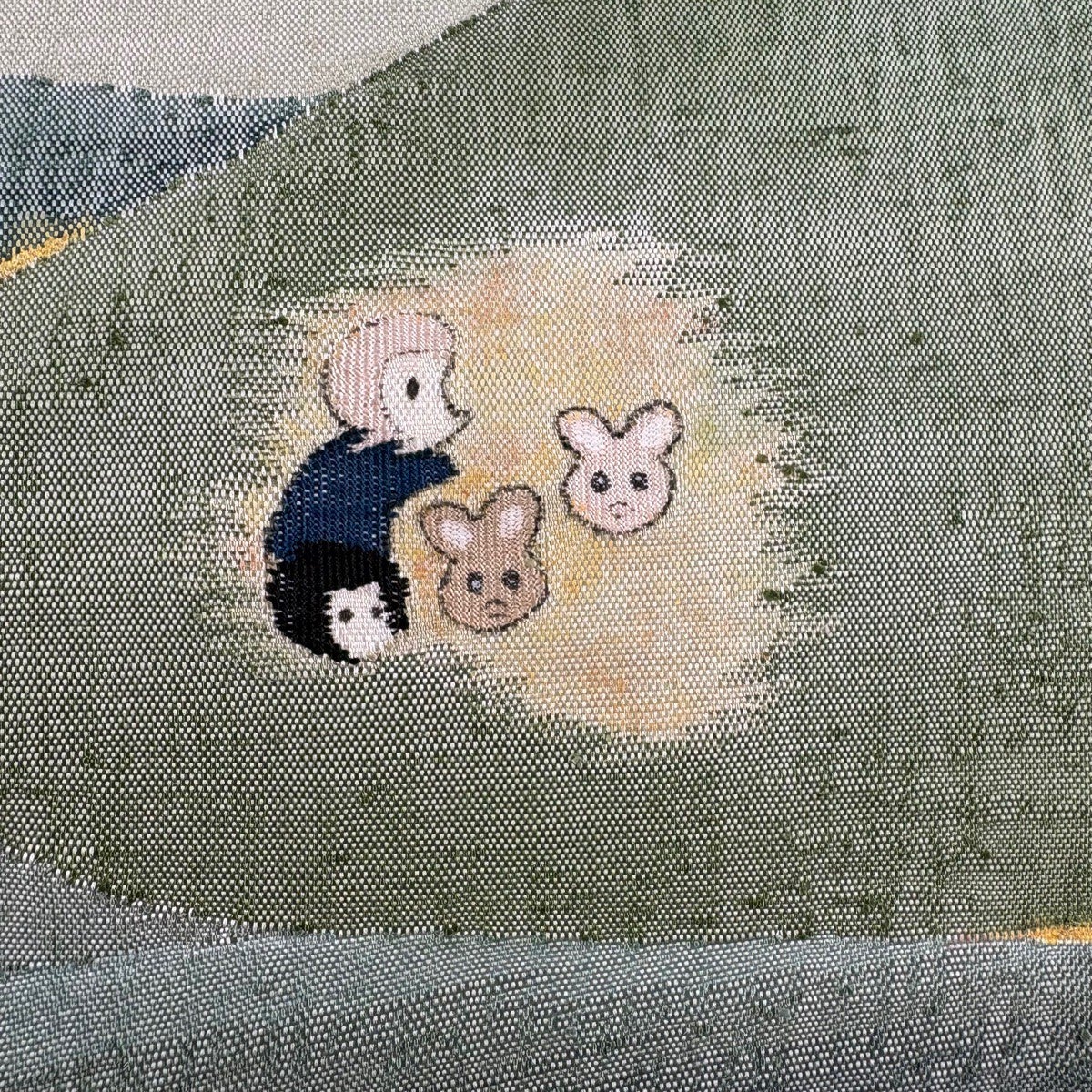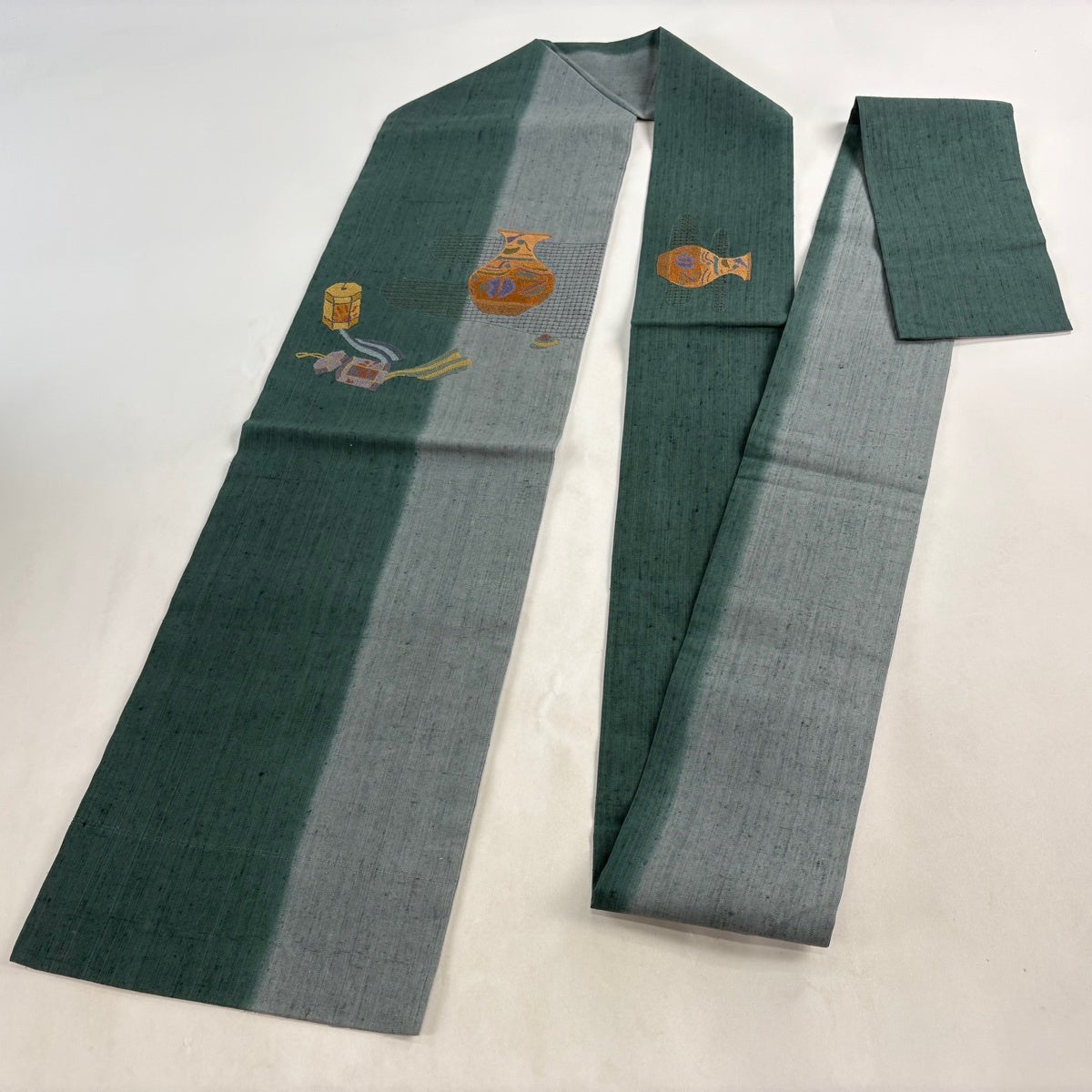 【美品】 名古屋帯 秀品 紬地 器物 印籠 相良刺繍 緑 正絹
