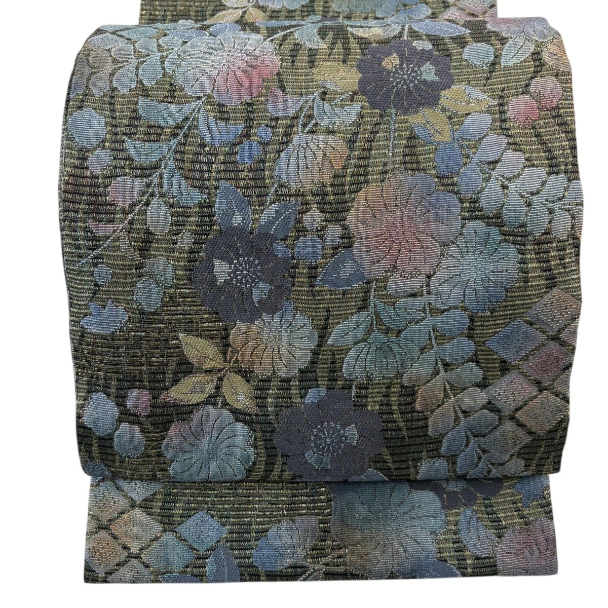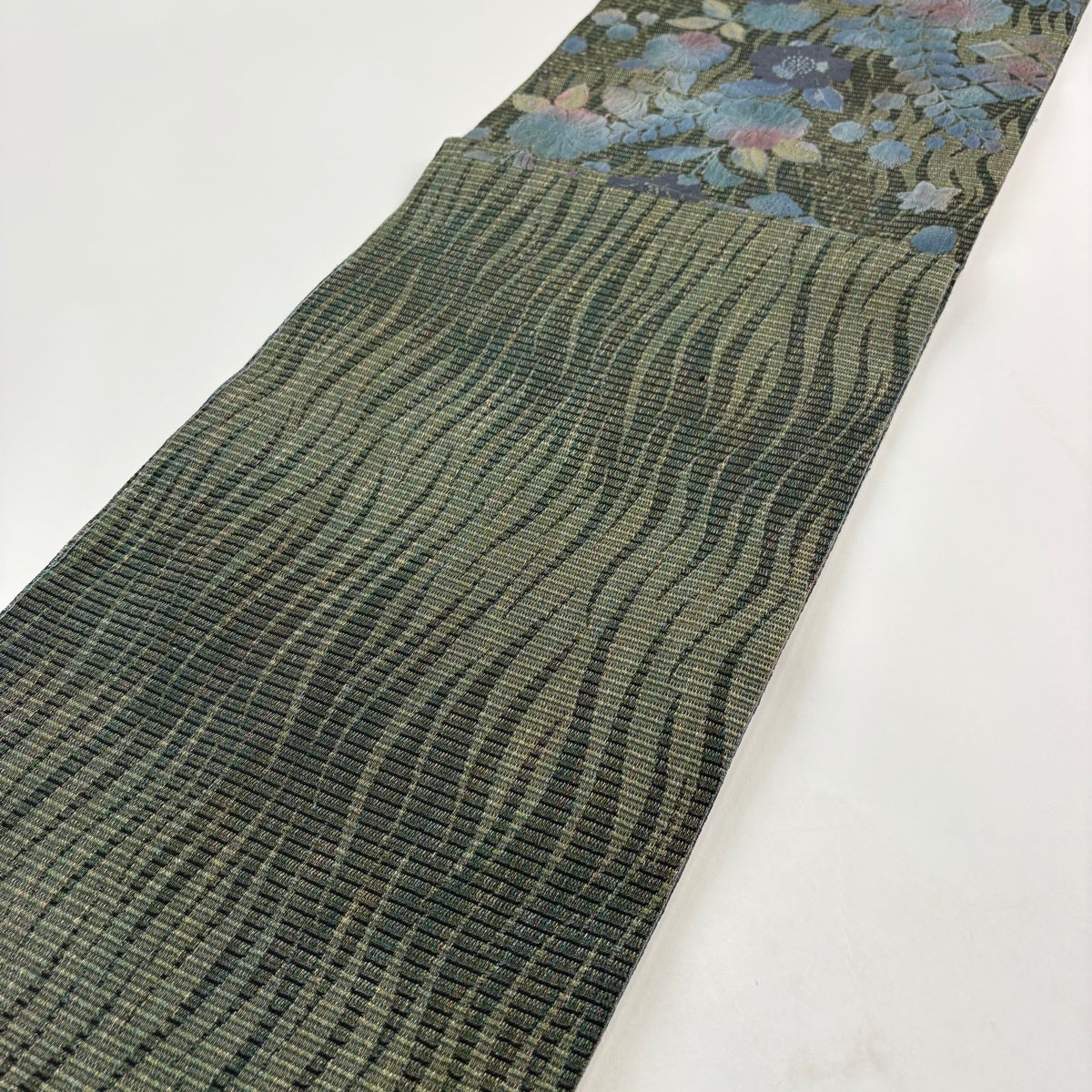 30%OFF 袋帯 名品 堀省平 落款あり 草花 横段 金糸 箔 緑 お太鼓柄 正絹 K30