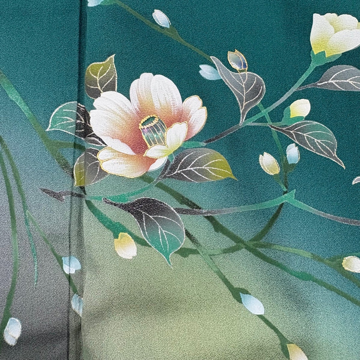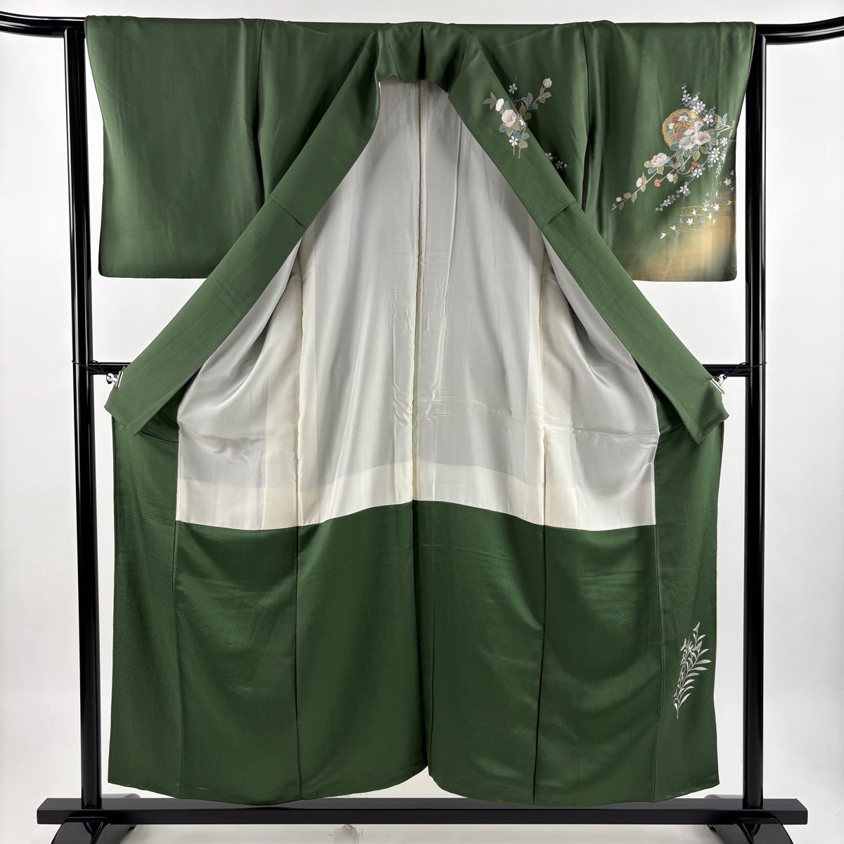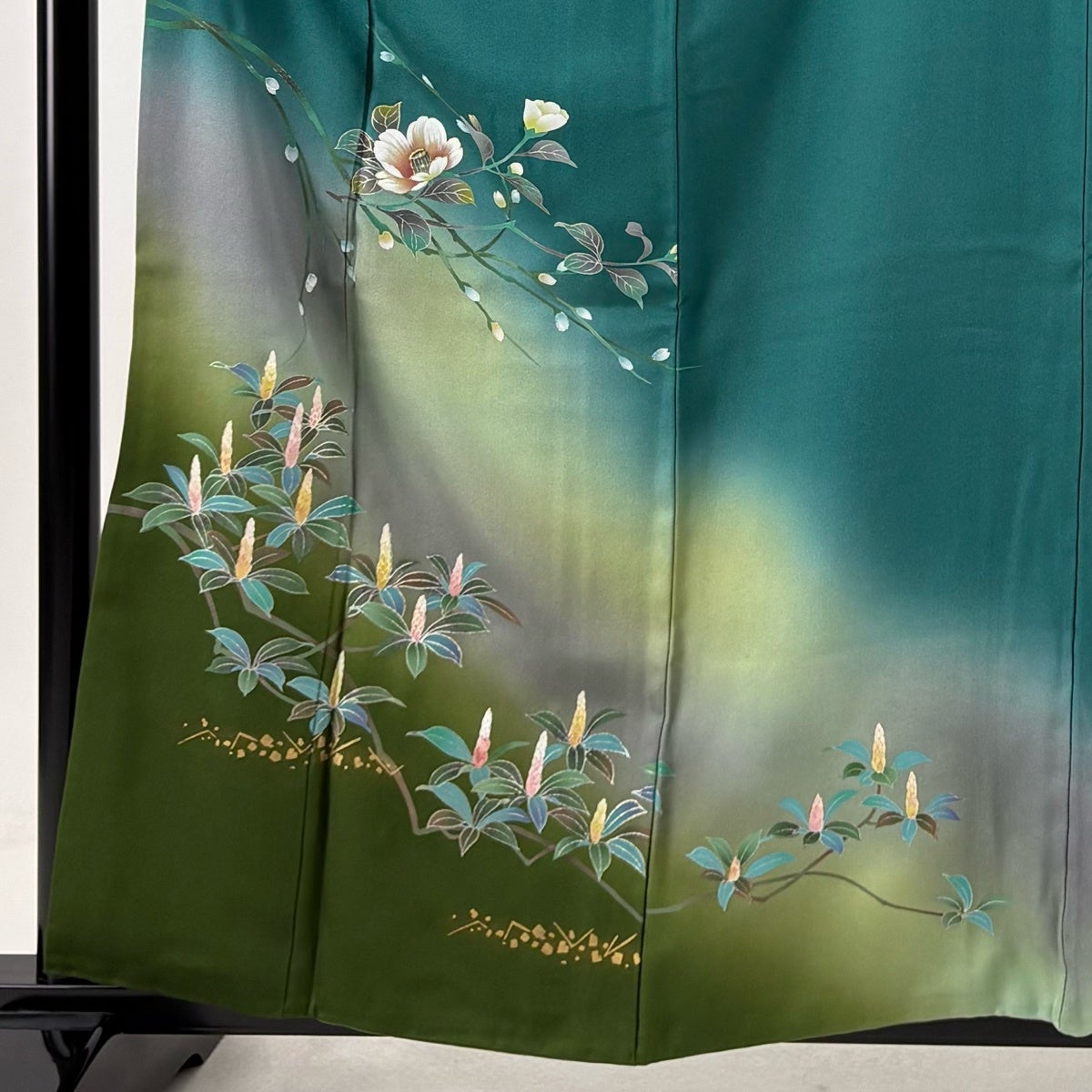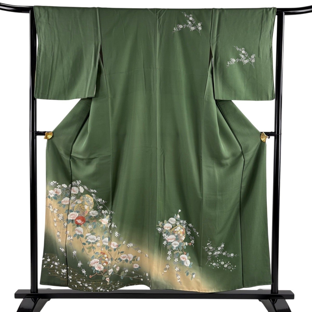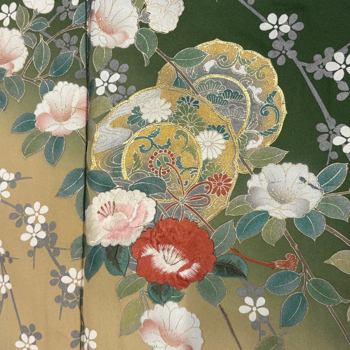 50%OFF 振袖 身丈162.5cm 裄丈66cm M 袷 花丸文 桜 緑 正絹 秀品 K50