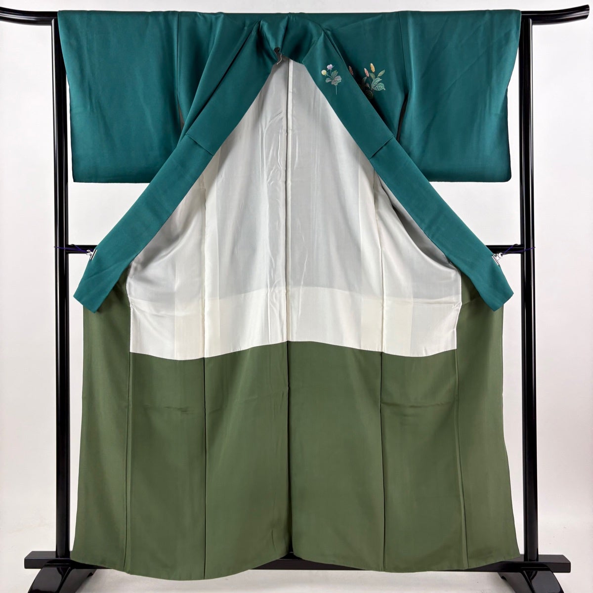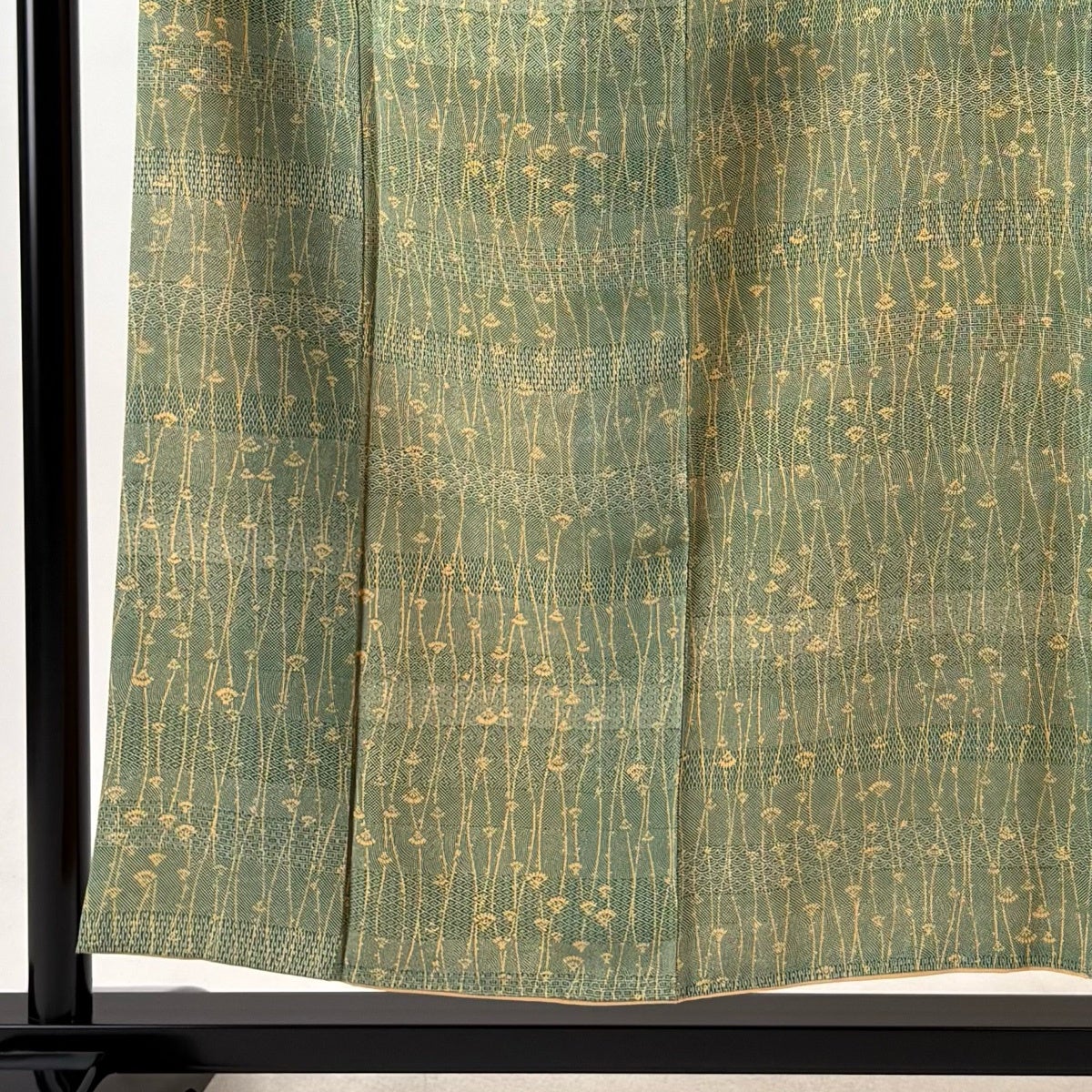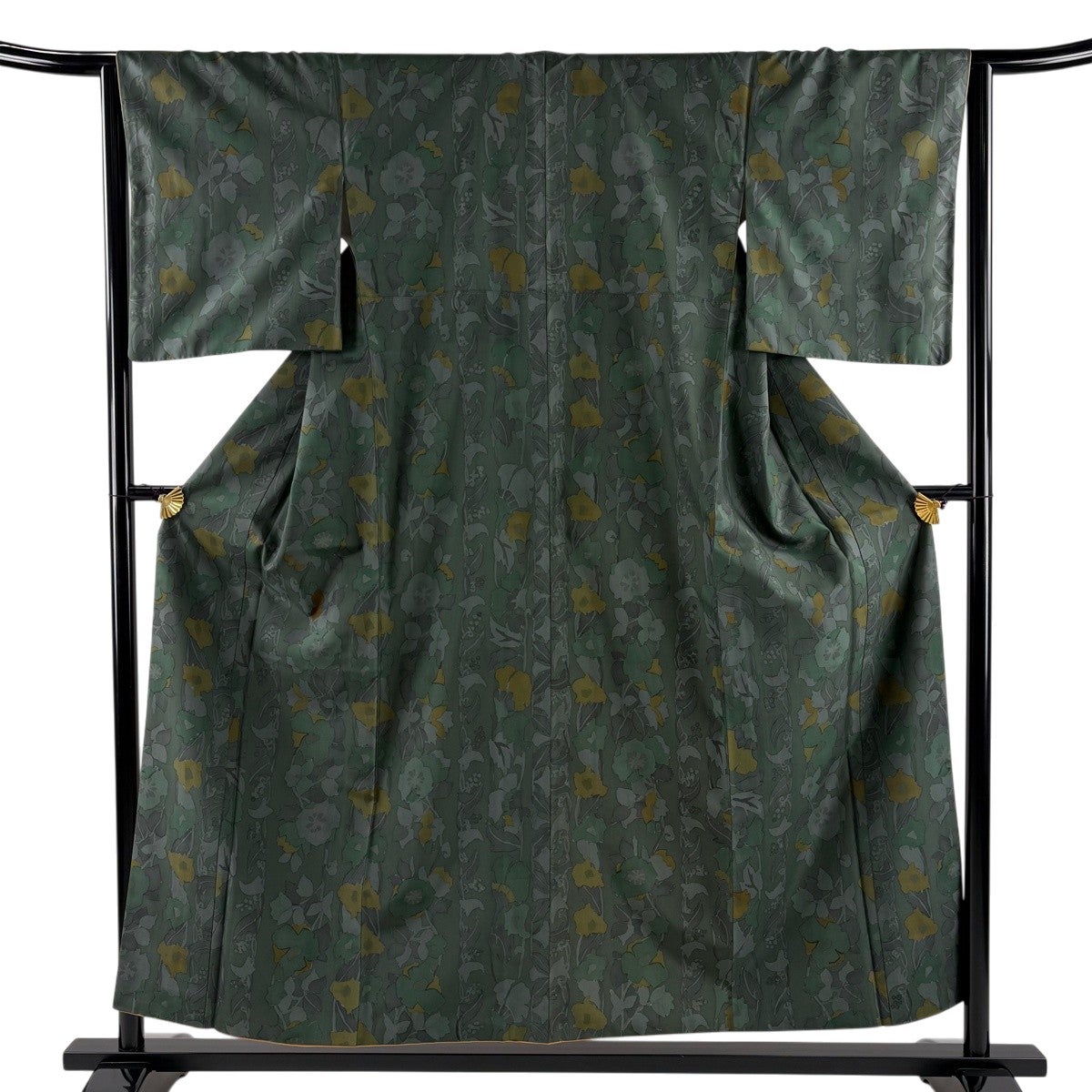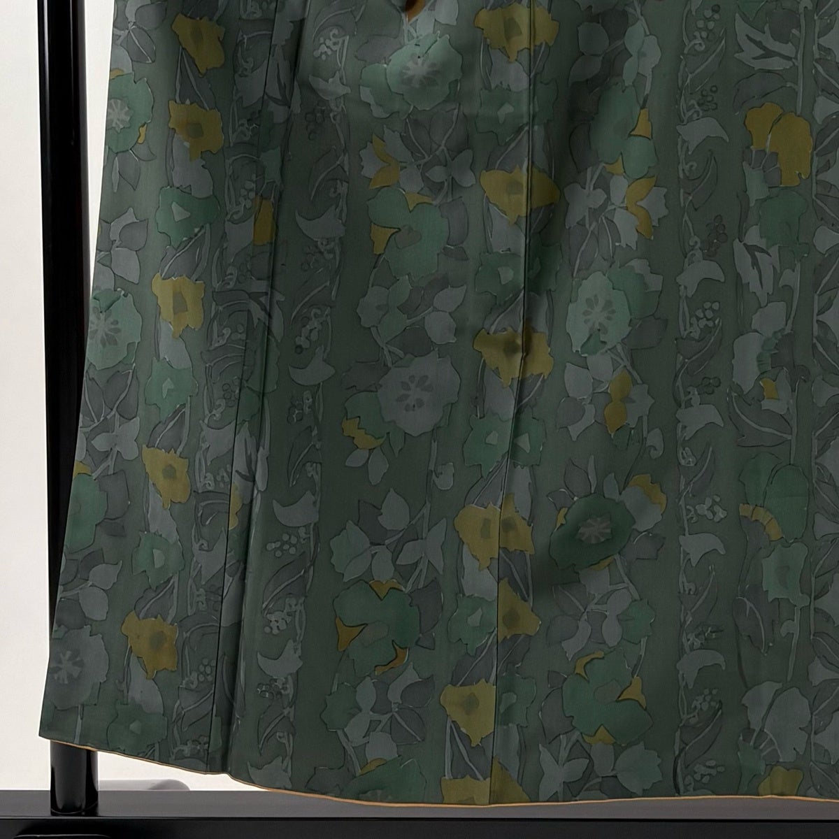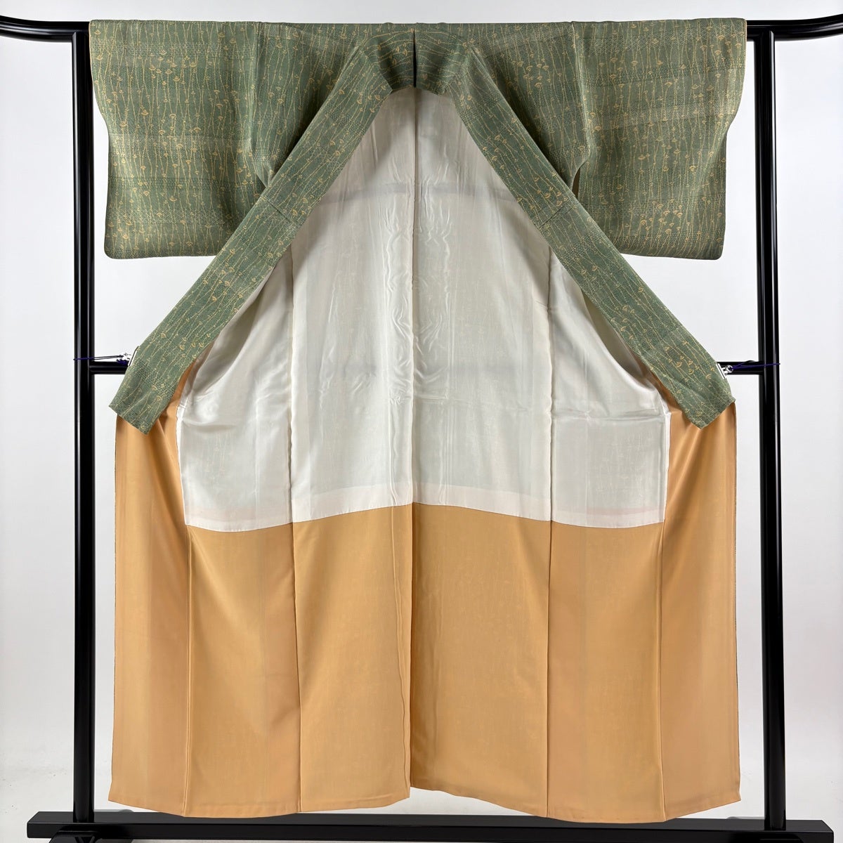 50%OFF 紬 身丈162cm 裄丈63.5cm S 袷 草花 葉 緑 正絹 秀品 K50