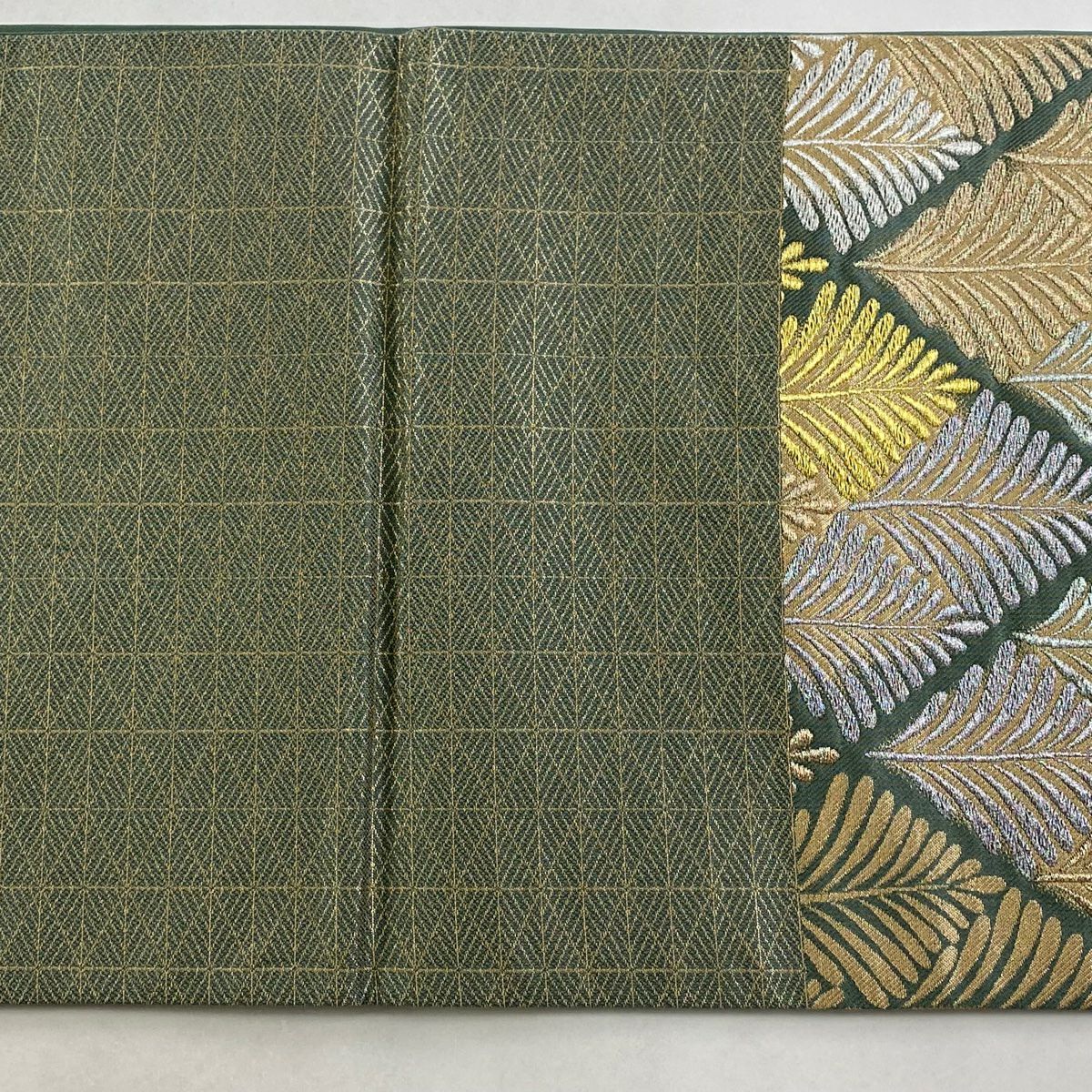 【在庫一掃】 袋帯 秀品 麗粋唐織 華文 格子 金糸 箔 抹茶色 六通 正絹