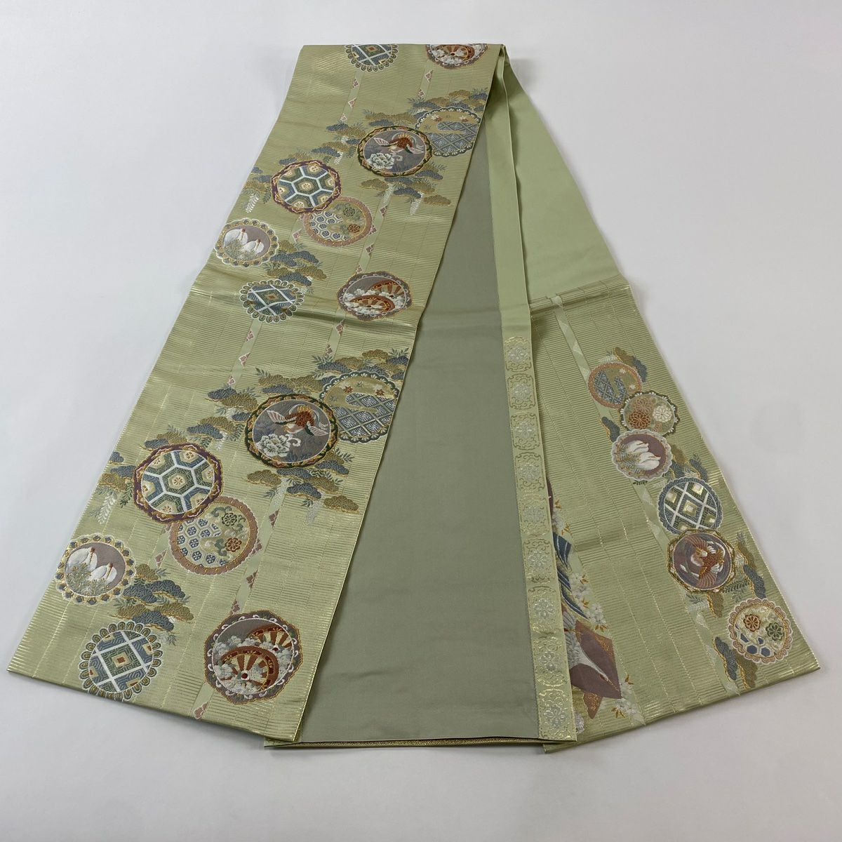 【在庫一掃】 袋帯 名品 関西仕立て 波頭 刺繍 箔 薄緑 六通 正絹