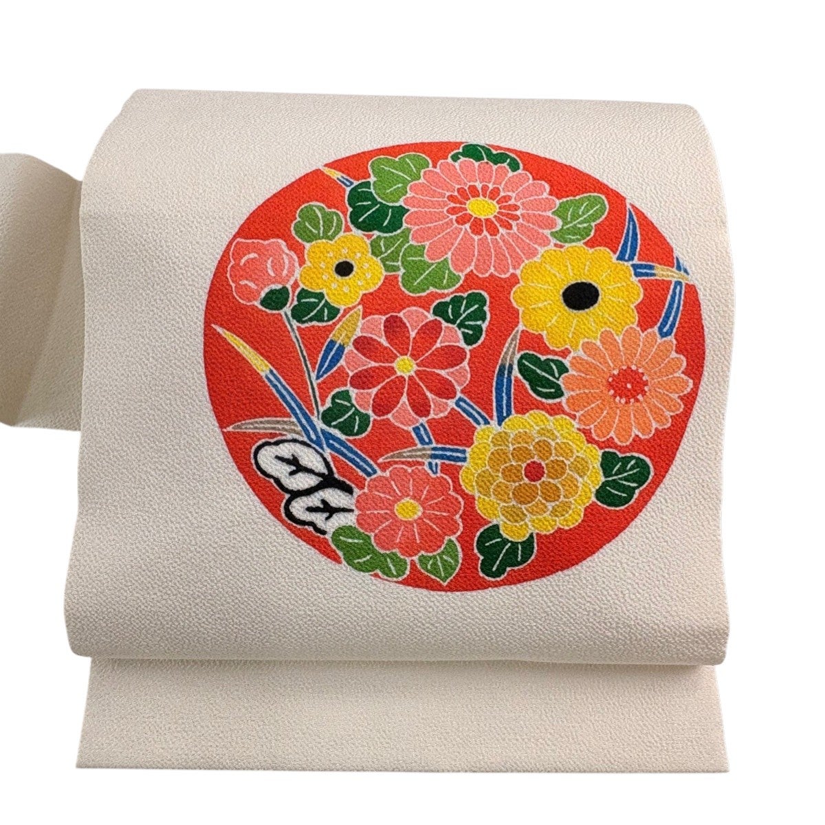 名古屋帯 逸品 菊 笹 金彩 縮緬 ベージュ 正絹