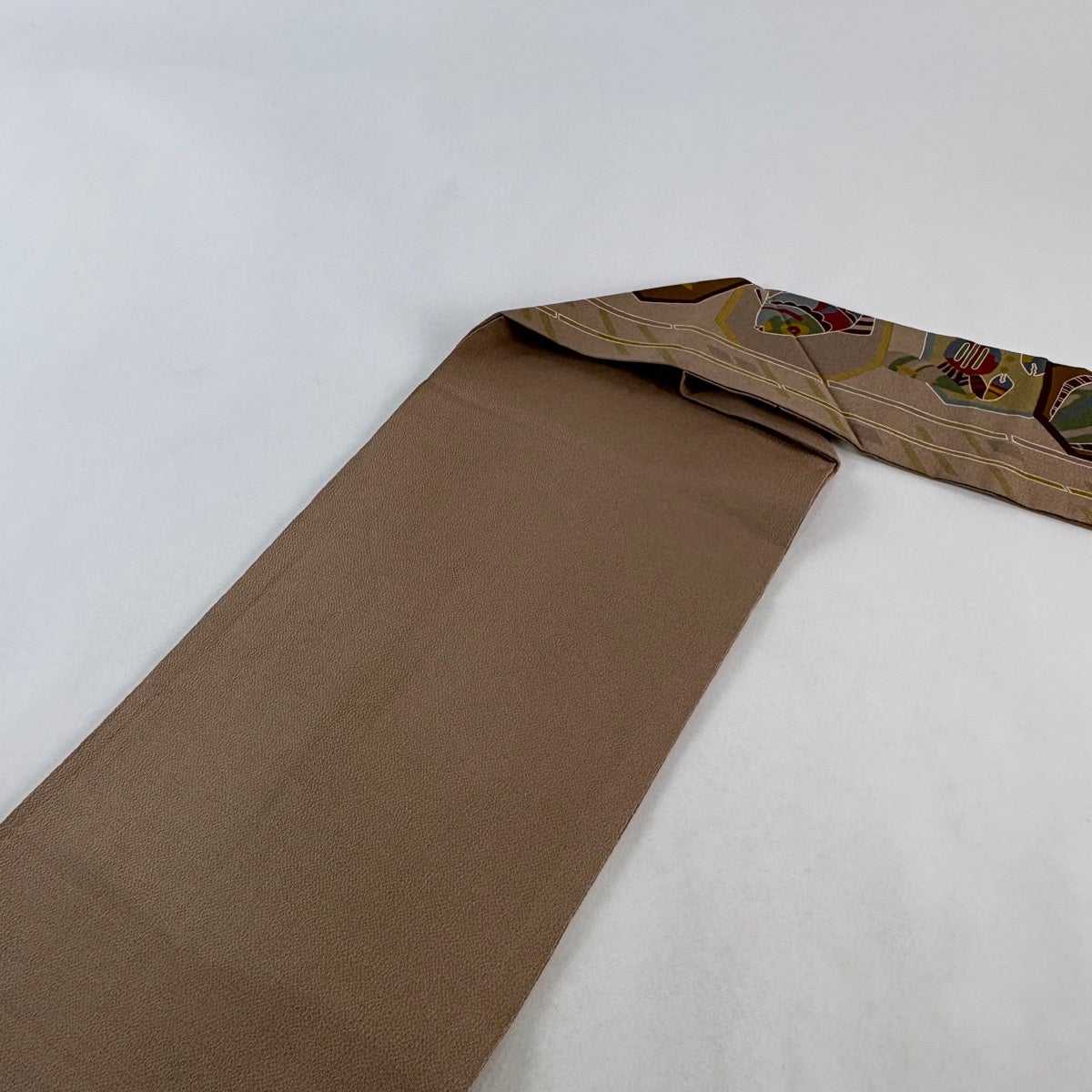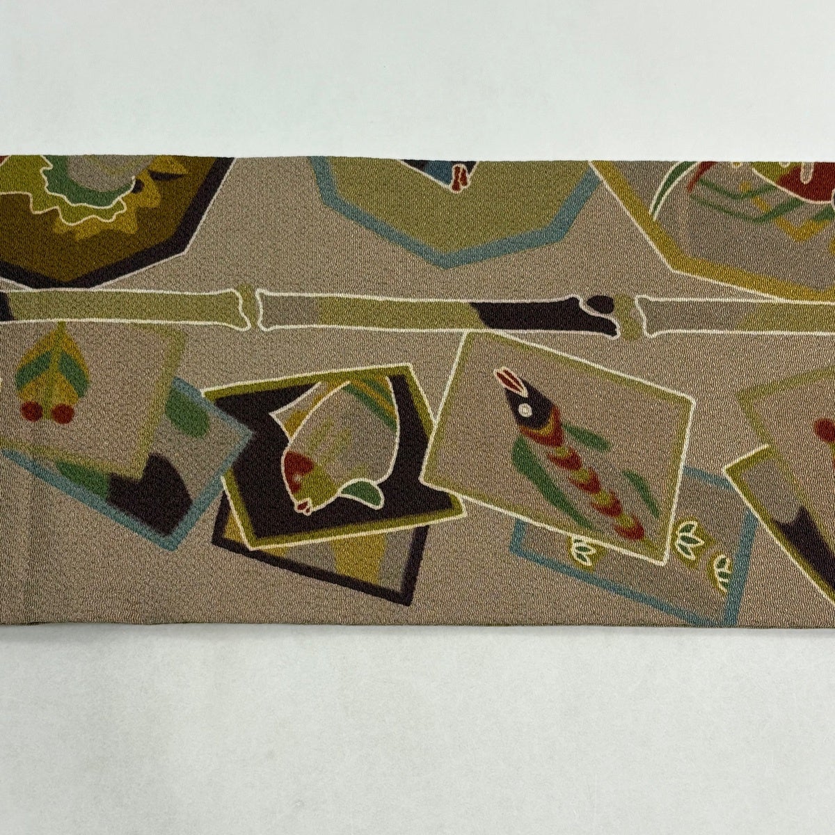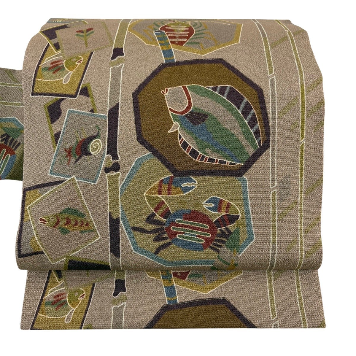 【美品】 名古屋帯 秀品 魚 カニ 縮緬 薄茶色 正絹