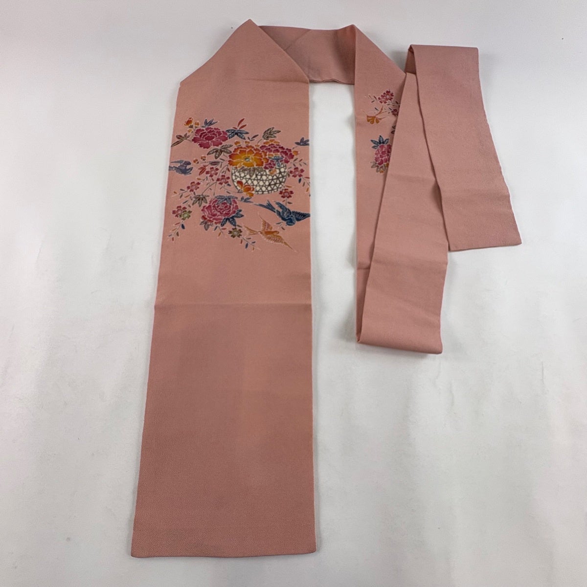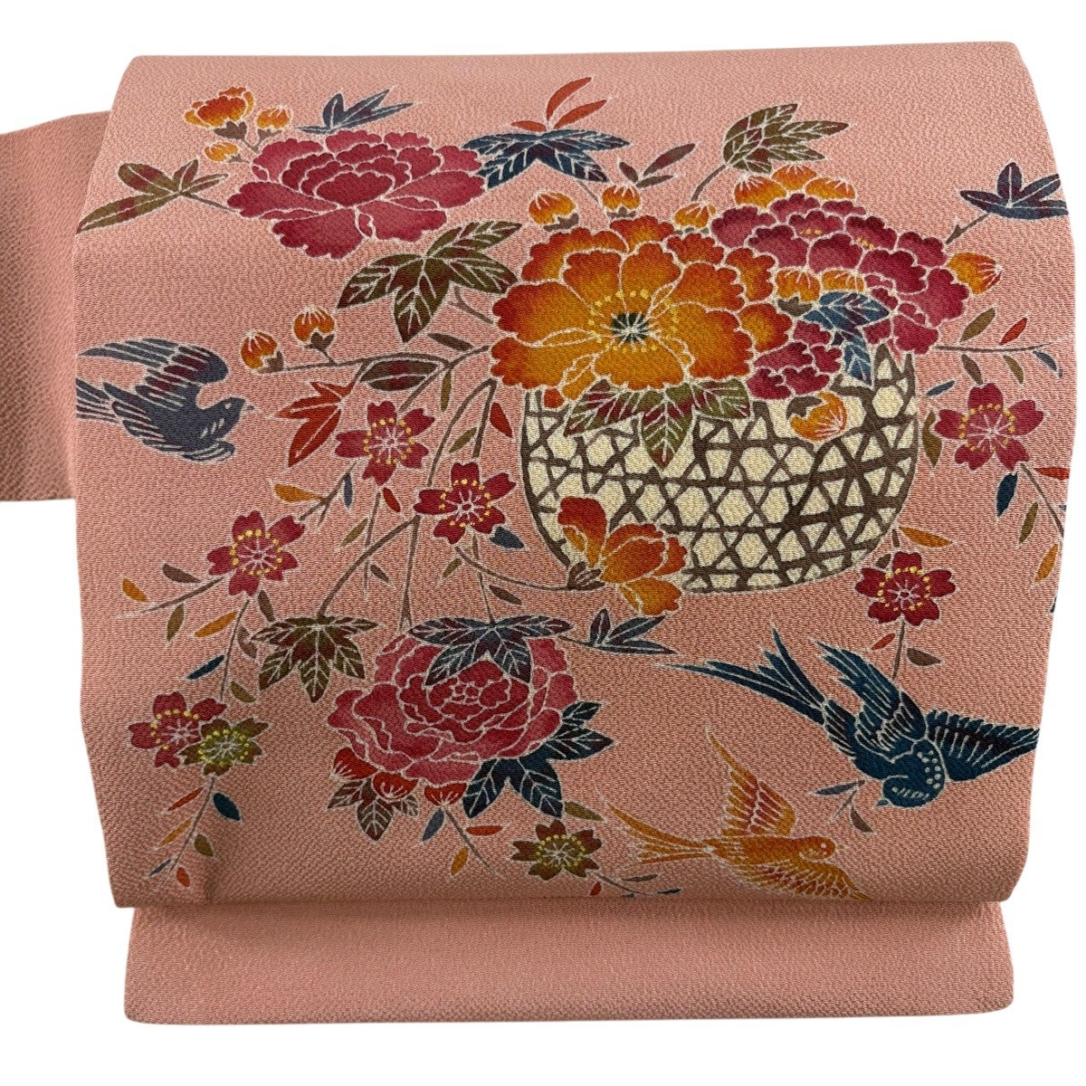 【美品】 名古屋帯 秀品 花籠 鳥 縮緬 ピンク 正絹