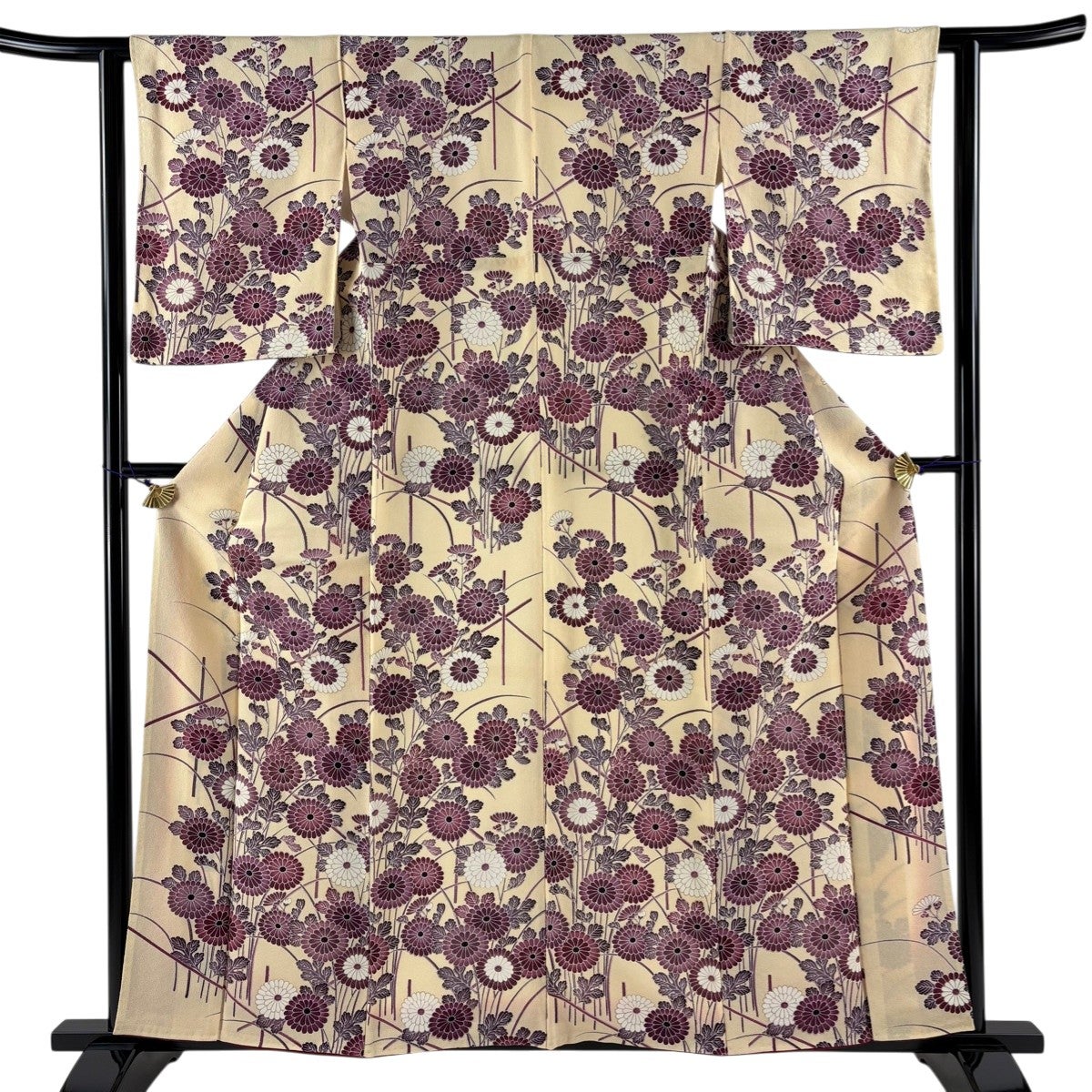 【美品】 小紋 身丈162.5cm 裄丈66cm M 単衣 源氏香 桜 縮緬 黄土色 正絹 秀品