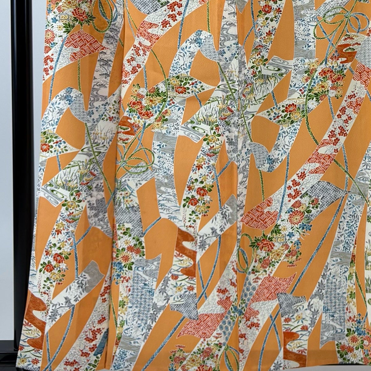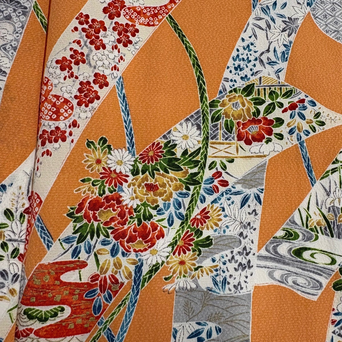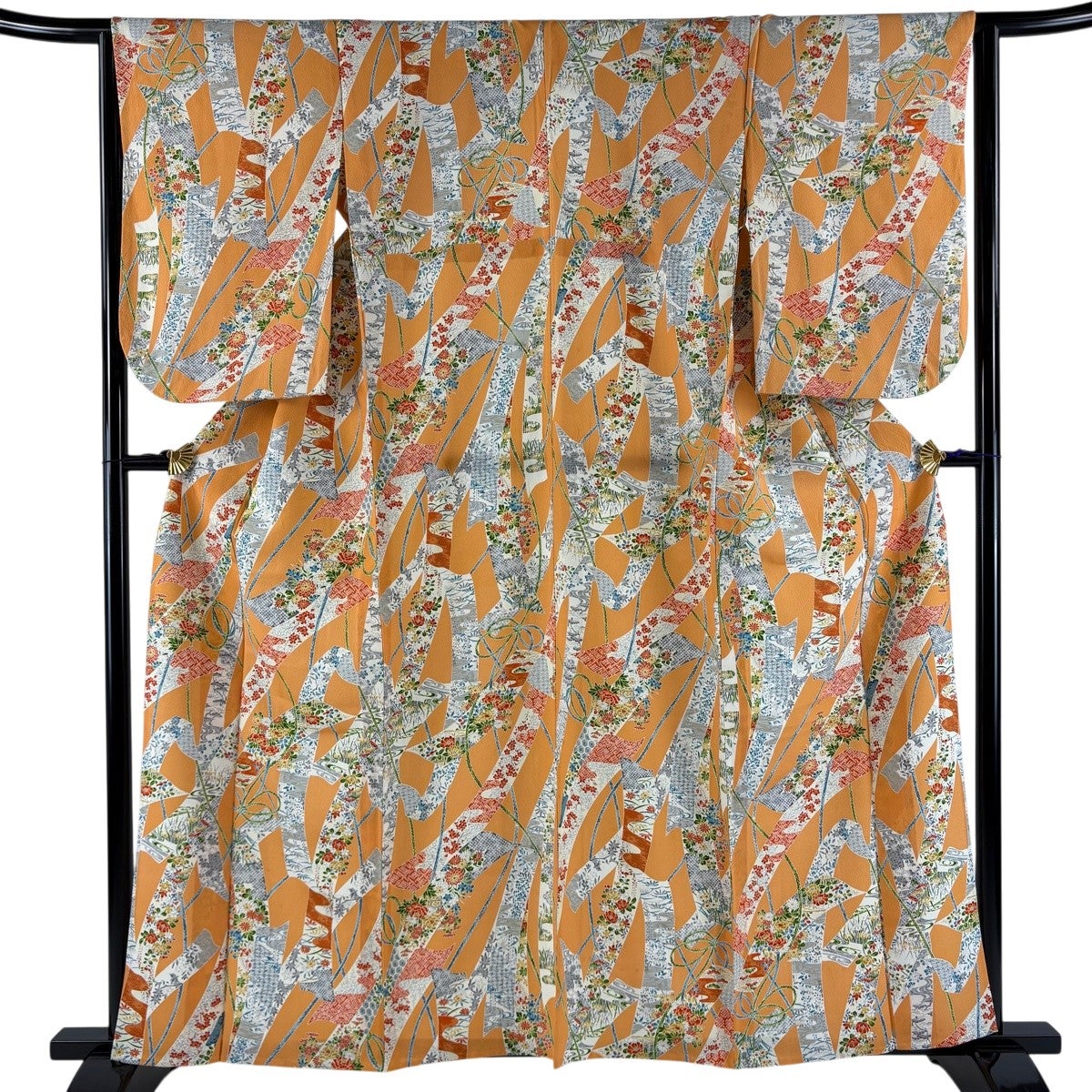 小紋 身丈159.5cm 裄丈63.5cm S 単衣 短冊 草花 金彩 縮緬 オレンジ 正絹 優品
