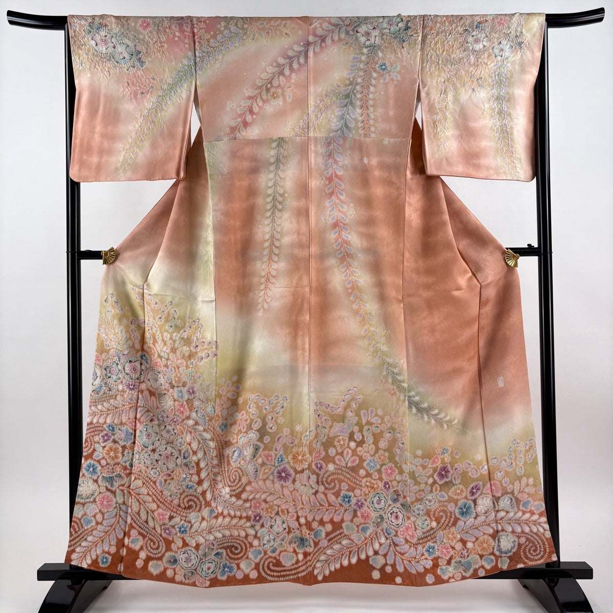 訪問着 身丈159cm 裄丈65.5cm M 袷 翠山工房 落款あり 辻が花 疋田 ぼかし サーモンピンク 正絹 逸品