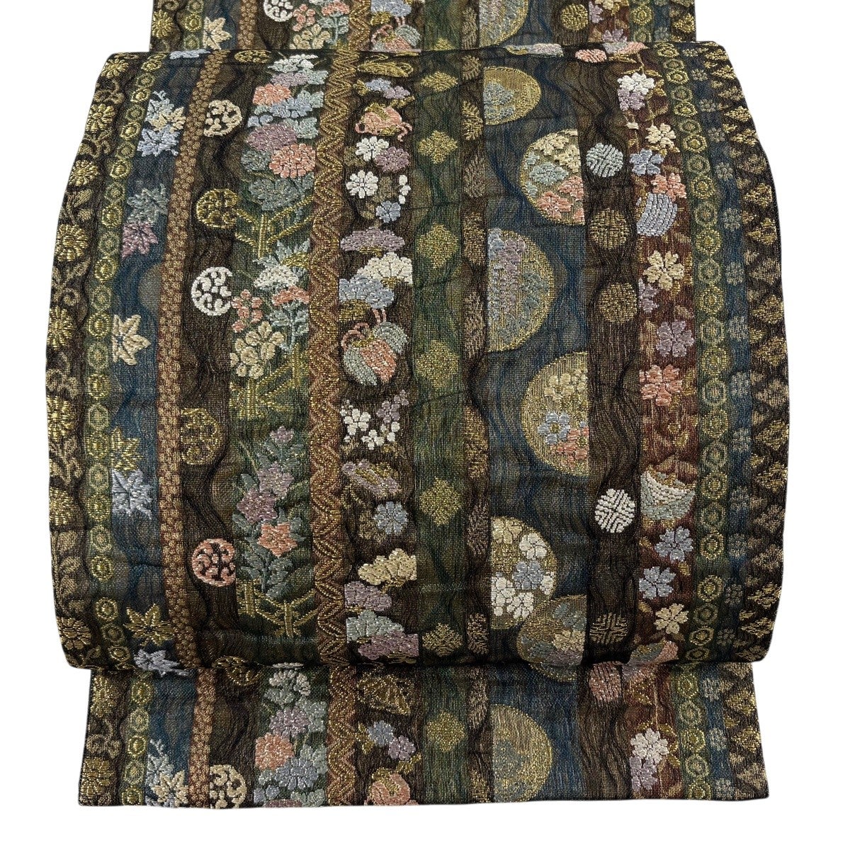 【美品】 袋帯 秀品 草花 幾何学 箔 金糸 焦茶色 六通 正絹