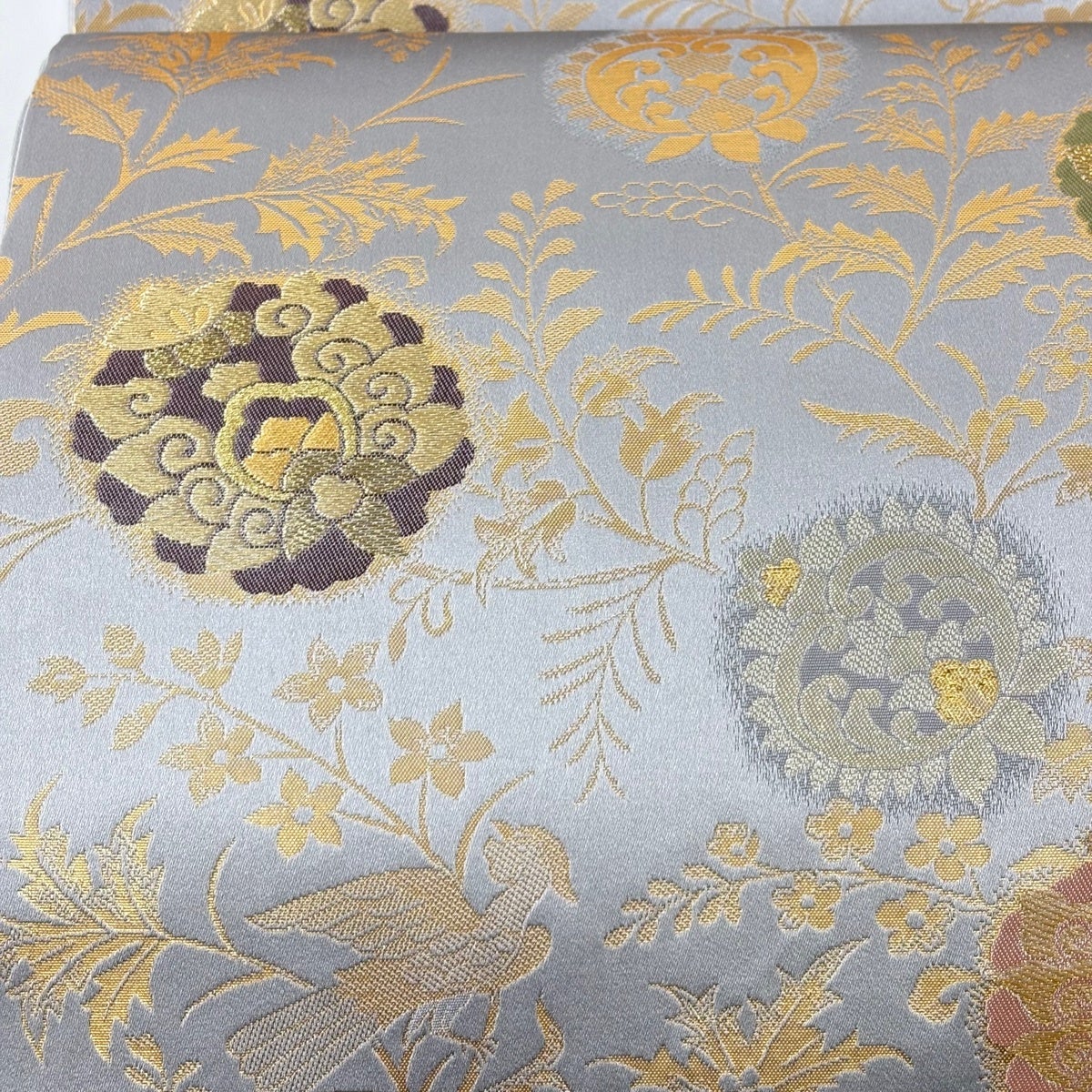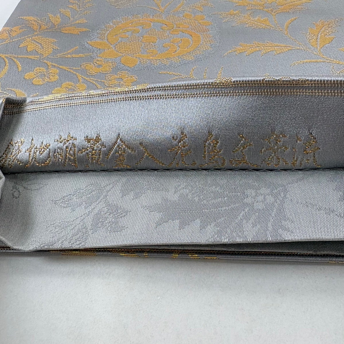 【美品】 袋帯 秀品 花 唐草 金銀糸 刺繍 灰紫 六通 正絹