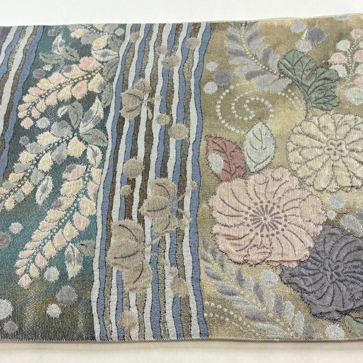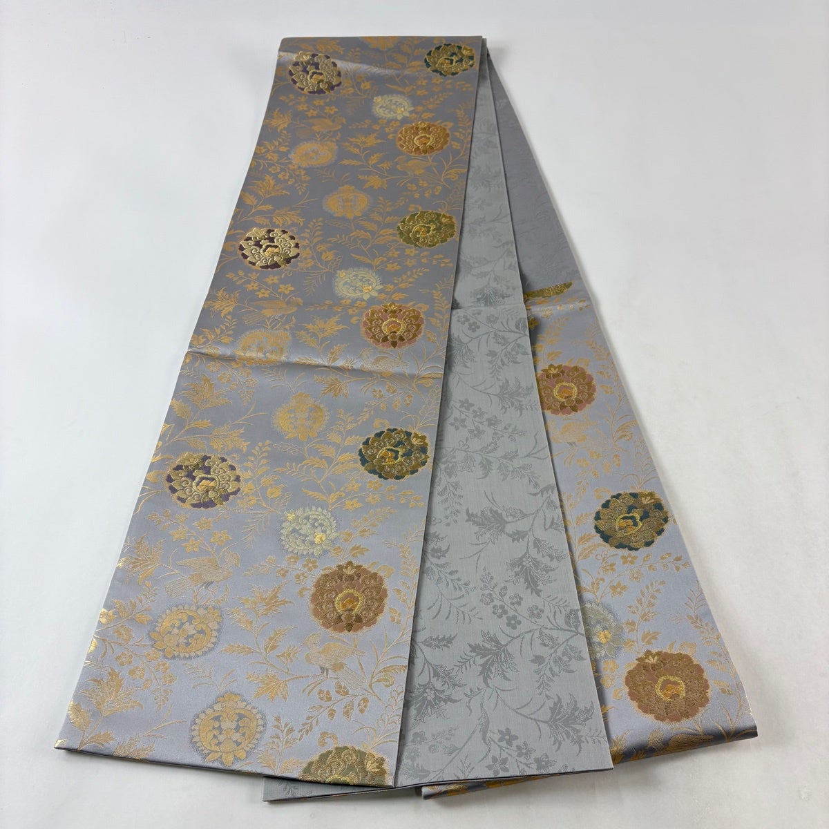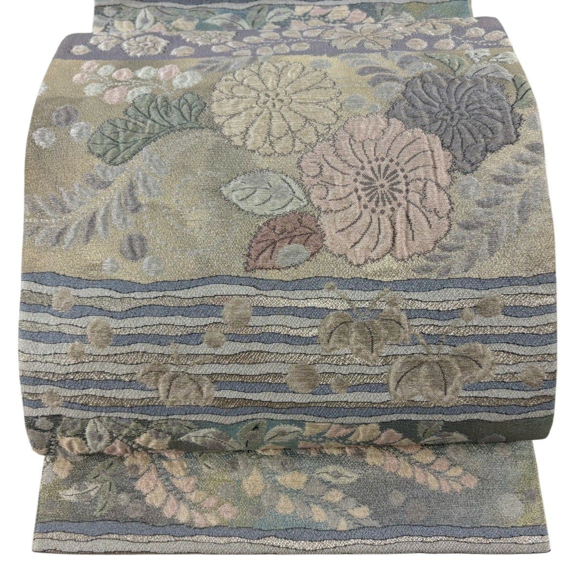 【美品】 袋帯 秀品 市松 花びら 金銀糸 箔 灰色 六通 正絹
