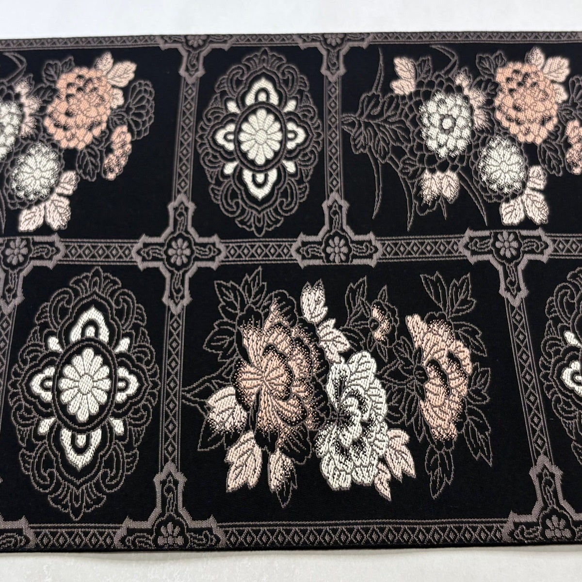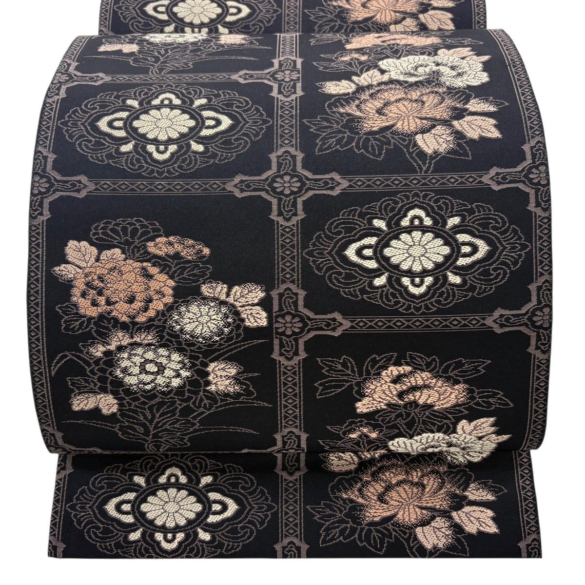 【美品】 袋帯 秀品 花唐草 丸文 銀糸 焦茶色 全通 正絹