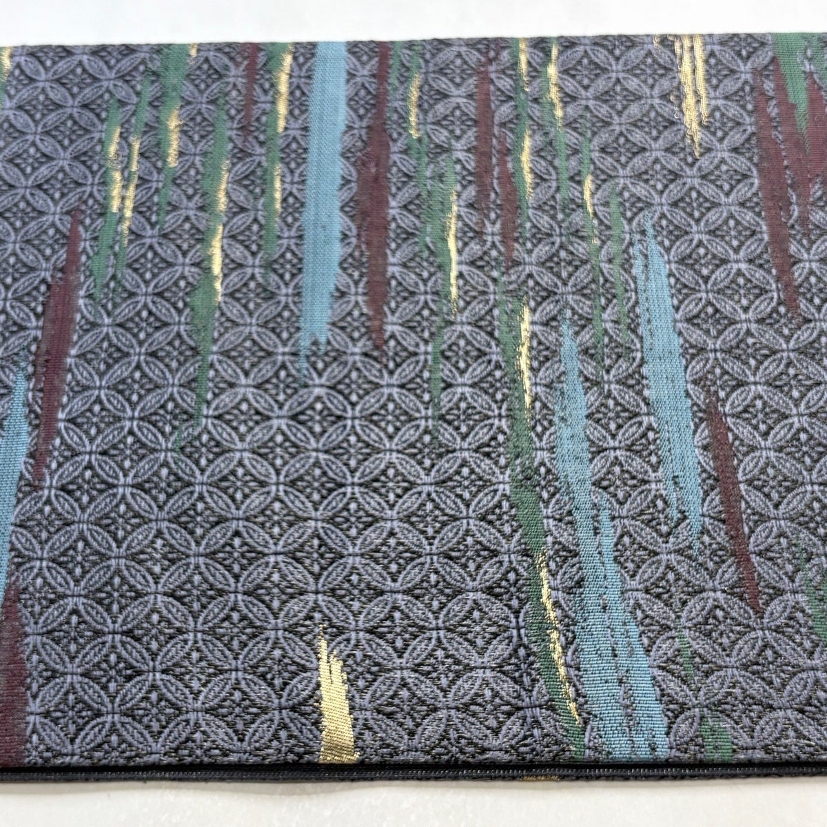 【美品】 袋帯 秀品 幾何学模様 箔 深緑 六通 正絹