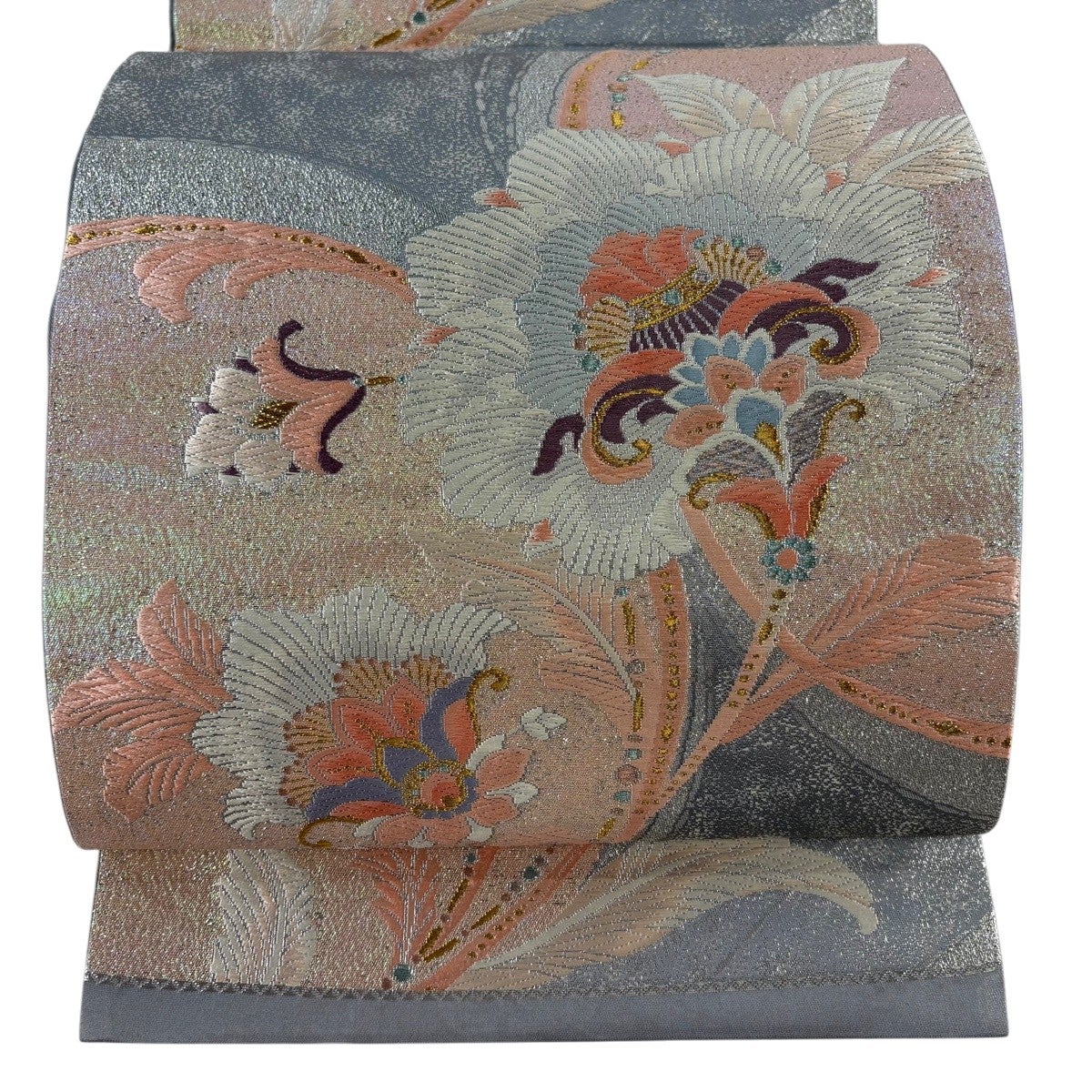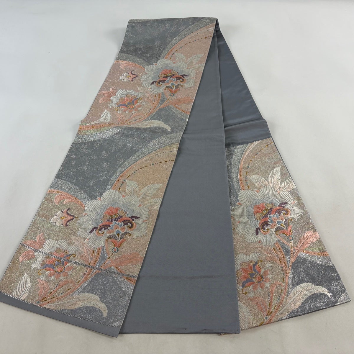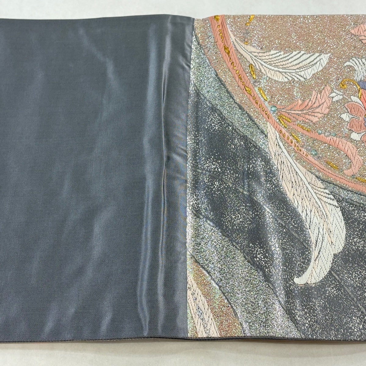 【美品】 袋帯 秀品 関西仕立て 草花 金糸 箔 灰色 六通 正絹