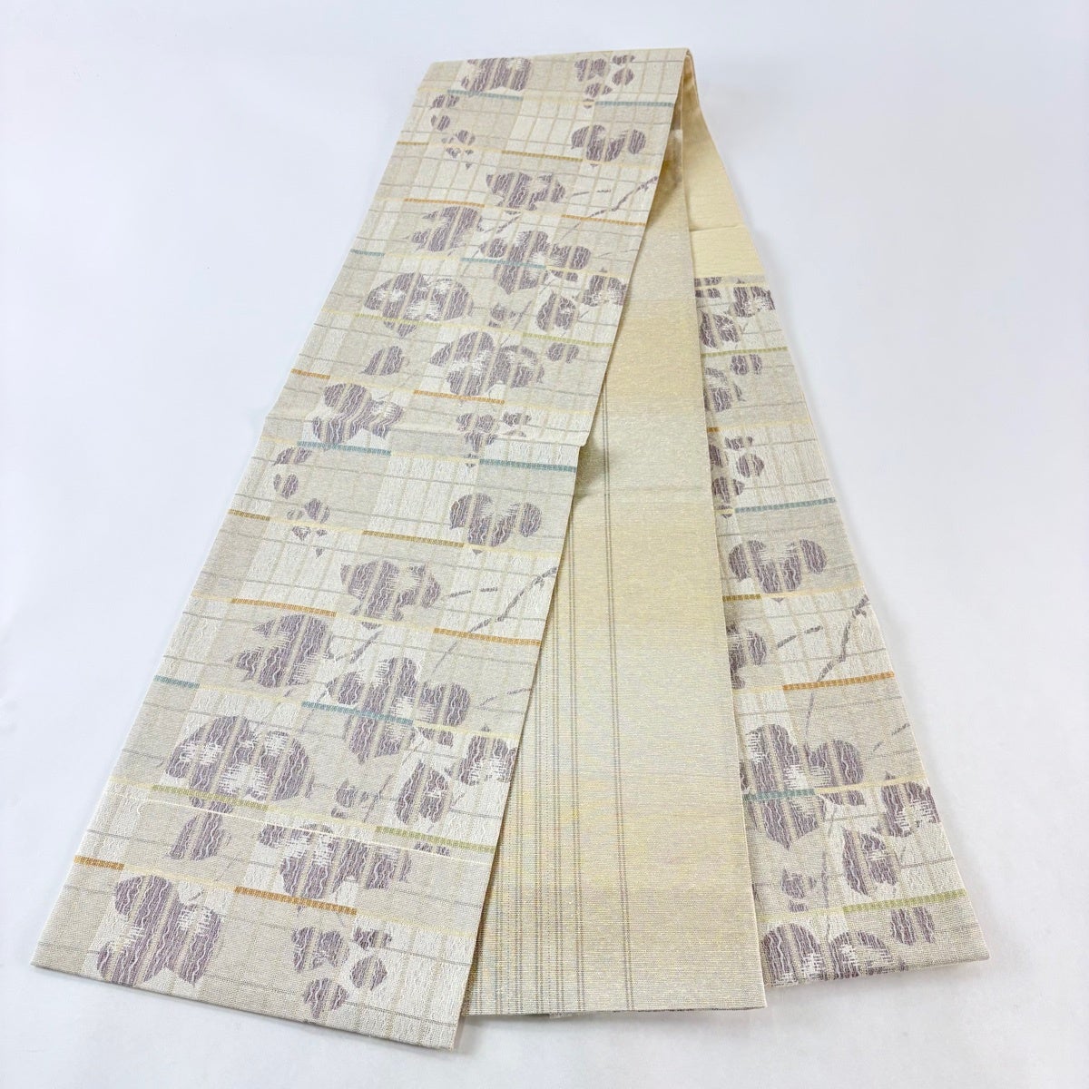 【美品】 袋帯 秀品 やまと 葉 格子 金糸 ベージュ 六通 正絹