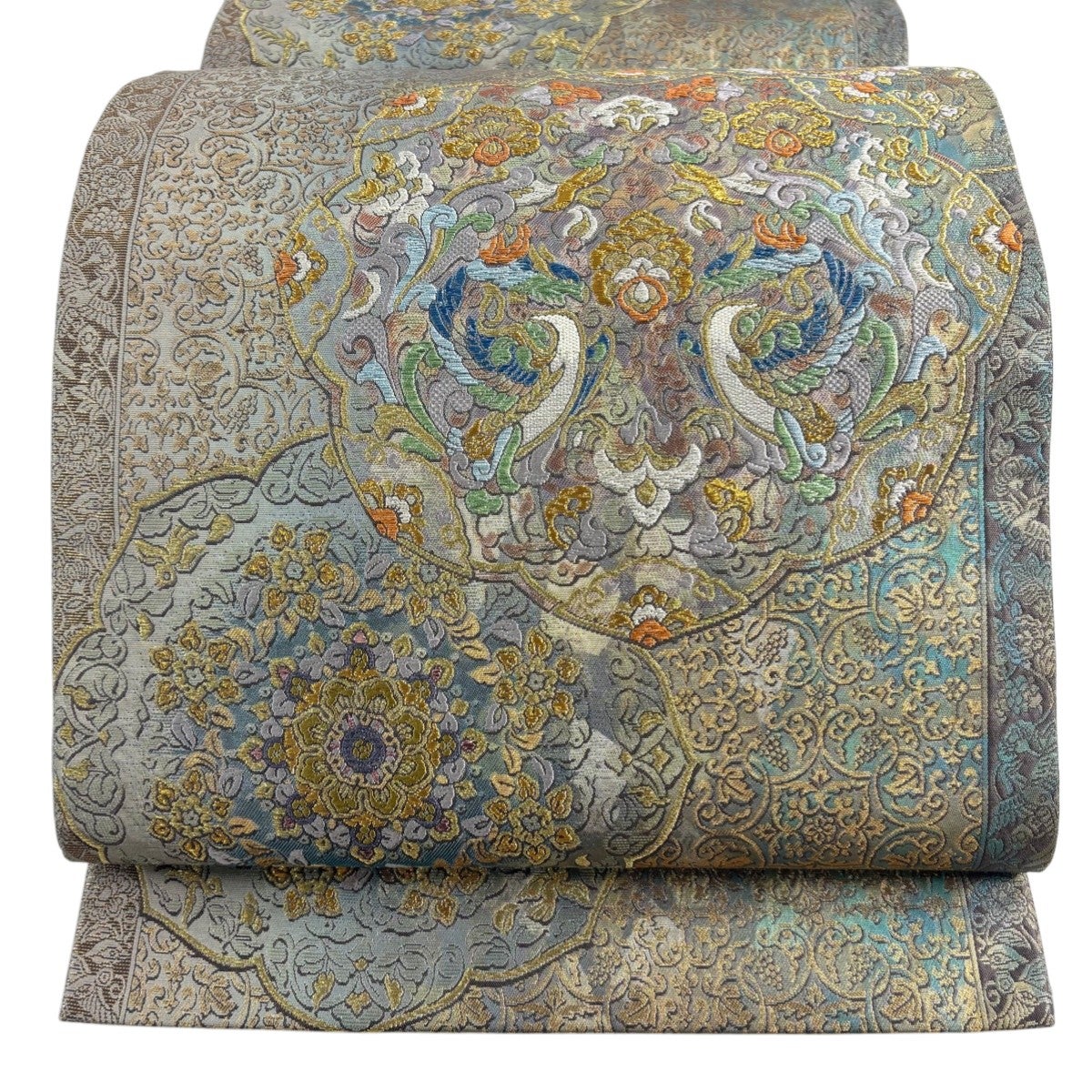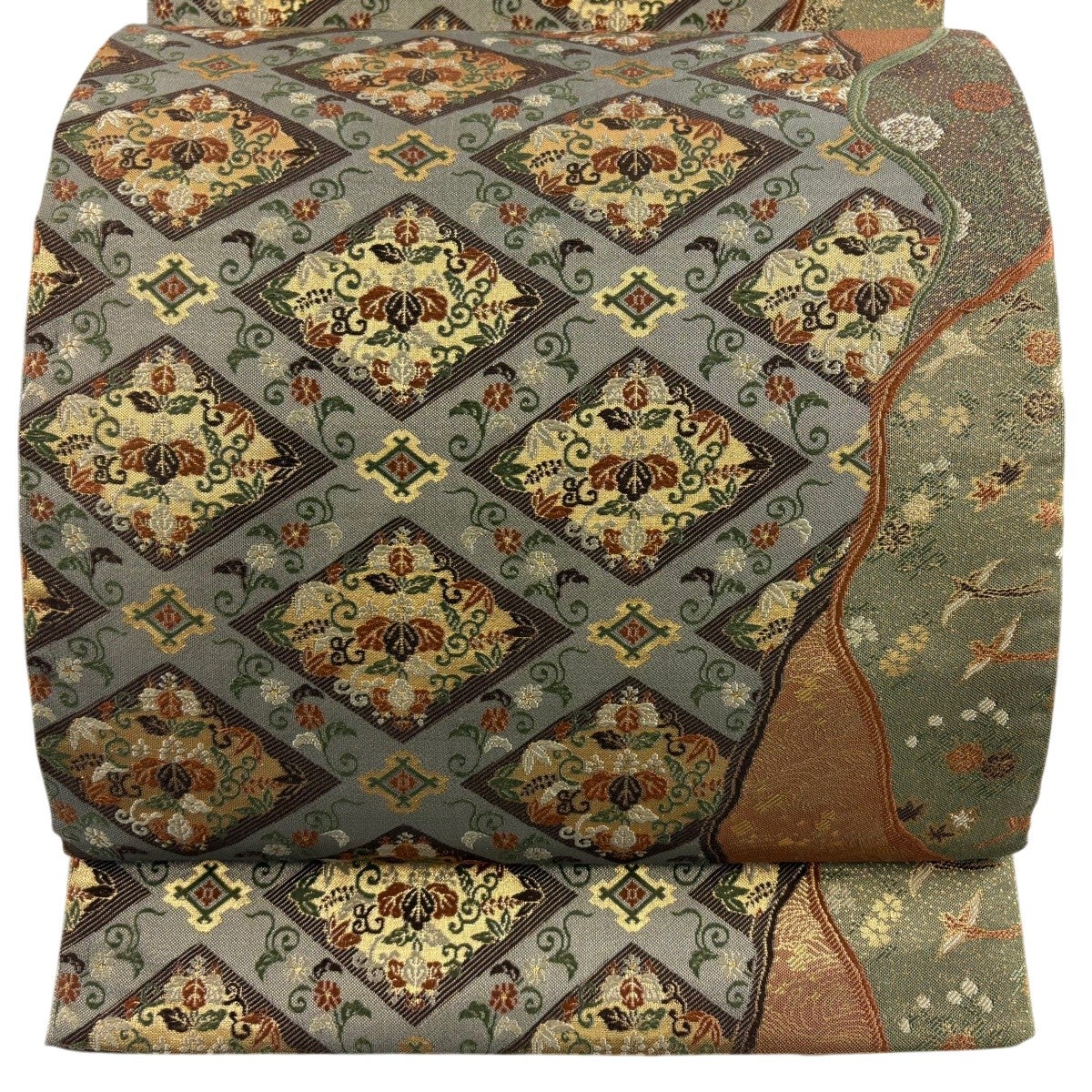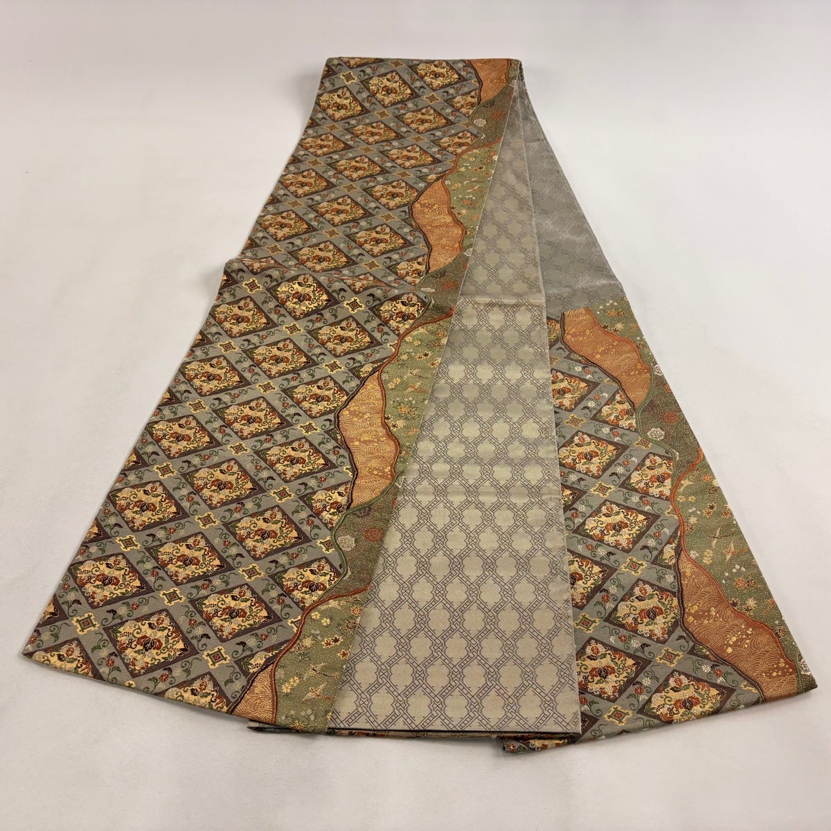 【美品】 袋帯 秀品 菱 花唐草 箔 金糸 灰緑 六通 正絹