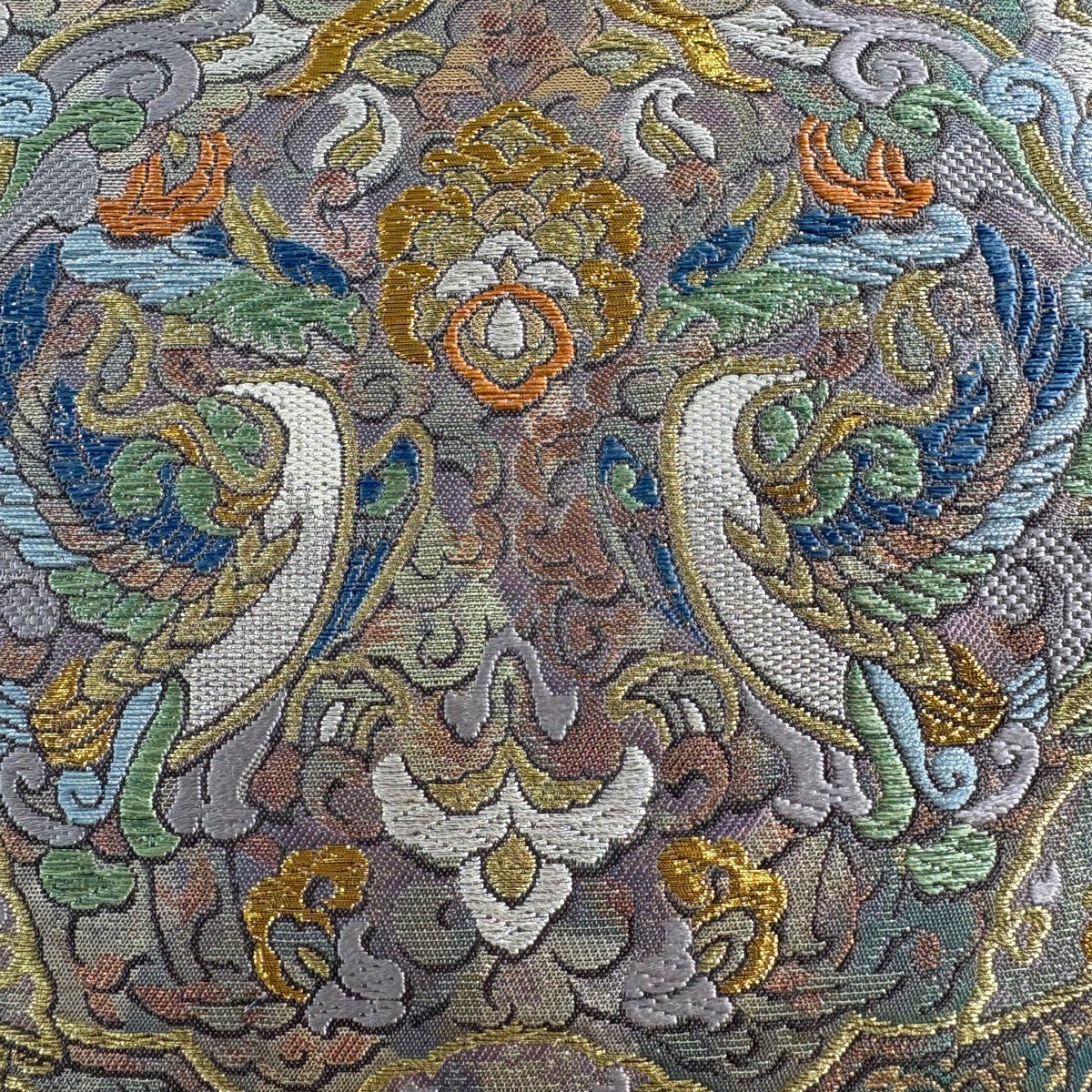 【美品】 袋帯 秀品 草花 鳥 箔 青灰色 六通 正絹