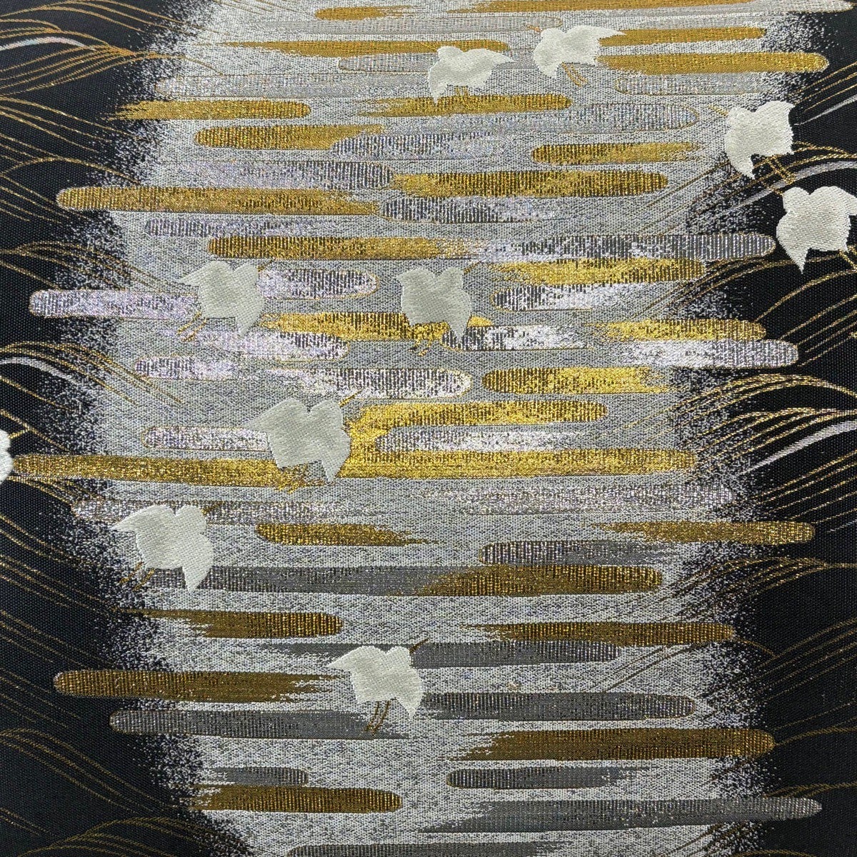 【美品】 袋帯 秀品 千鳥 ヱ霞 箔 刺繍 黒灰 六通 正絹
