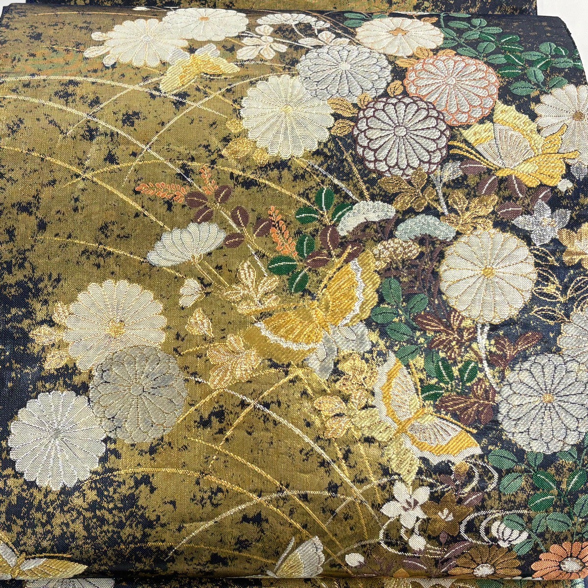 【美品】 袋帯 秀品 菊 波 金糸 箔 茶緑色 六通 正絹