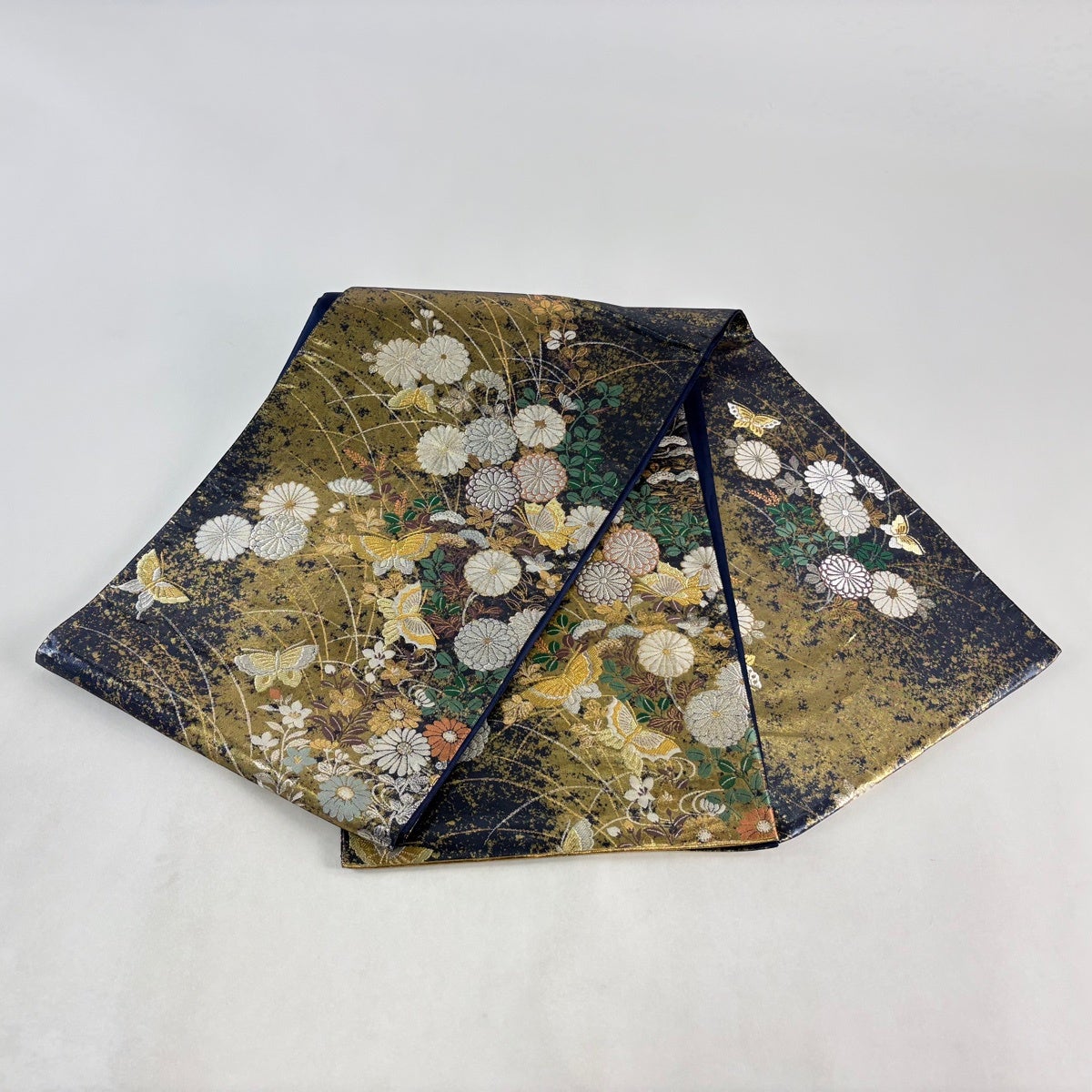 袋帯 秀品 蝶 秋草 箔 金銀糸 紺色 お太鼓柄 正絹
