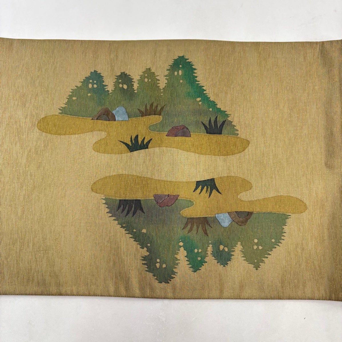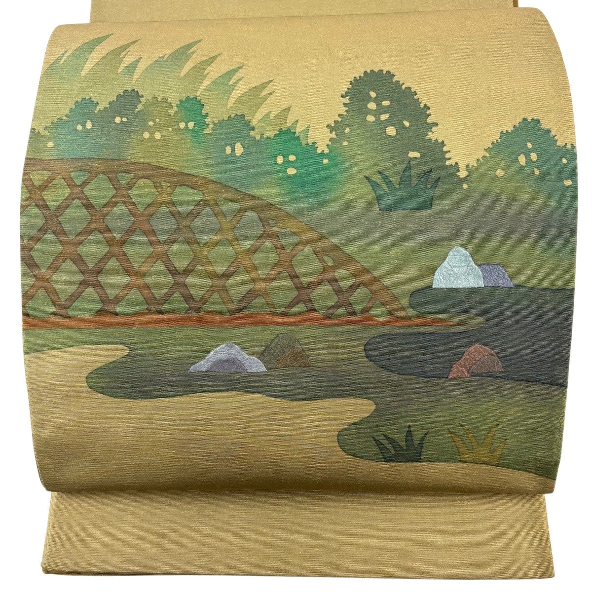 【美品】 袋帯 秀品 水辺の風景 樹木 箔 茶緑色 お太鼓柄 正絹