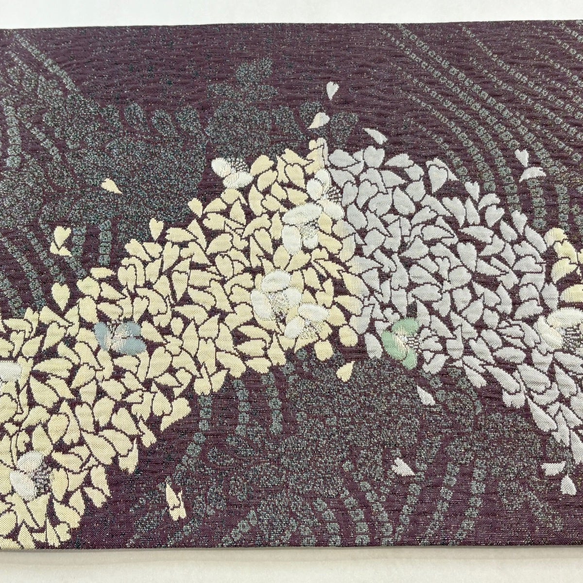 【美品】 袋帯 秀品 桜 花弁 箔 黒灰 六通 正絹