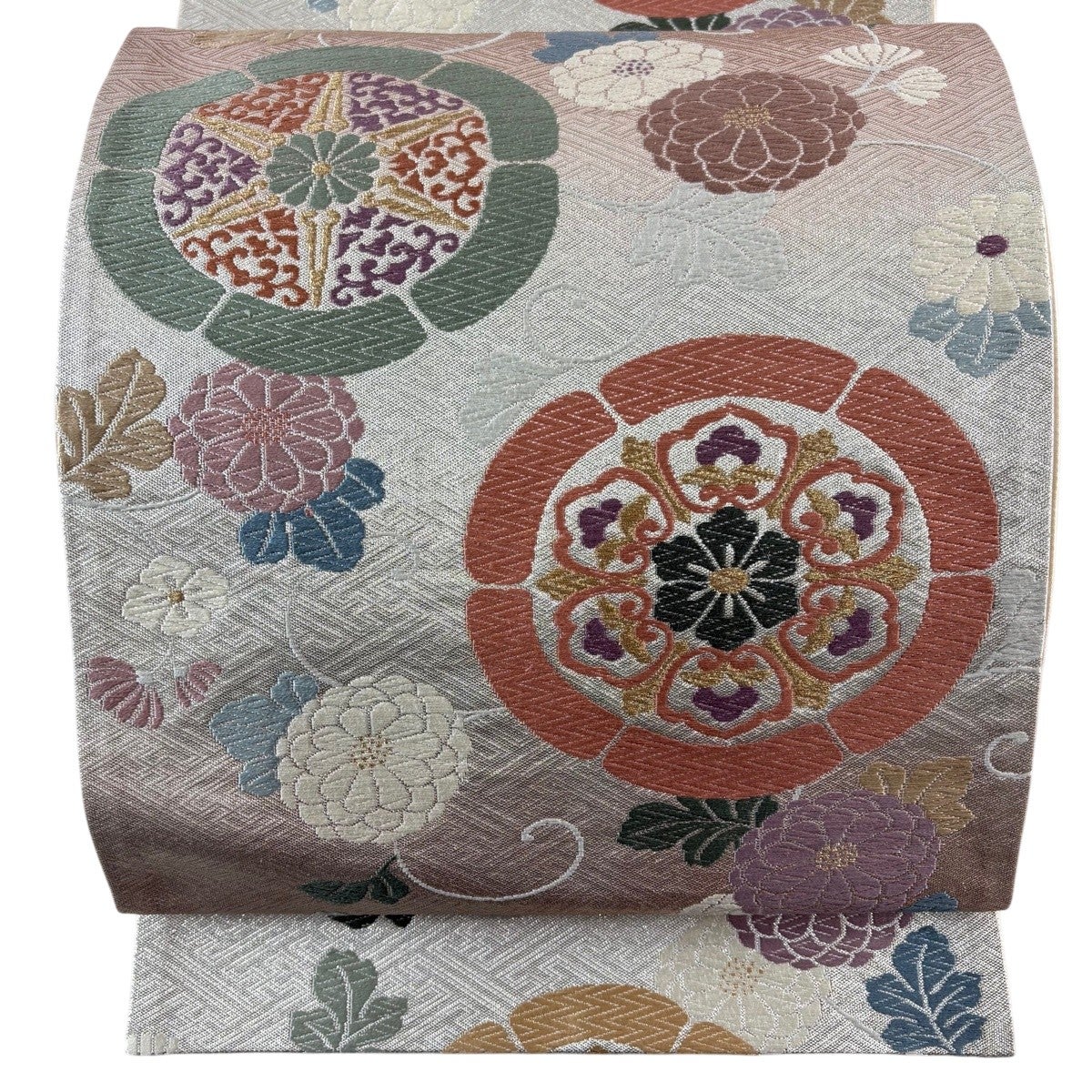 袋帯 秀品 菊 唐草 金銀糸 箔 銀色 六通 正絹