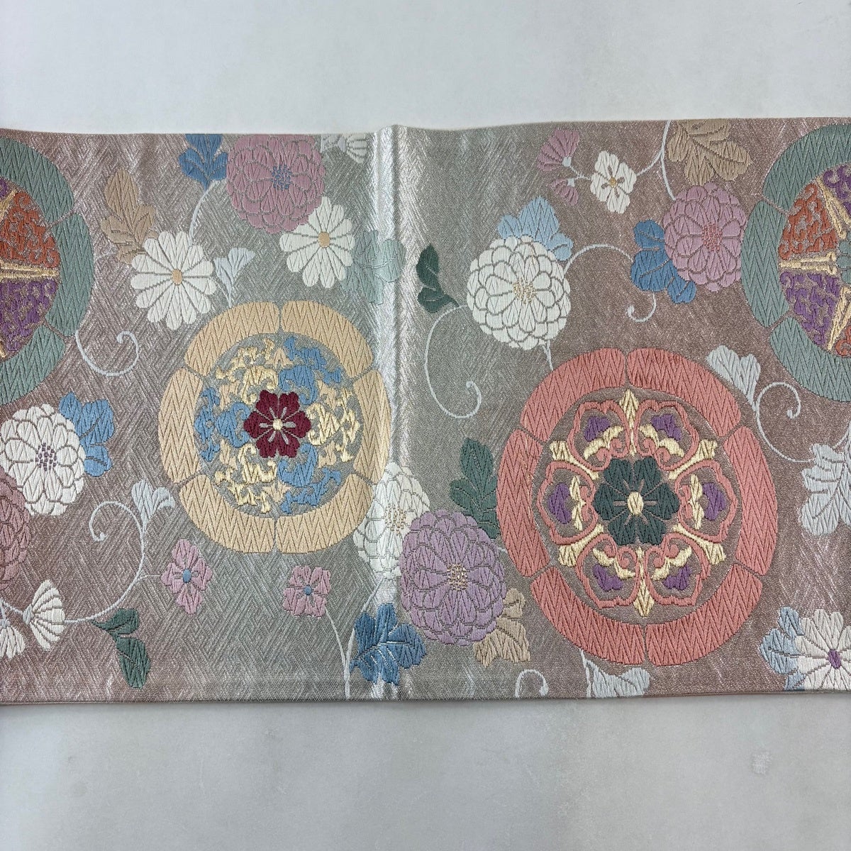 袋帯 秀品 菊 葉柄 唐織 金銀糸 灰茶 六通 正絹