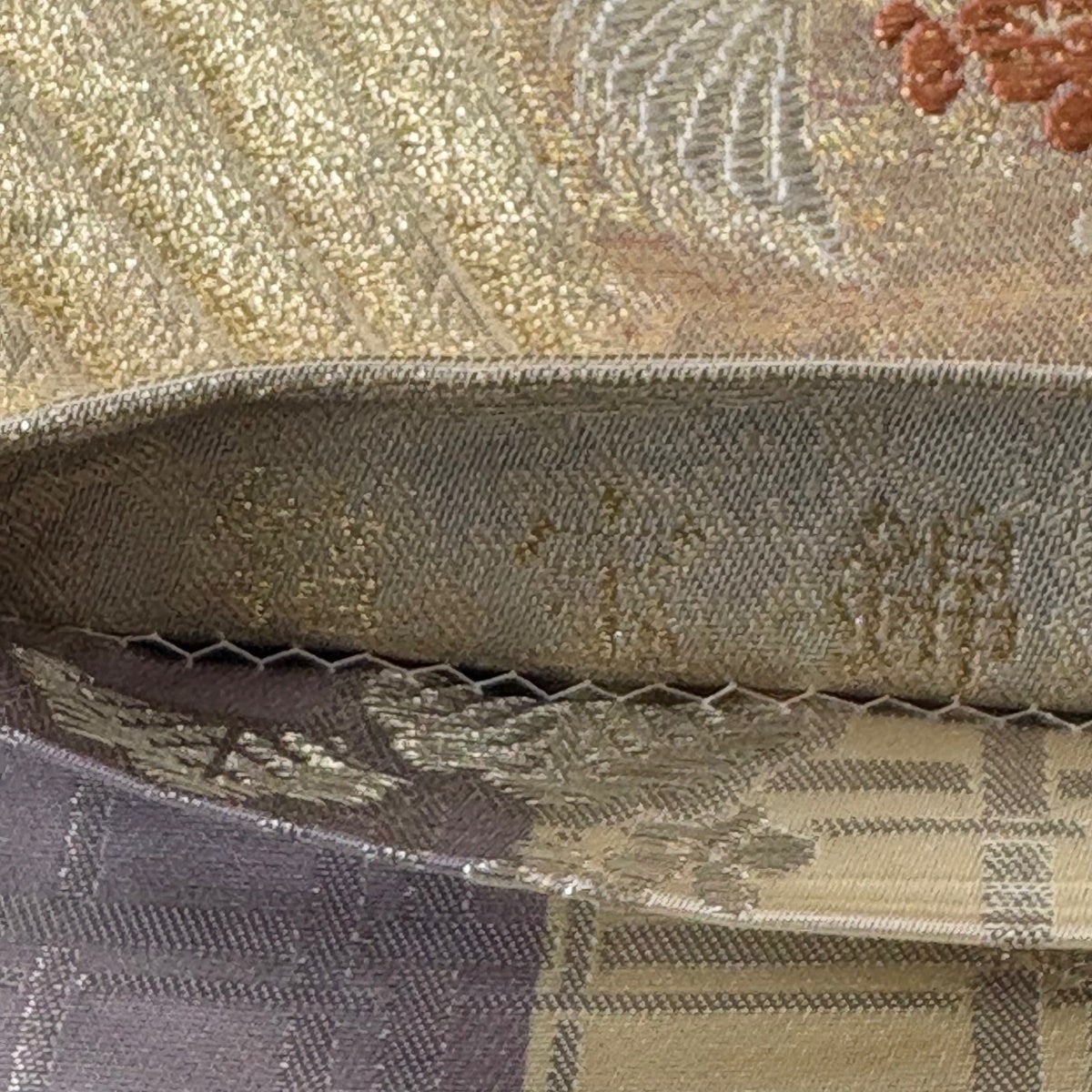袋帯 秀品 格子 幾何学模様 箔 ベージュ 六通 正絹