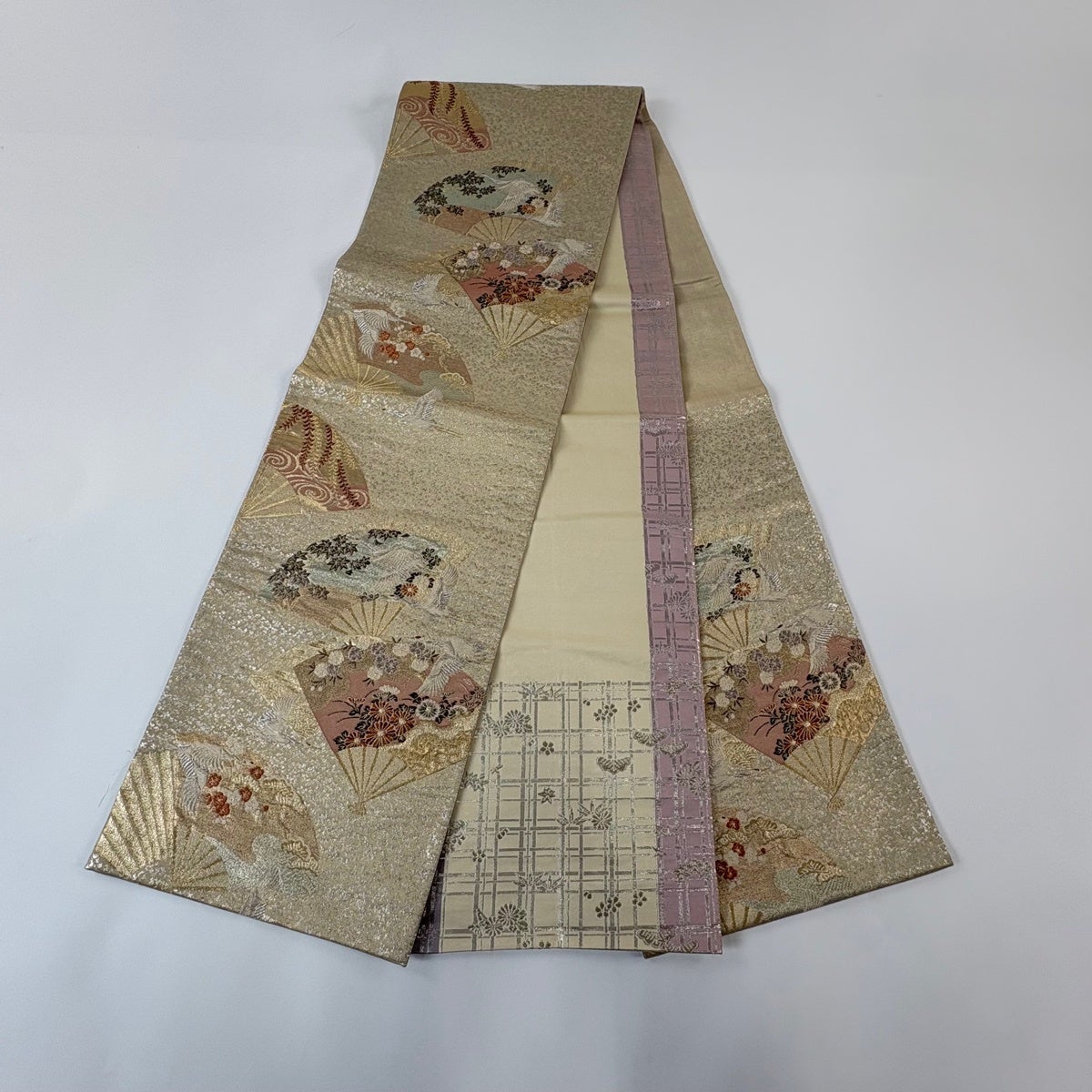 【美品】 袋帯 秀品 扇 鶴 箔 金銀糸 ベージュ 六通 正絹
