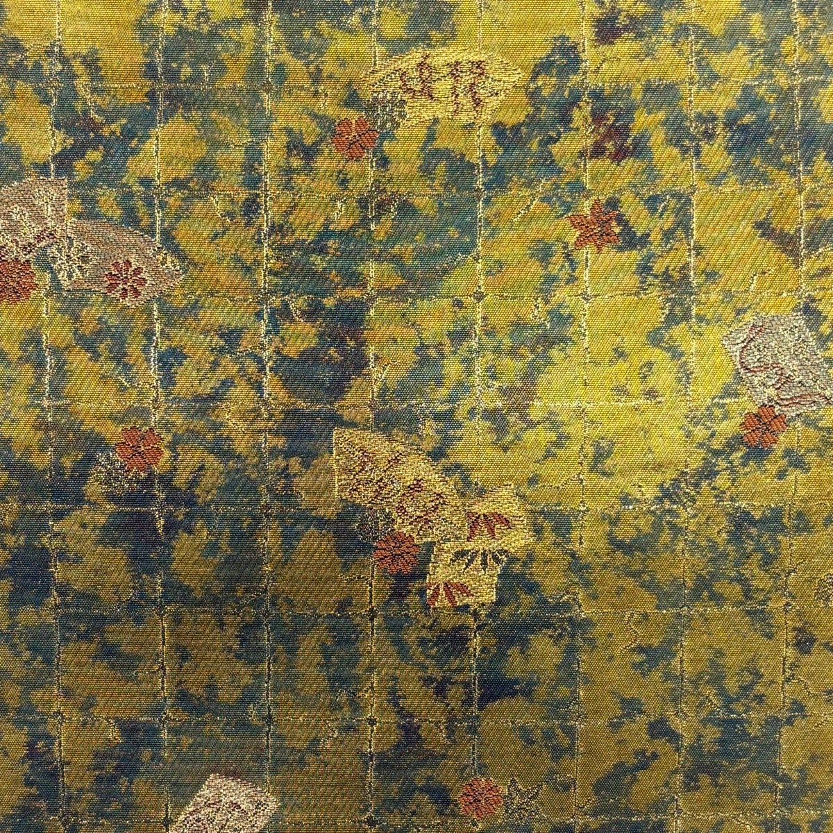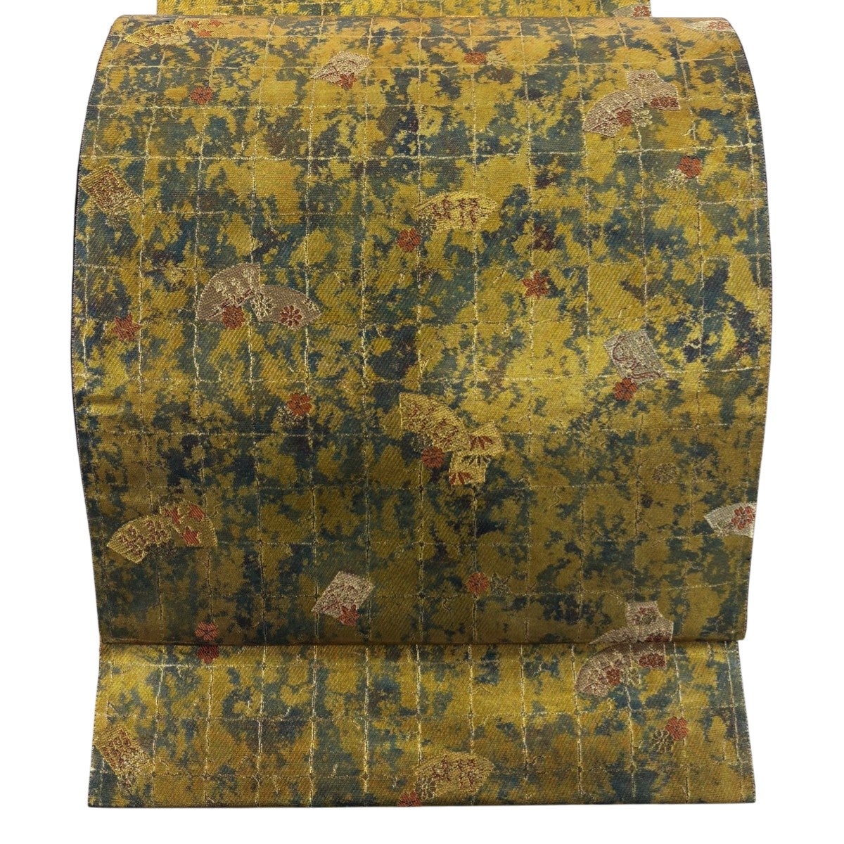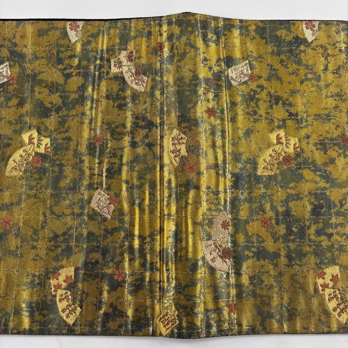 【美品】 袋帯 秀品 服部織物 落款あり 扇面 草花 金糸 箔 金色 六通 正絹