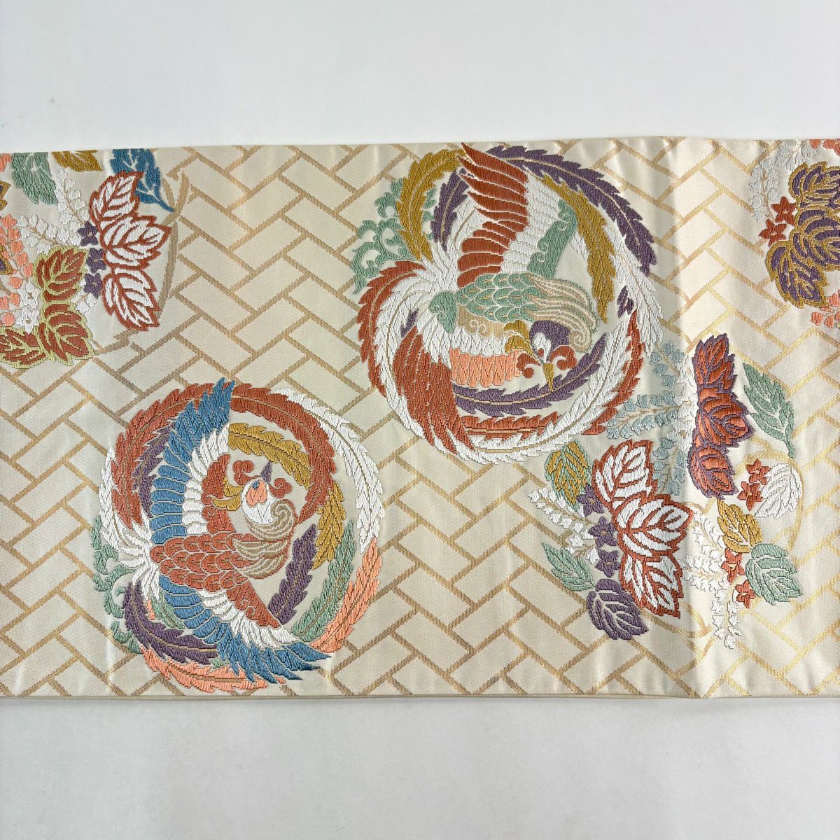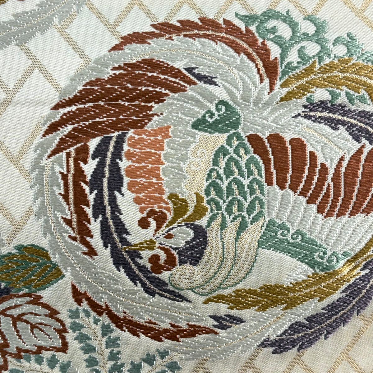 名古屋帯 秀品 関西仕立て 花丸文 金銀糸 刺繍 クリーム 正絹