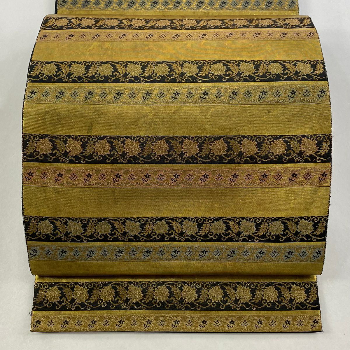 袋帯 秀品 箔屋清兵衛 落款あり 名物裂間道 花唐草 縞 箔 山吹茶色 お太鼓柄 正絹