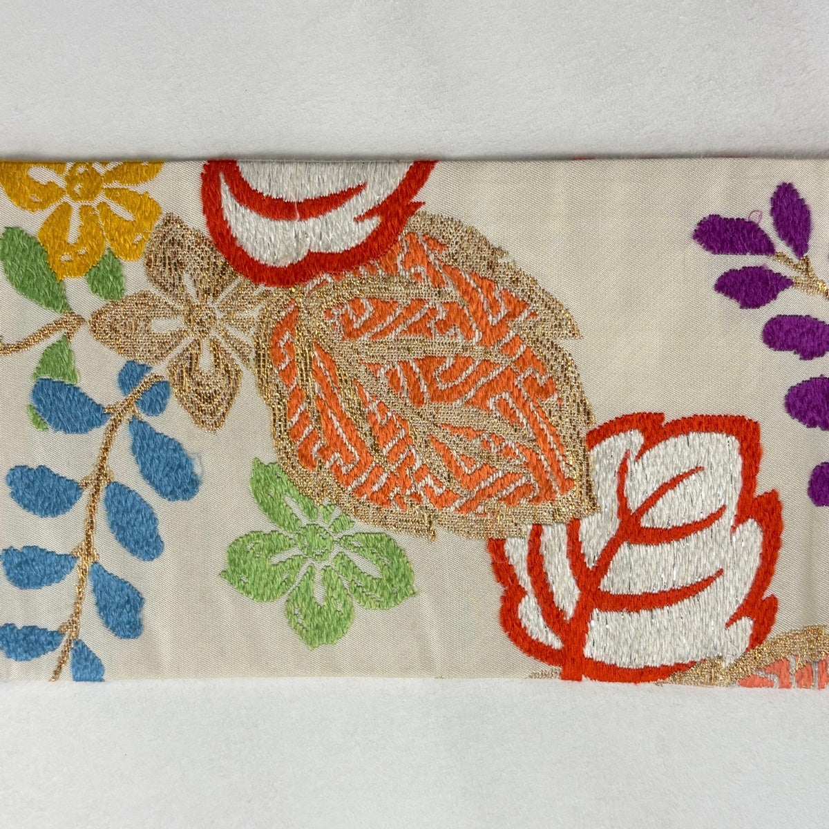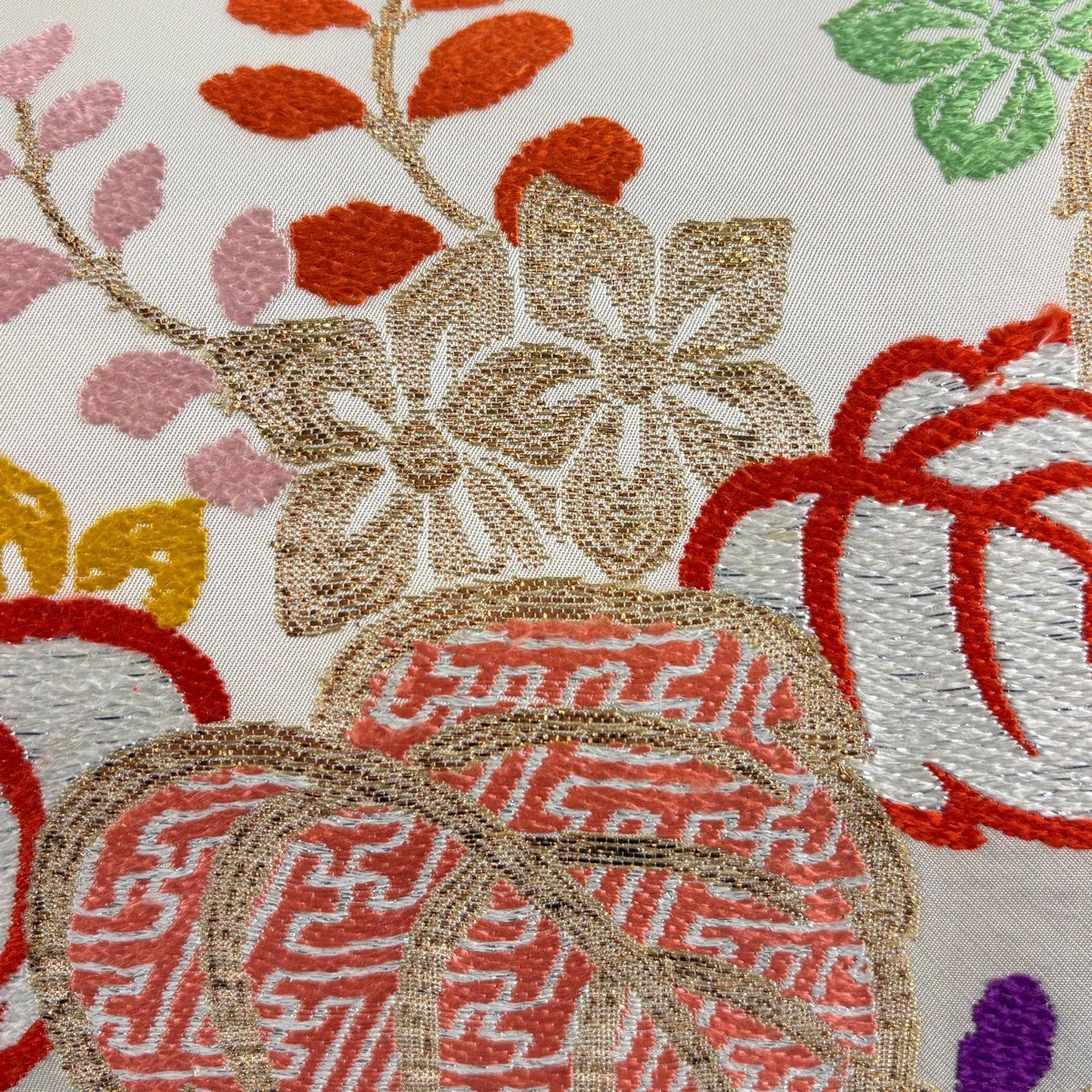 袋帯 秀品 関西仕立て 花丸文 亀甲 箔 唐織 クリーム 六通 正絹