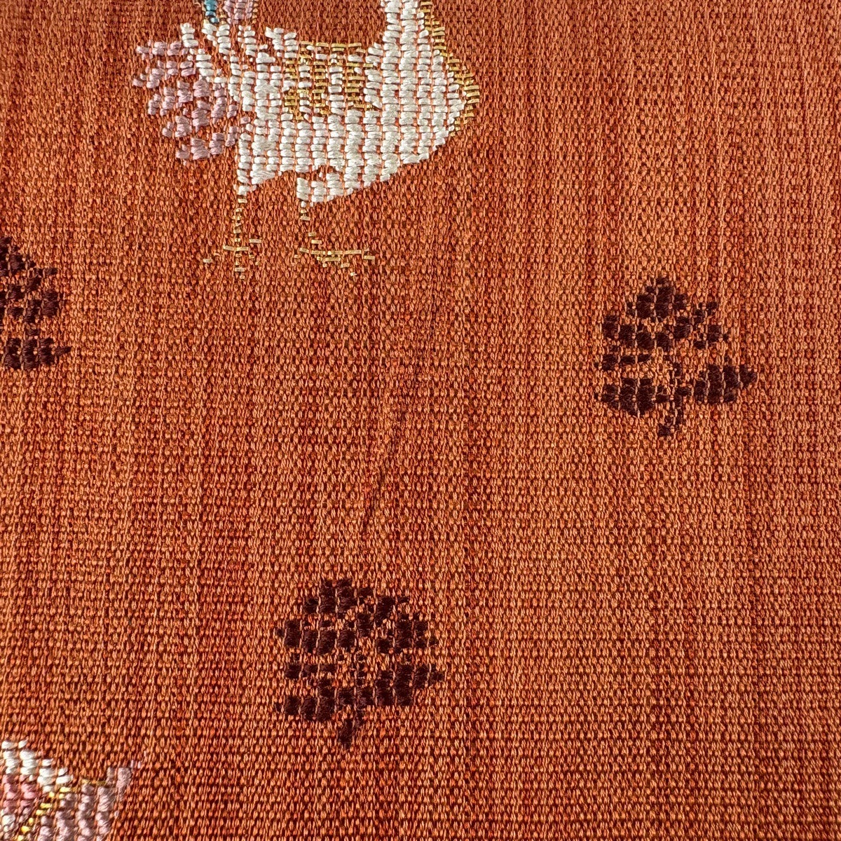 【美品】 袋帯 秀品 孔雀 草花 箔 オレンジ 六通 正絹