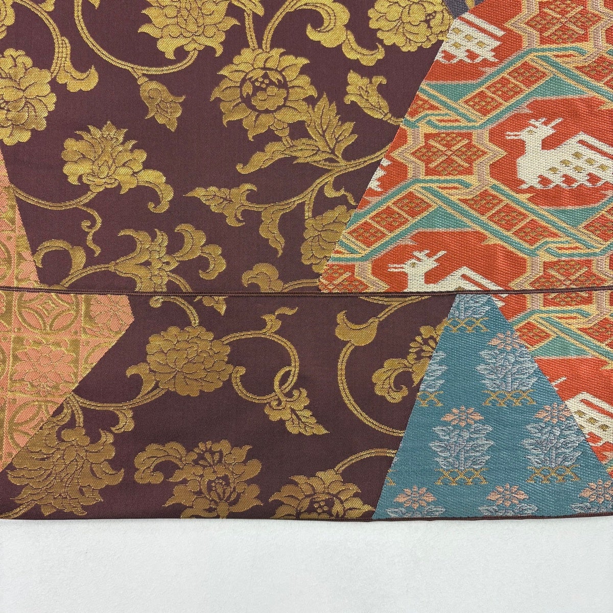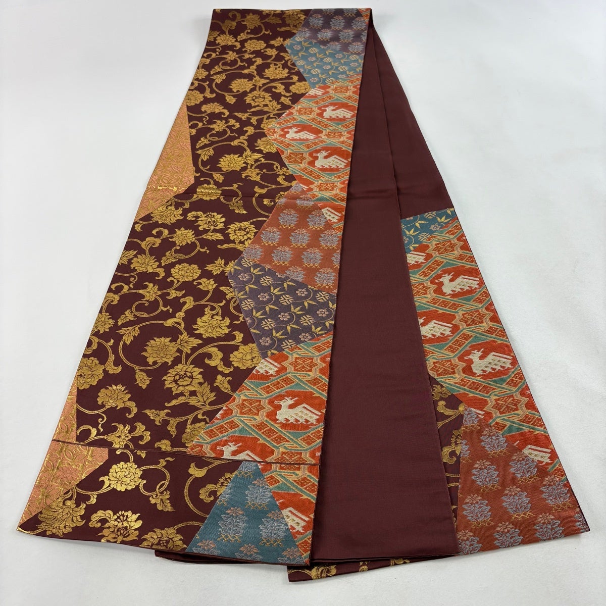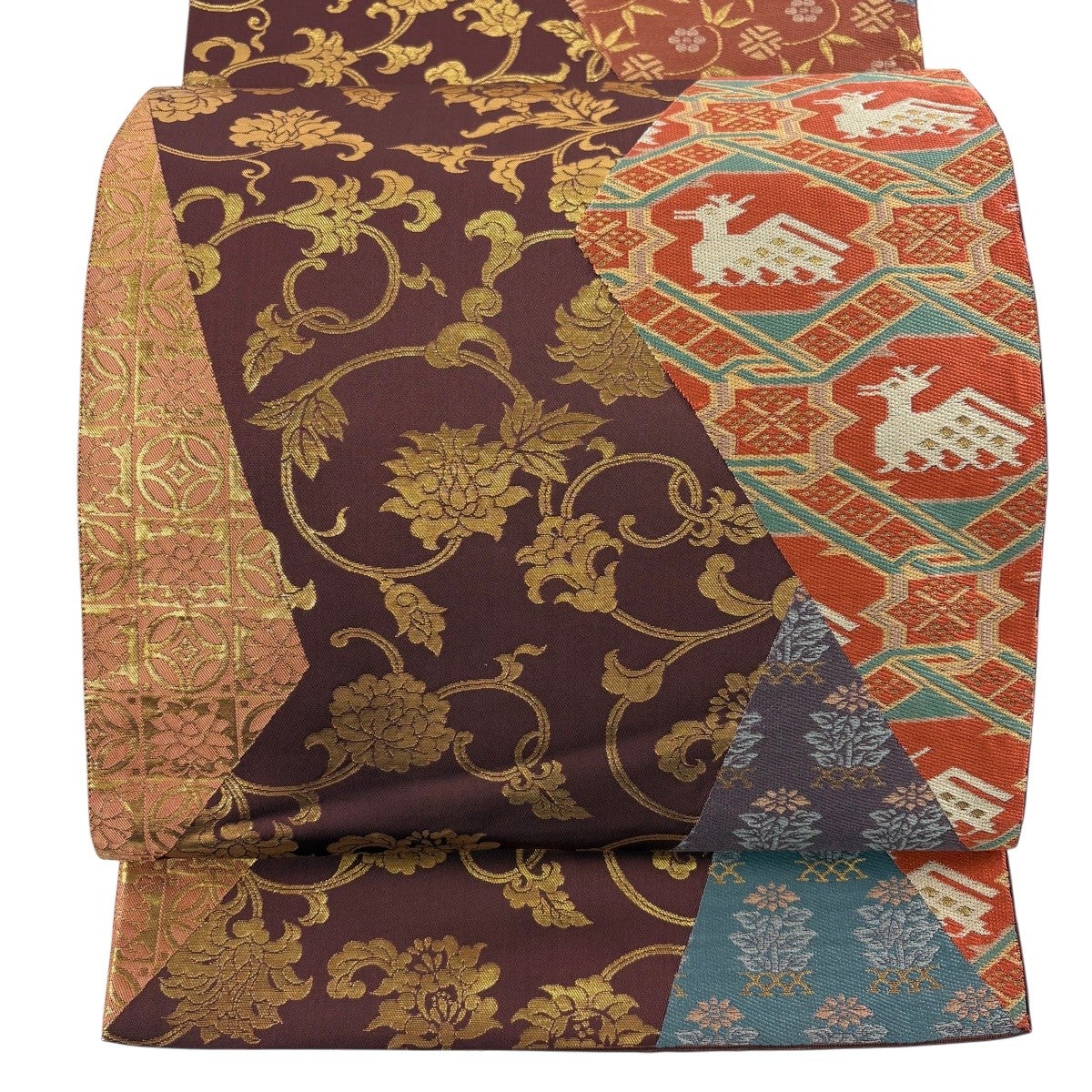 袋帯 秀品 関西仕立て 丸文 草花 金糸 箔 焦茶色 六通 正絹