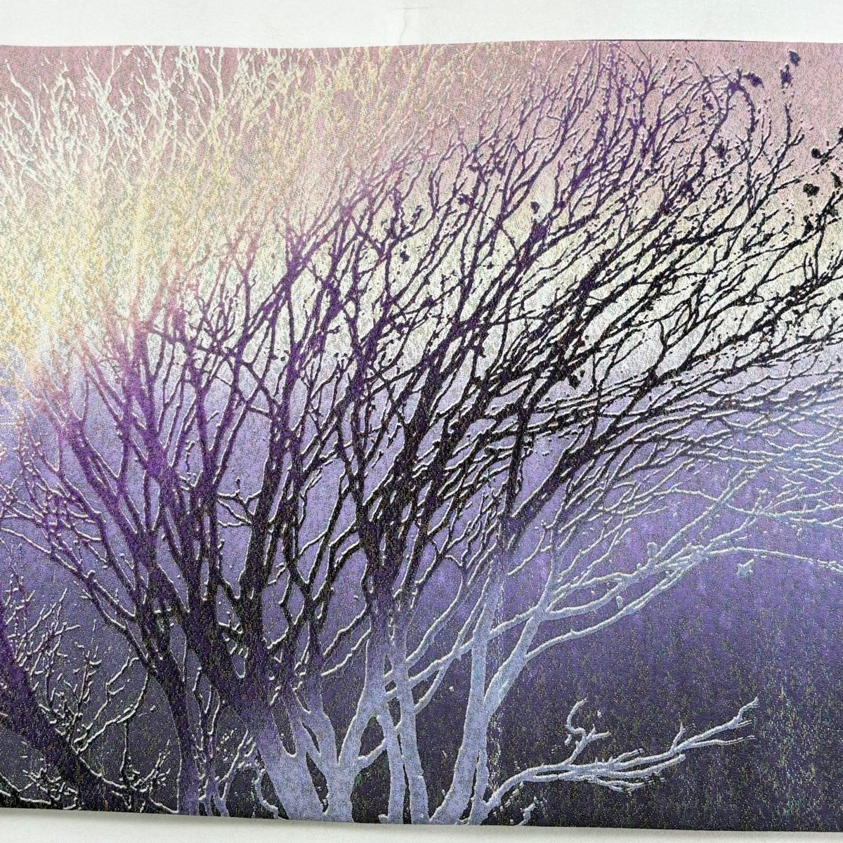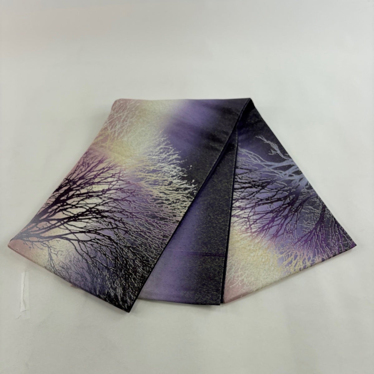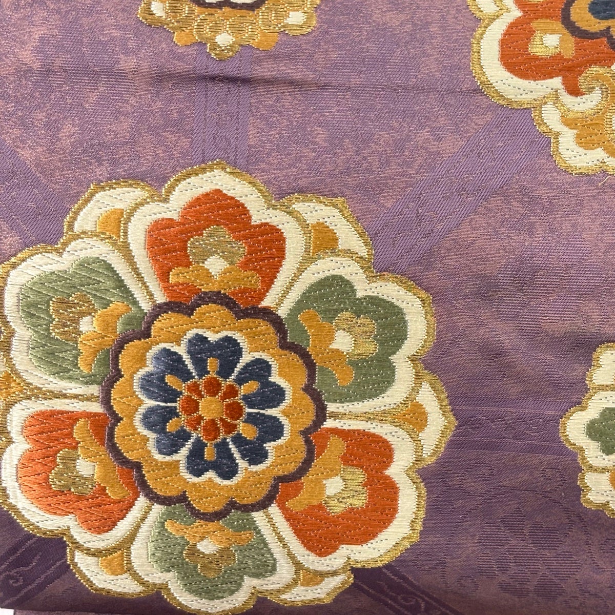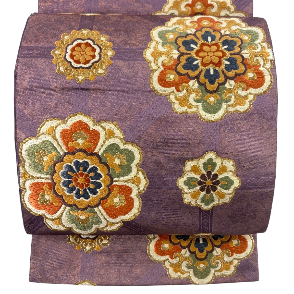 【美品】 袋帯 逸品 じゅらく 落款あり 帝王紫 花 扇面 刺繍 箔 銀色 六通 正絹