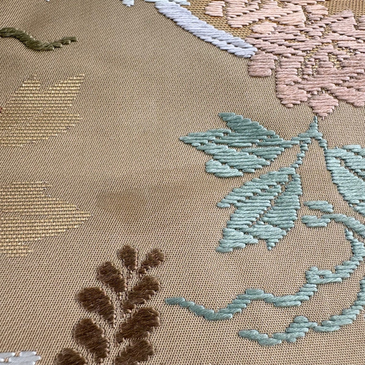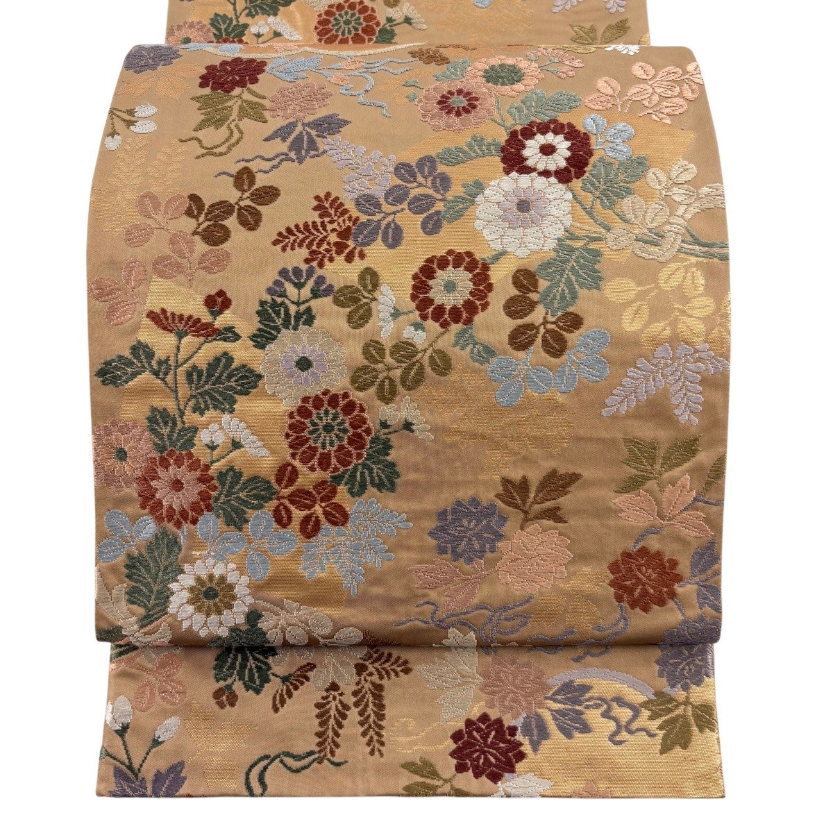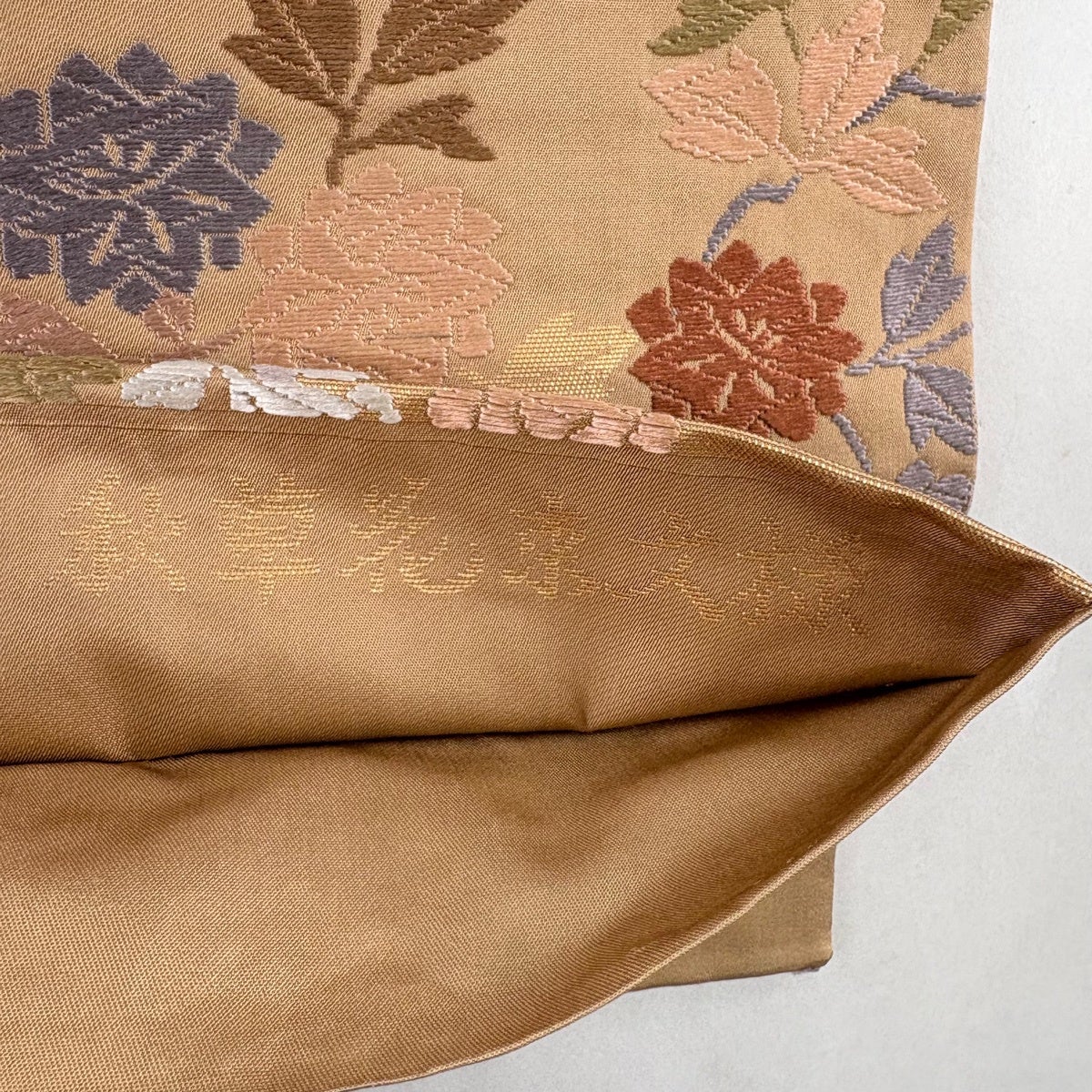 袋帯 秀品 秋草文 扇面 唐織 箔 薄茶色 六通 正絹