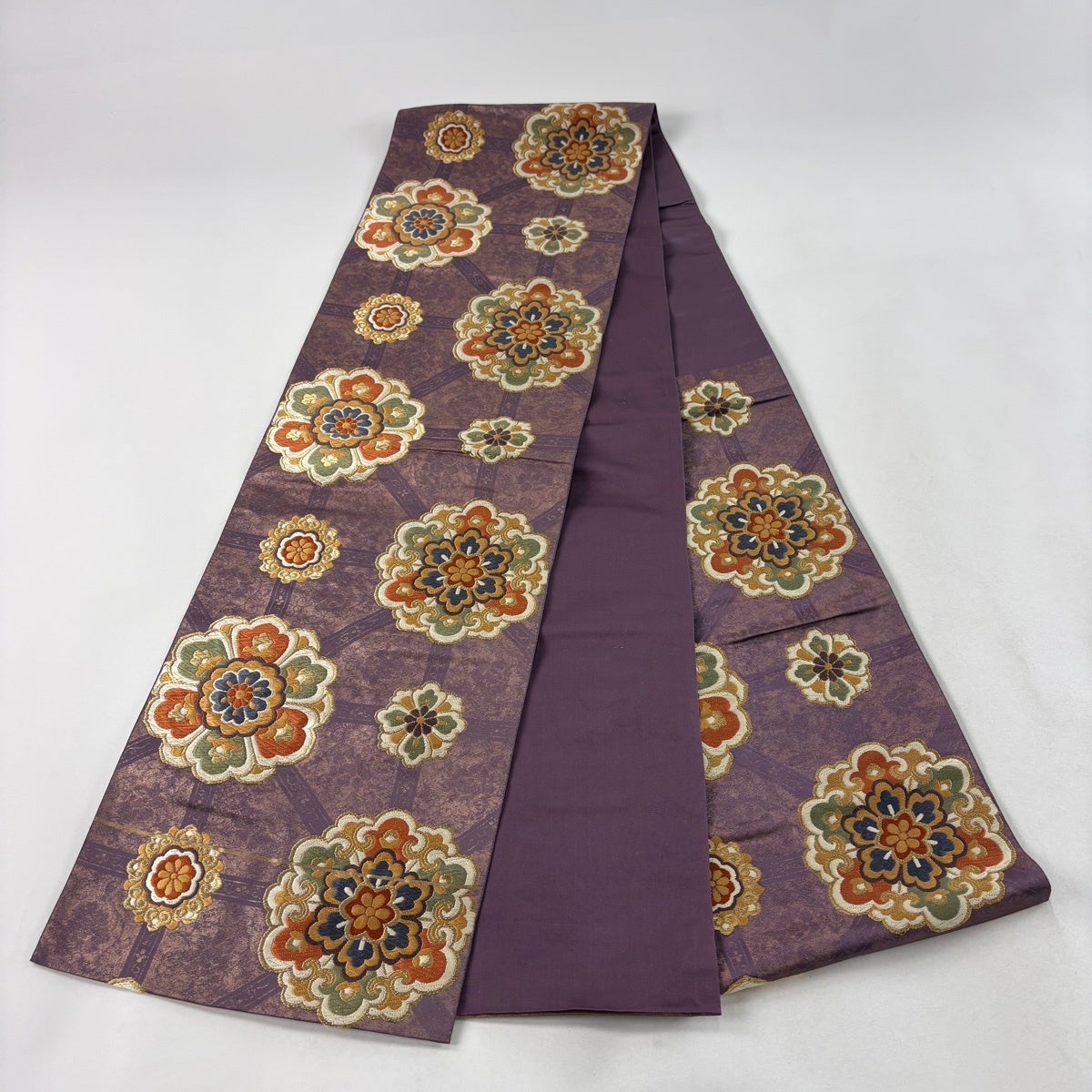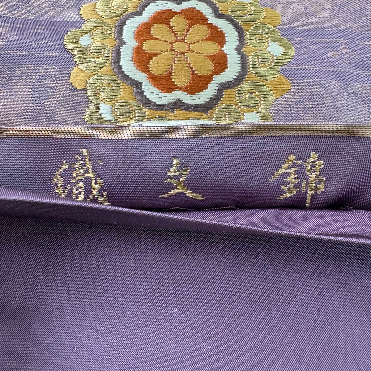 袋帯 秀品 夏帯 菊 流水 金糸 灰紫 お太鼓柄 正絹