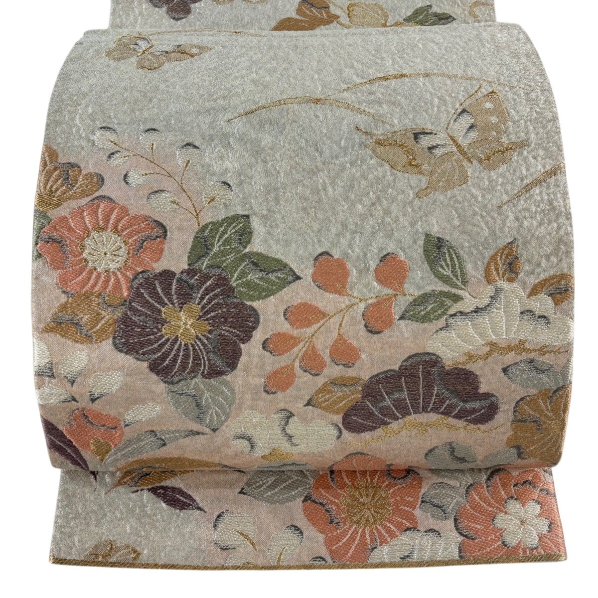 名古屋帯 秀品 牡丹 雲文 金銀彩 箔 灰白 正絹